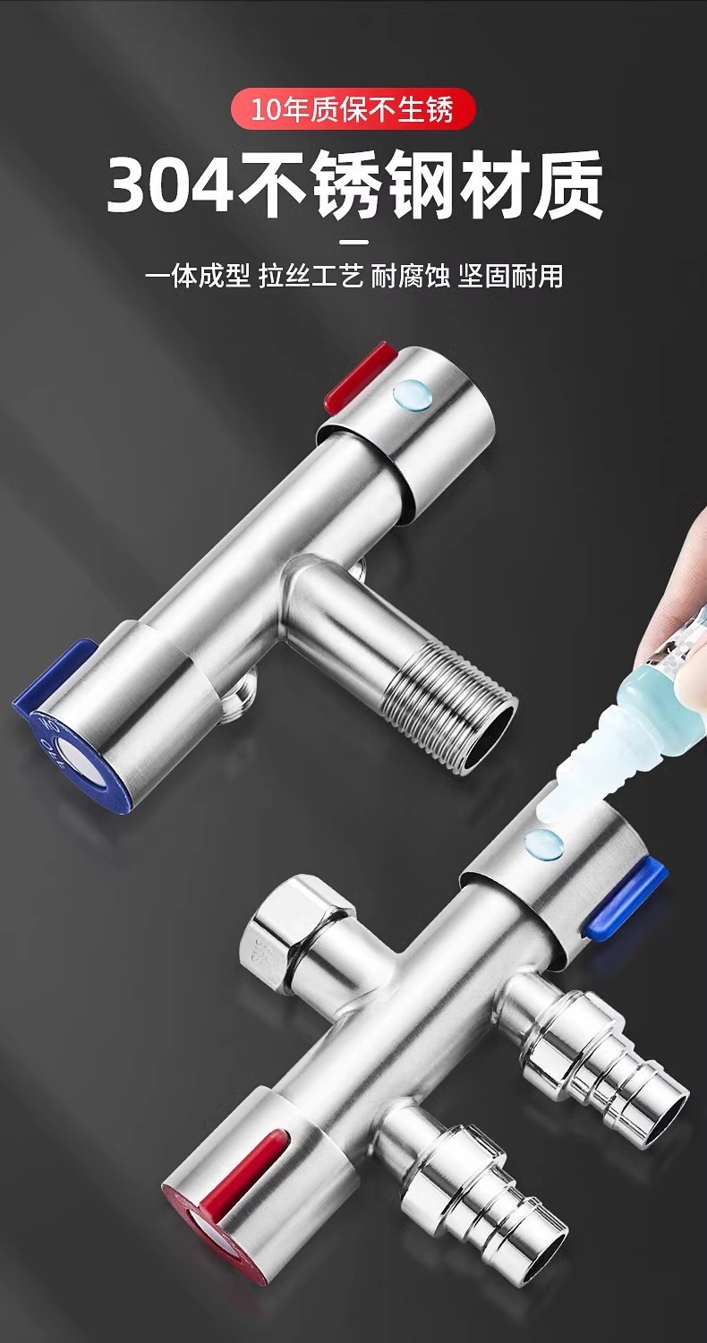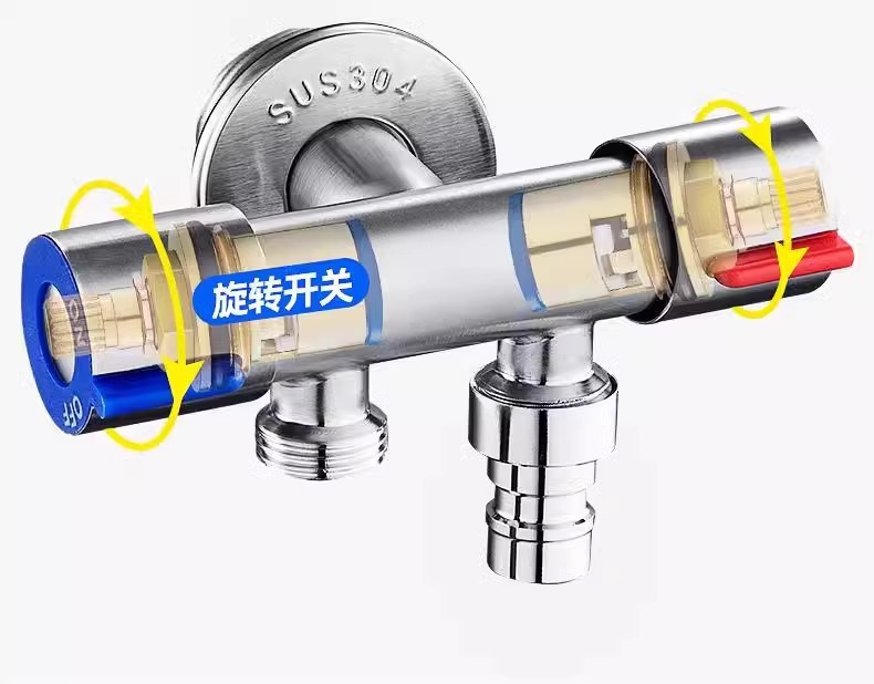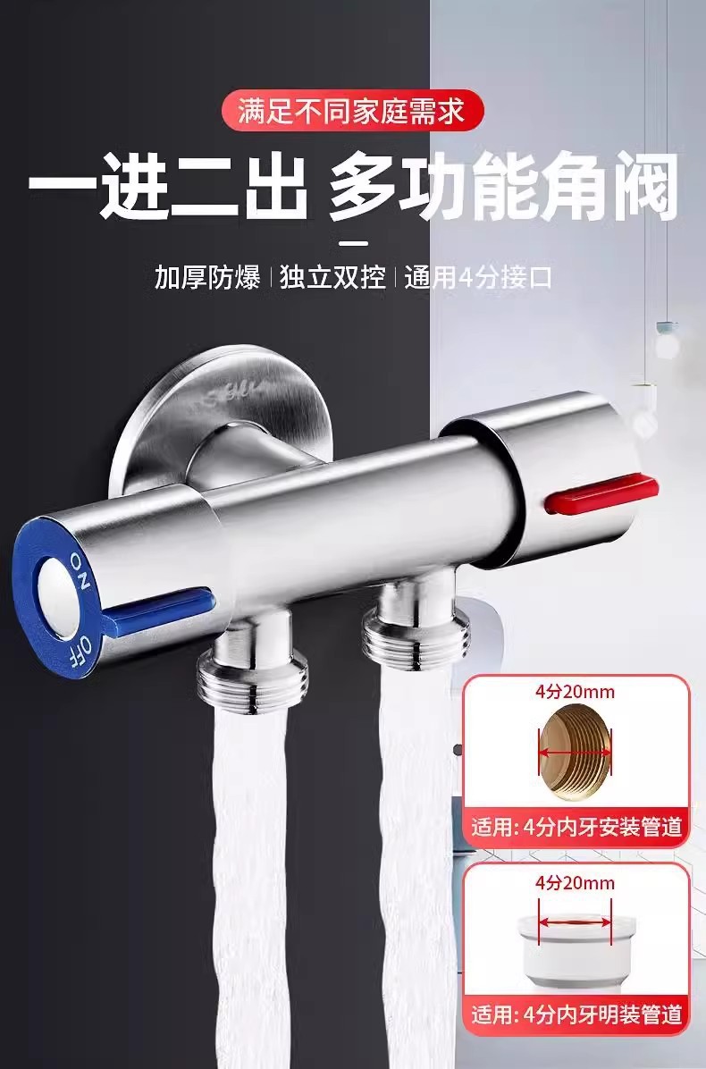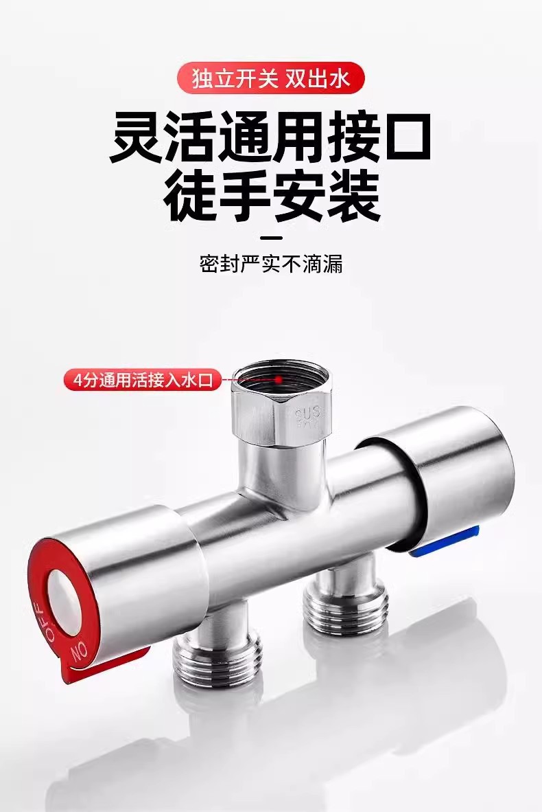 304 스테인레스 스틸 이중 제어 각도 밸브 1 인 2 아웃 3 방향 물 분배 밸브 수도꼭지 1 인 2 아웃 물 분배 장치 스위치