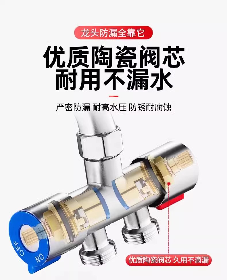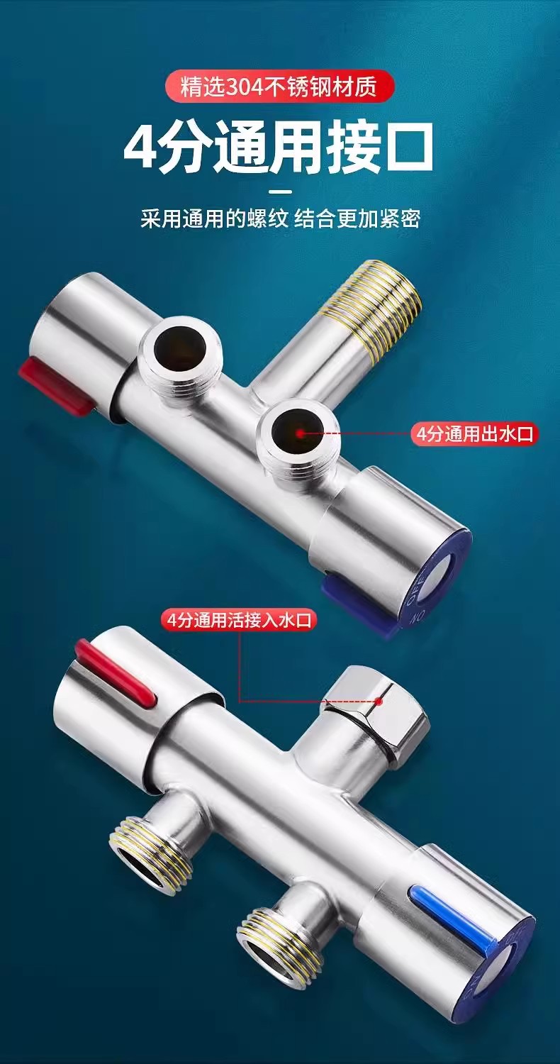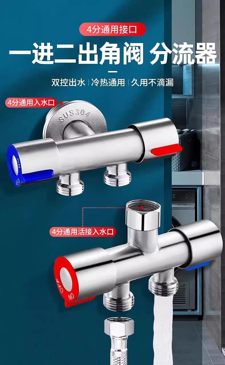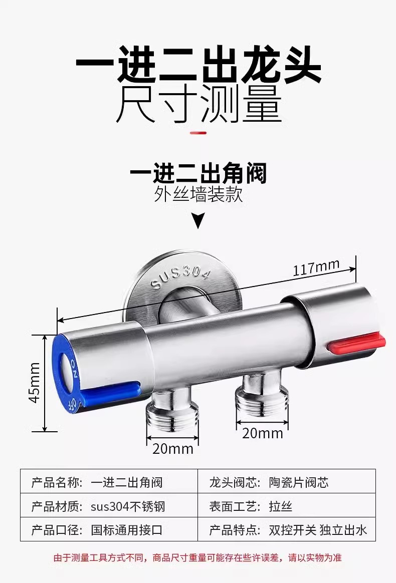 304 스테인레스 스틸 이중 제어 각도 밸브 1 인 2 아웃 3 방향 물 분배 밸브 수도꼭지 1 인 2 아웃 물 분배 장치 스위치