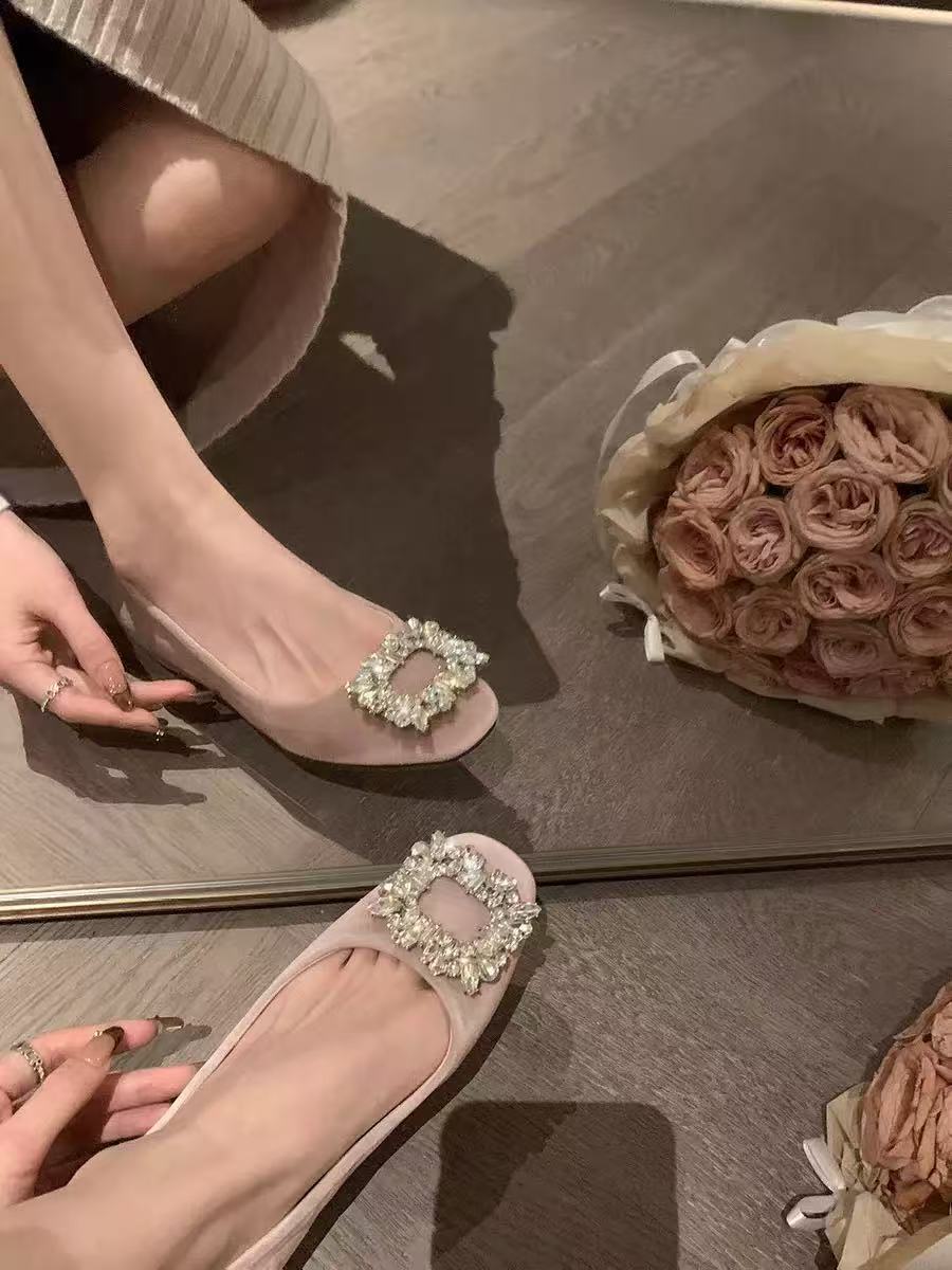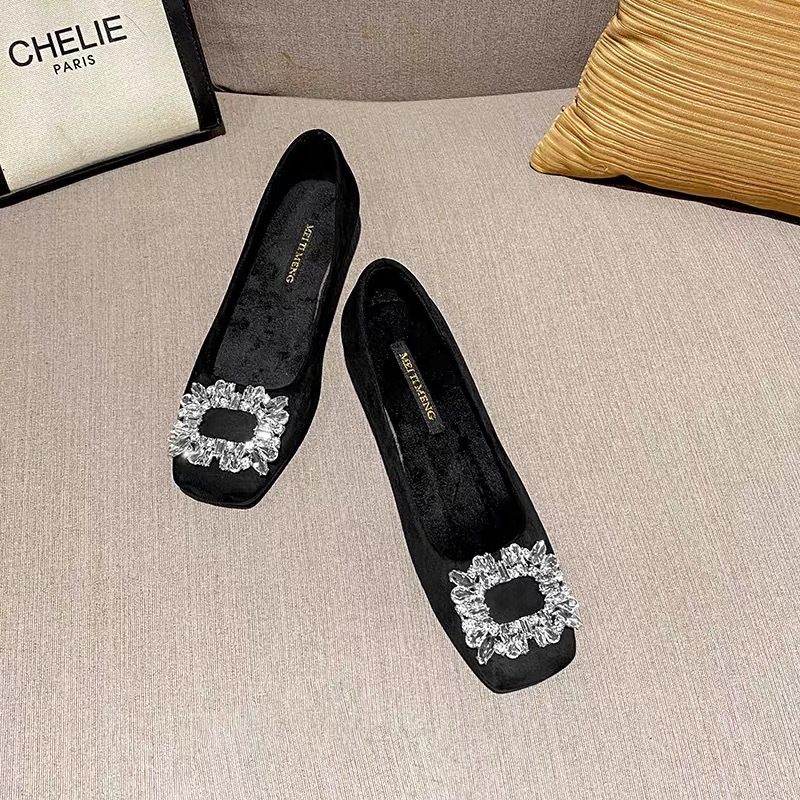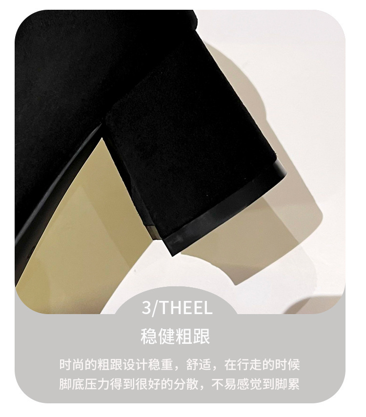 블랙 스웨이드 통근 하이힐 여성 2025 년 봄과 가을 새 광장 발가락 두꺼운 힐 얕은 입 라인스톤 전문 프랑스 싱글 신발스토어 가기