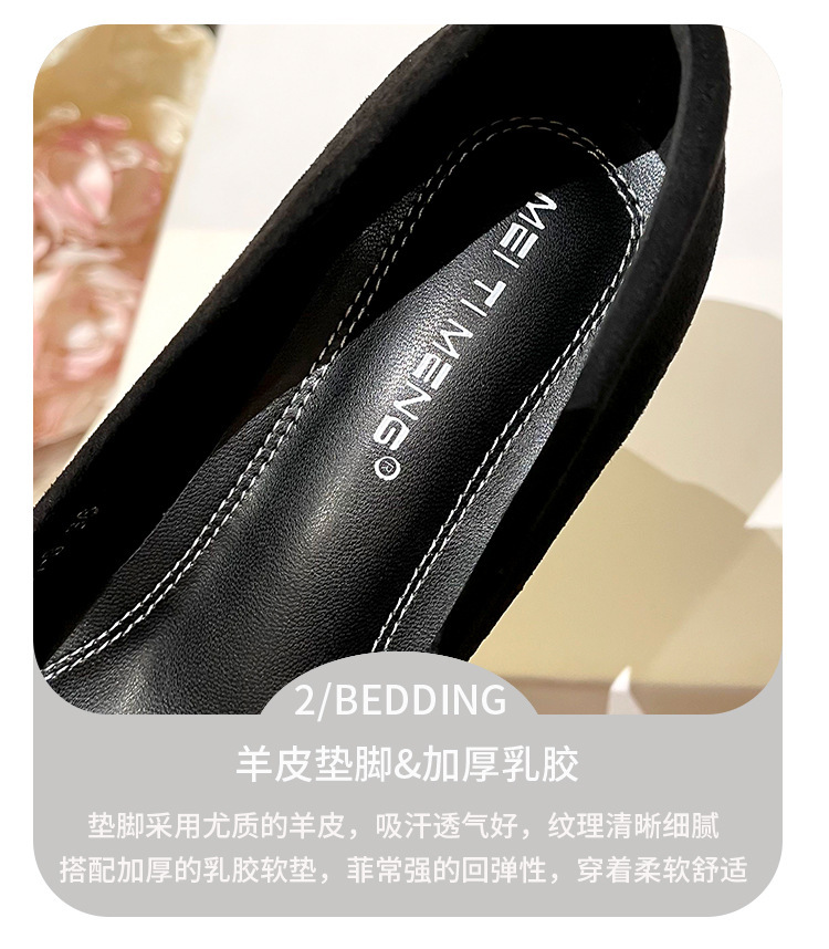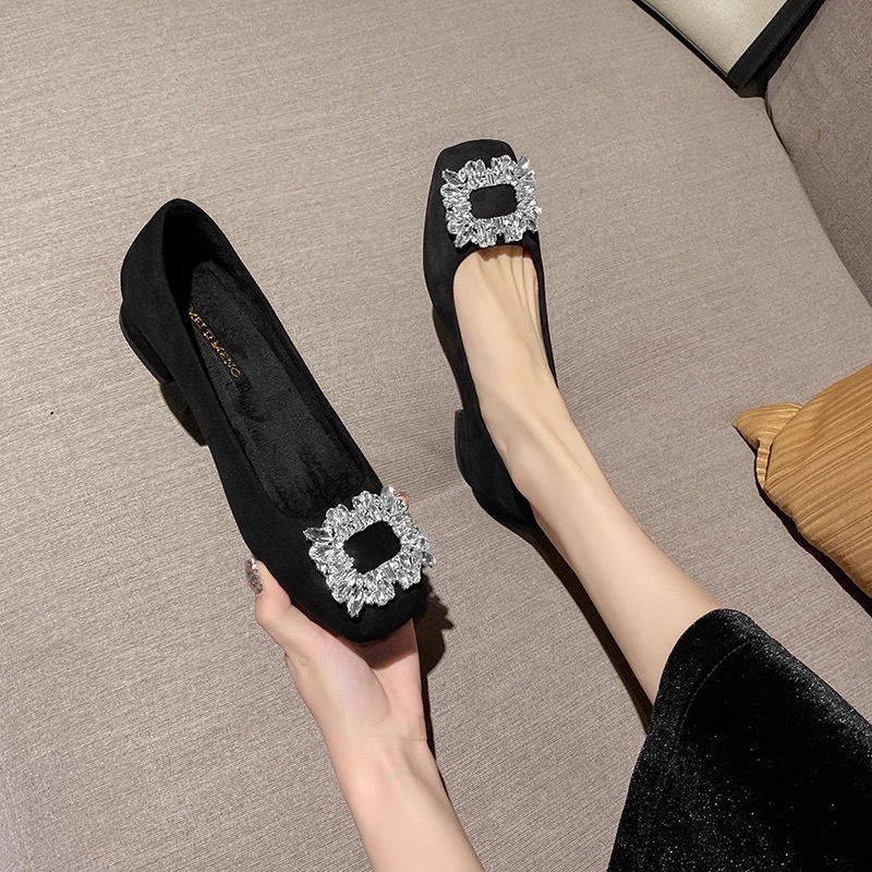 블랙 스웨이드 통근 하이힐 여성 2025 년 봄과 가을 새 광장 발가락 두꺼운 힐 얕은 입 라인스톤 전문 프랑스 싱글 신발