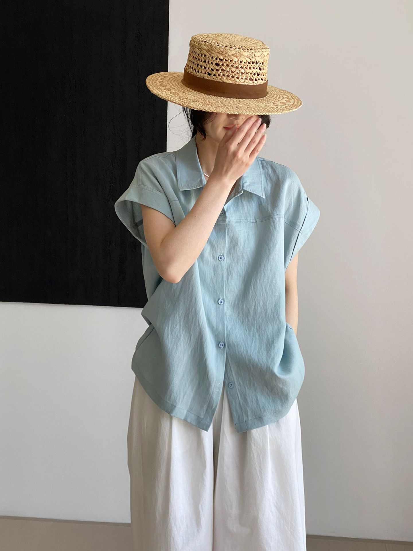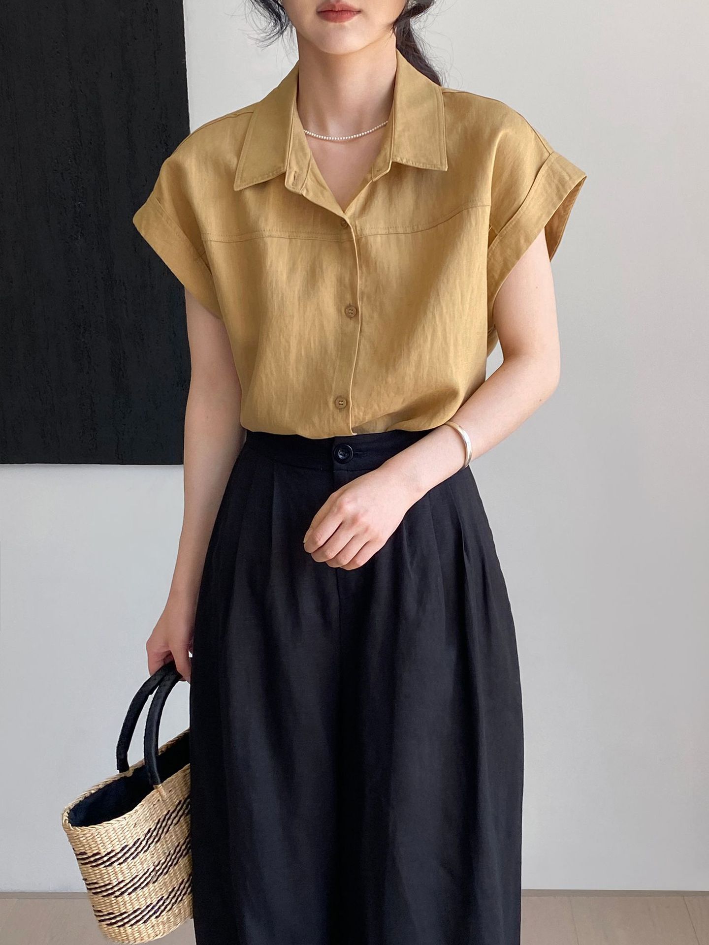 한국식 텐셀 리넨 심플 옷깃 싱글 브레스트 셔츠 여자 통근 우아한 올매치 쇼트 탑 6073