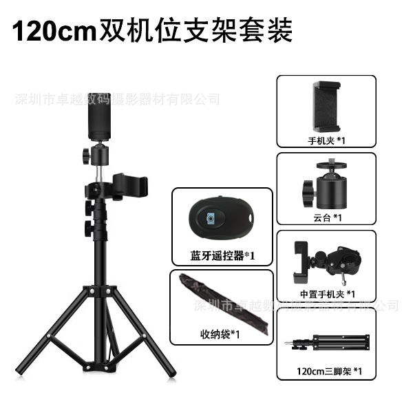 • 1.2m 일반 삼각대 + 휴대폰 클립 + 블루투스 리모컨 (듀얼 카메라 위치)