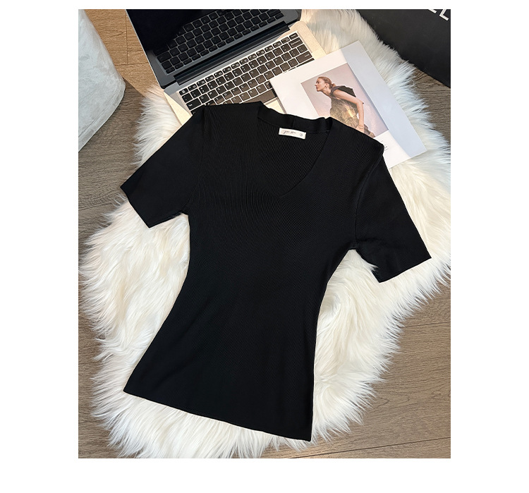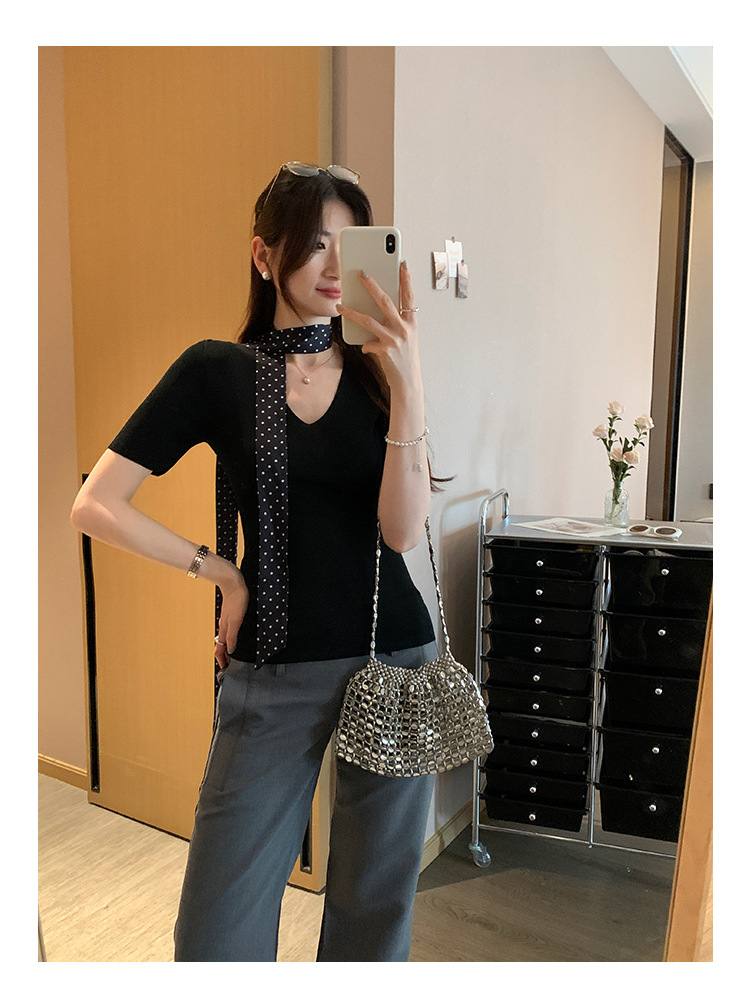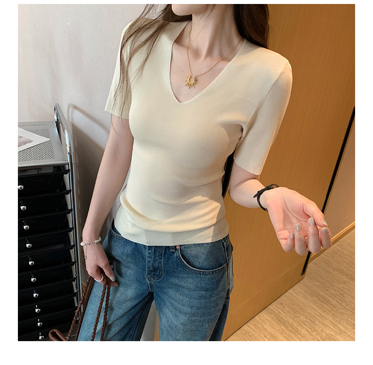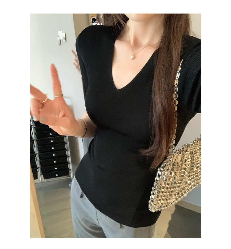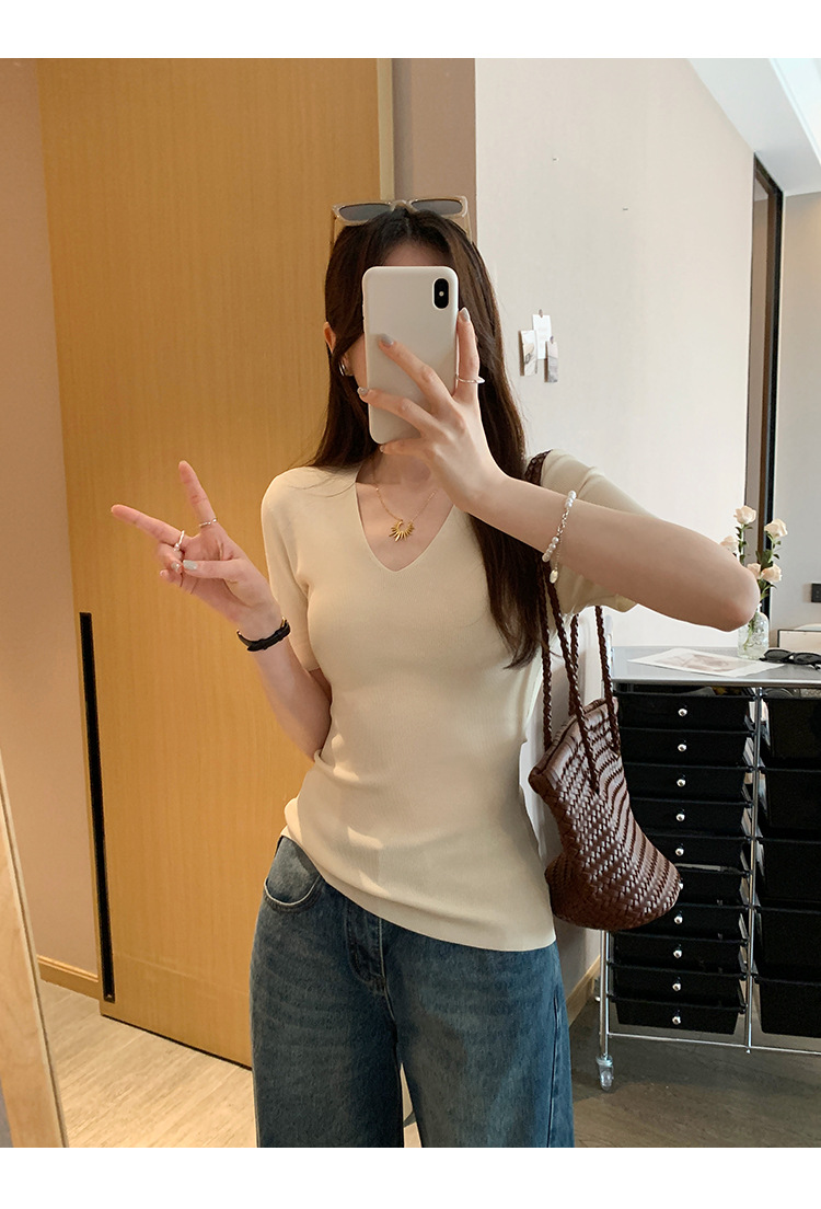 세련된 V넥 슬림 핏 반팔 스웨터 여성 2025 년 여름 새로운 하이 엔드 노 범프 슈퍼 잘 생긴 탑