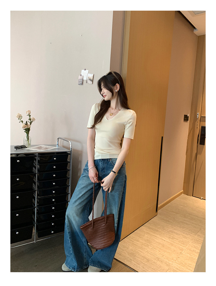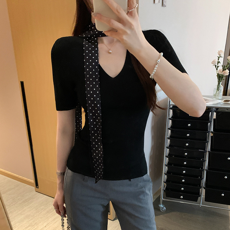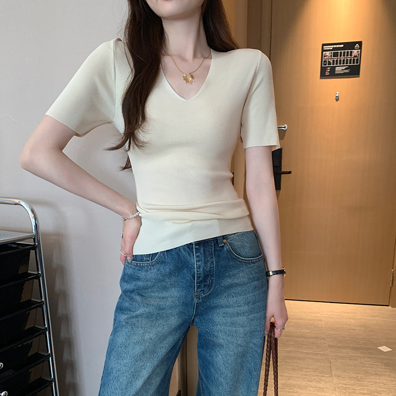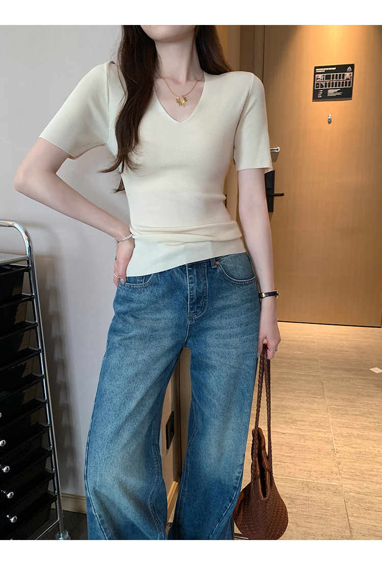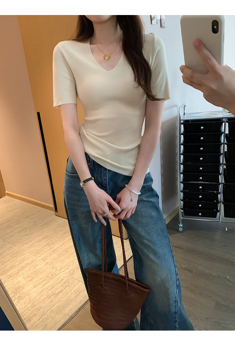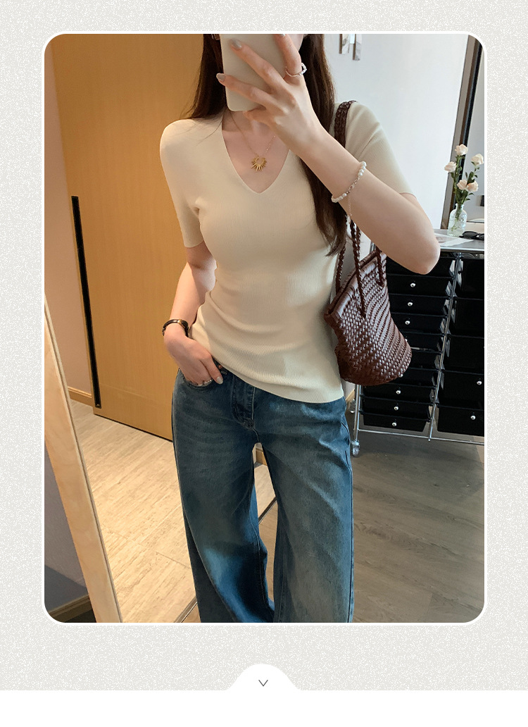 세련된 V넥 슬림 핏 반팔 스웨터 여성 2025 년 여름 새로운 하이 엔드 노 범프 슈퍼 잘 생긴 탑스토어 가기