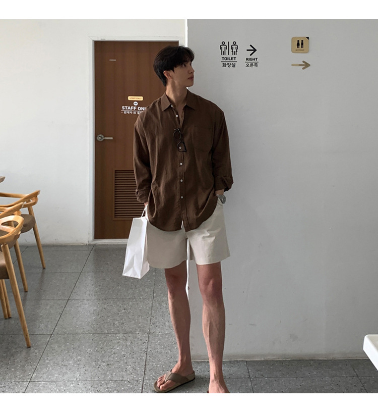 살구색 리넨 작업복 반바지 남자 여름 트렌디 브랜드 일본 스포츠 5 점 바지 한국식 올매치 스트레이트 캐주얼 바지스토어 가기