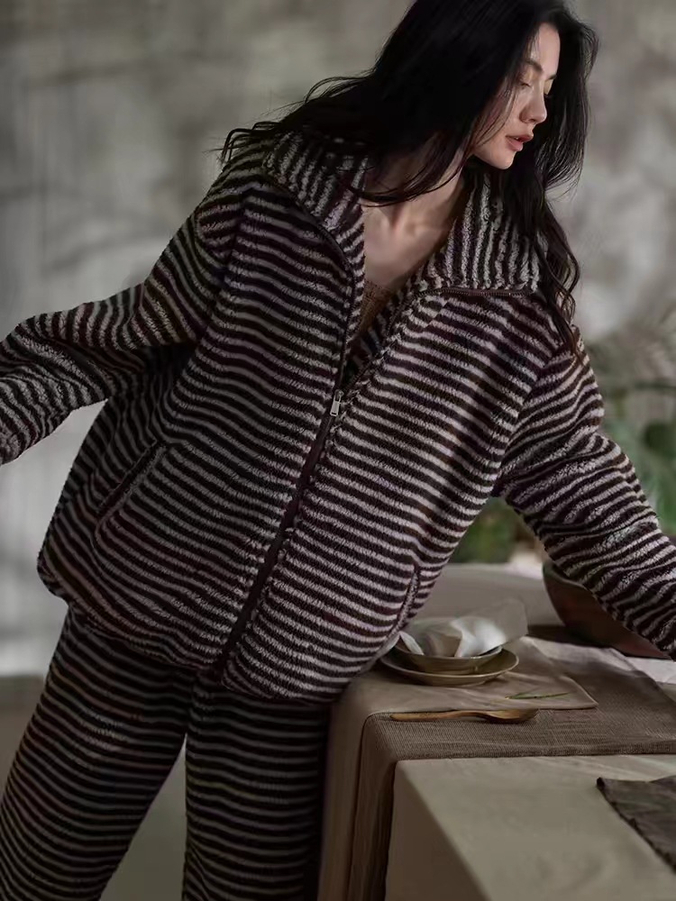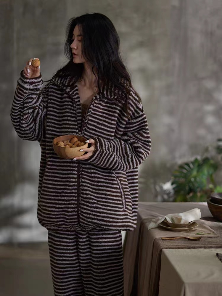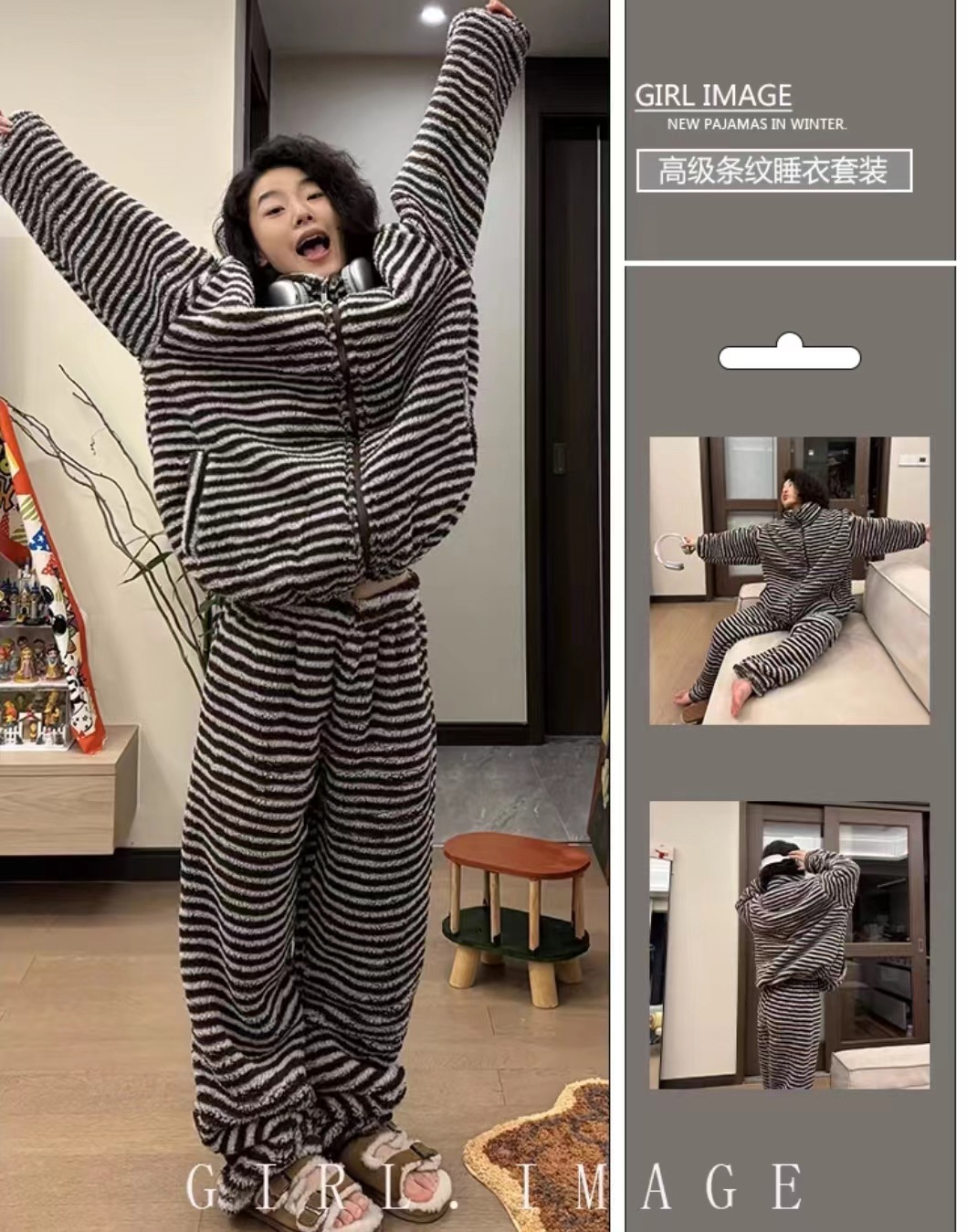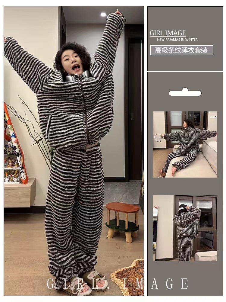 2025 잠옷 여성 가을, 겨울 새로운 플란넬 가정 의류 산호 벨벳 두꺼운 벨벳 지퍼 따뜻한 의류 세트