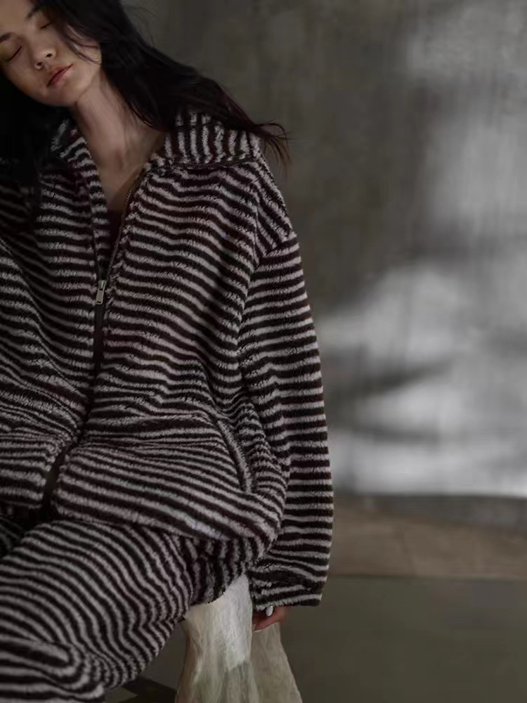 • 패션 스트라이프 스탠드 칼라 지퍼 가디건