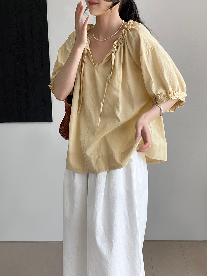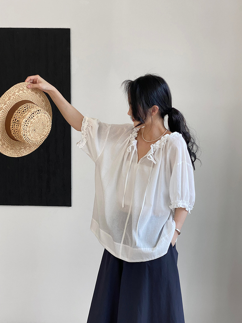 그런 다음 한국 스타일 부드러운 V-넥 드로스트링 레이스 느슨한 작은 셔츠 여성용 틈새 귀 레이스 짧은 소매 셔츠 C3290