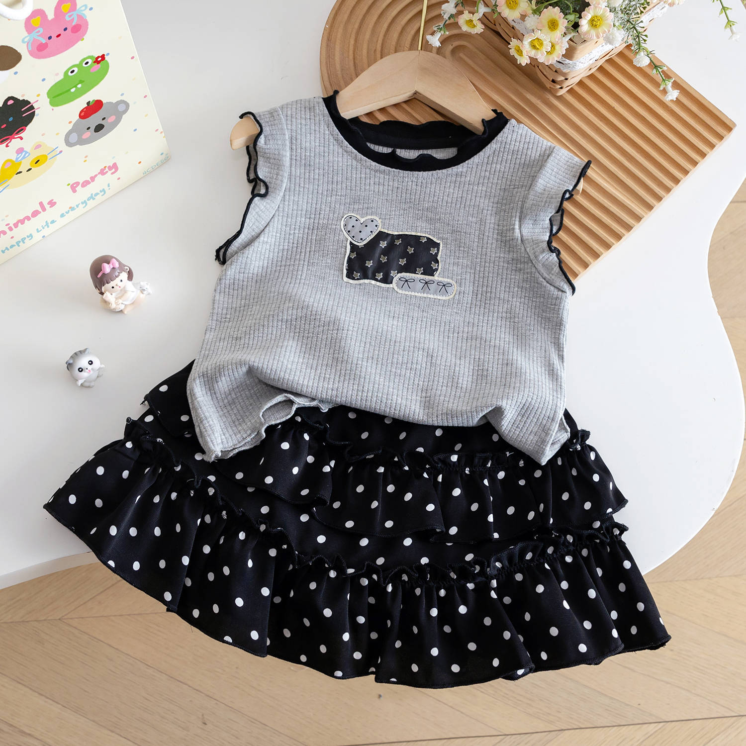 [재고] 여아 여름옷, 패셔너블한 아동복, 여아 조끼, 티셔츠 + 도트무늬 바지와 스커트, 투피스 여름옷, 신상품스토어 가기
