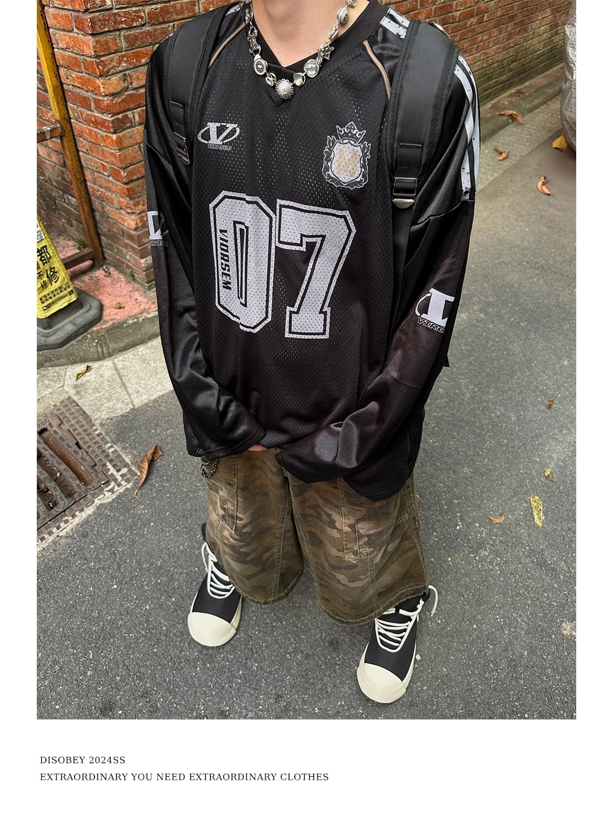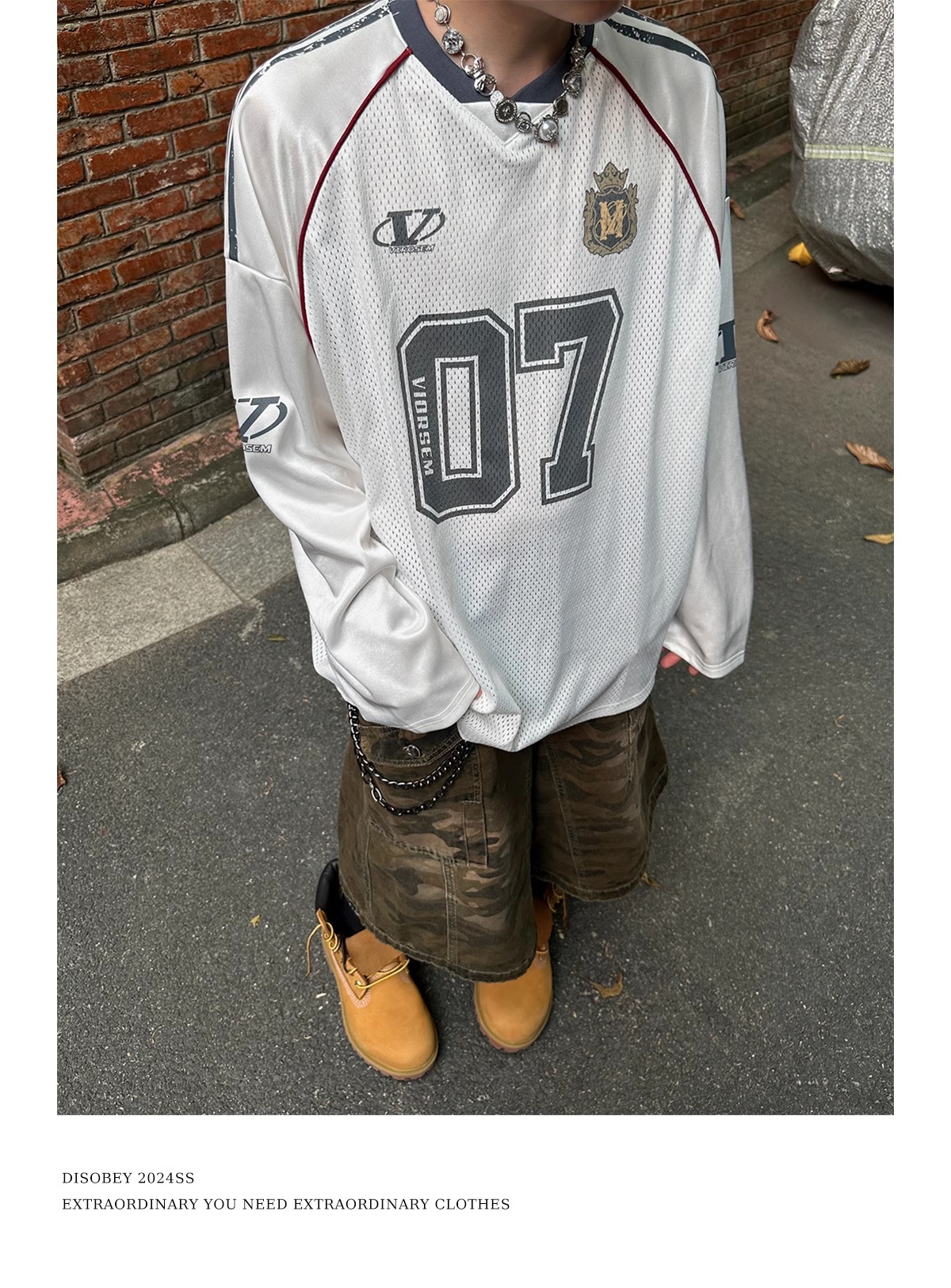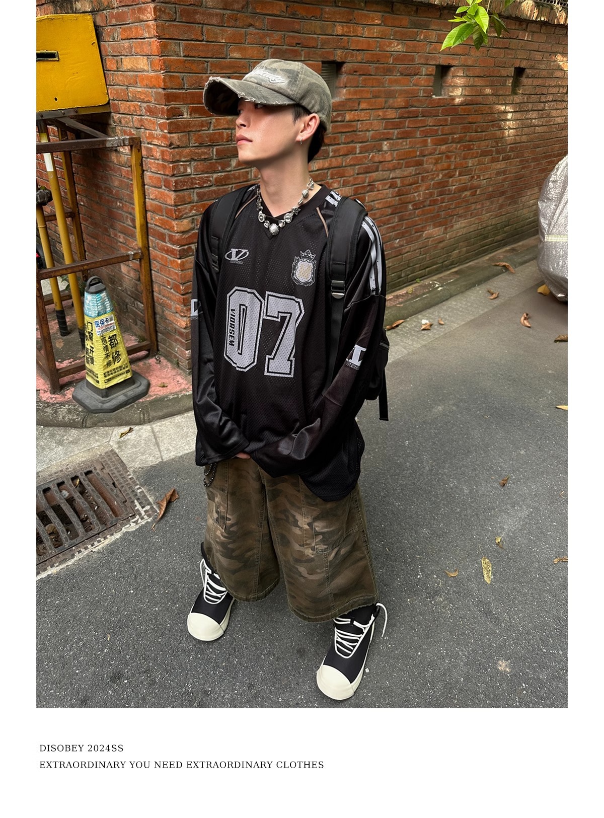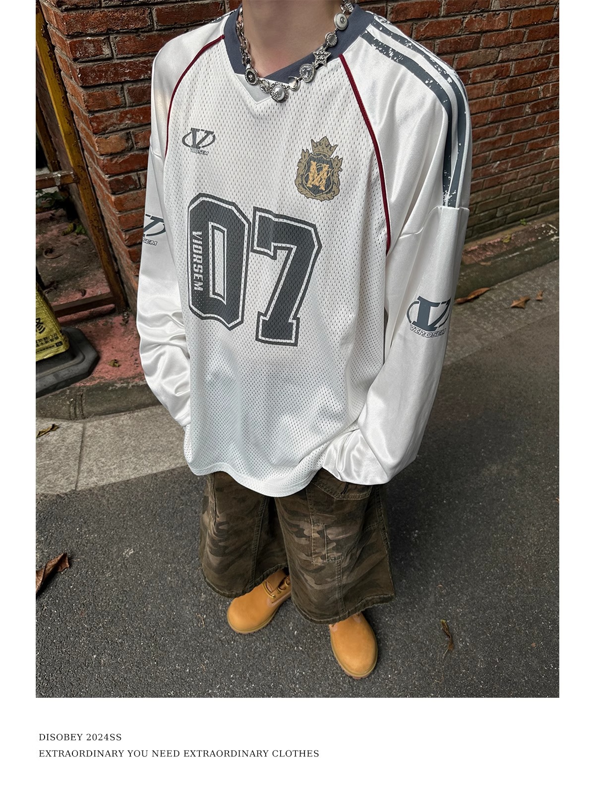 아메리칸 스타일 레트로 레터 프린트 메쉬 긴팔 티셔츠 남자 여름 뉴 니치 스트리트 올 매치 루즈 저지 트렌디