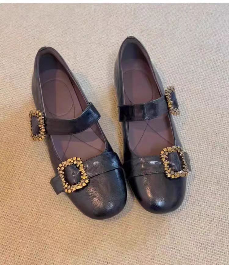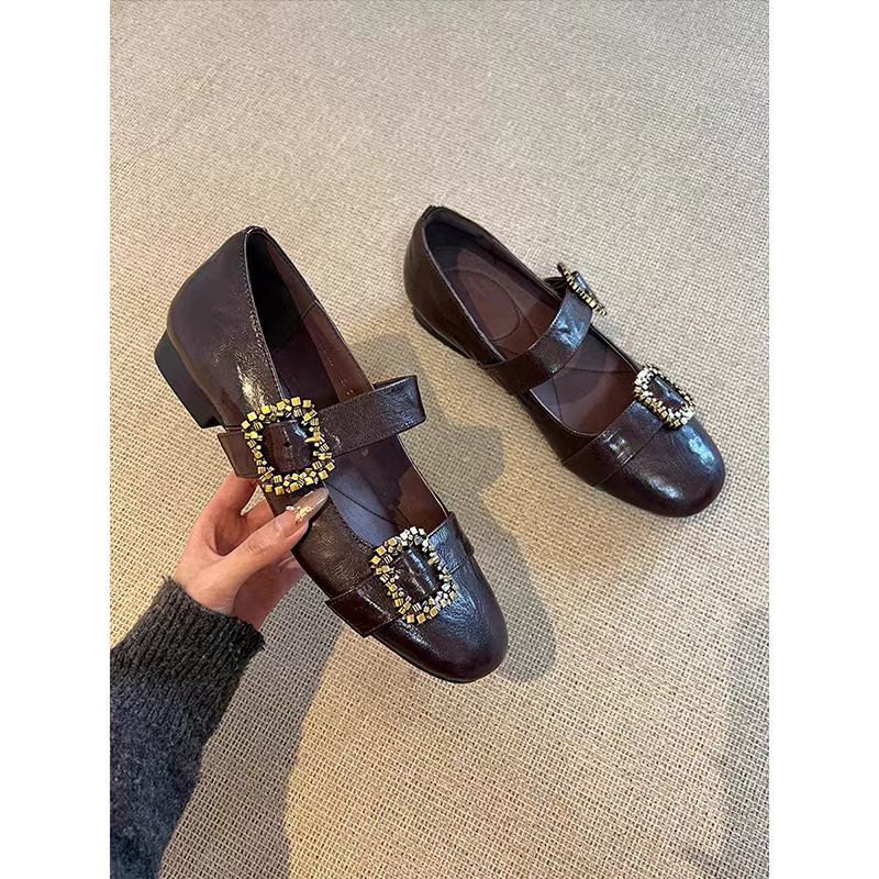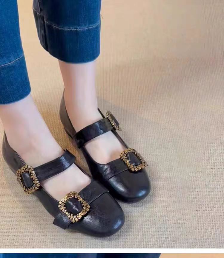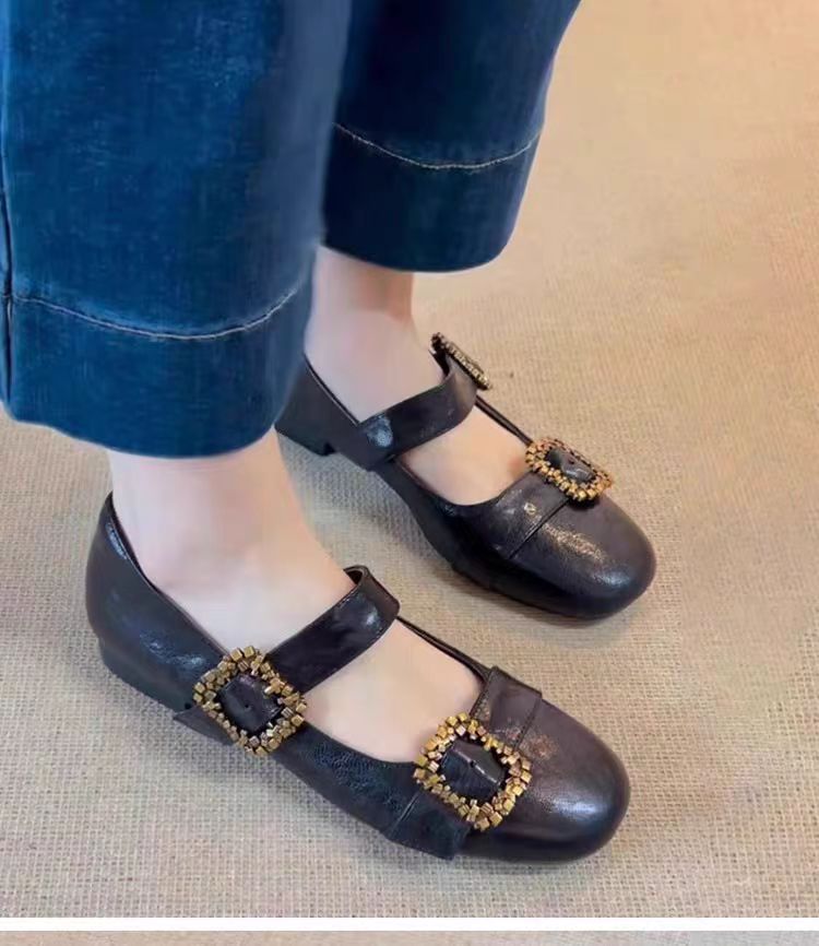 여성용 천연 양가죽 신발, 천연 가죽 디자인, 메탈 사각 버클, 얕은 앞코, 플랫 바닥, 메리제인 스타일, 여성용 다용도 패션스토어 가기