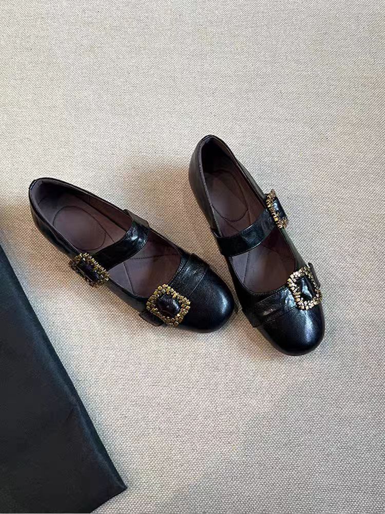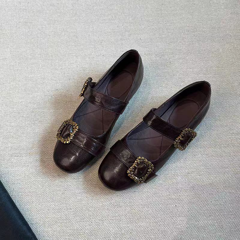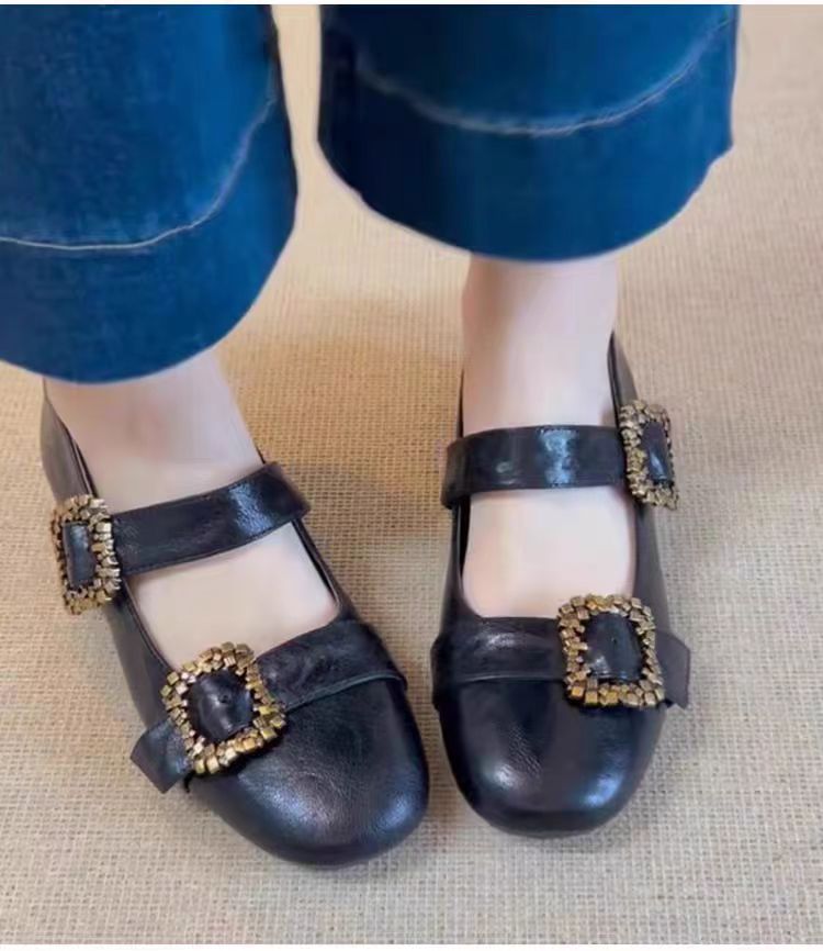 여성용 천연 양가죽 신발, 천연 가죽 디자인, 메탈 사각 버클, 얕은 앞코, 플랫 바닥, 메리제인 스타일, 여성용 다용도 패션