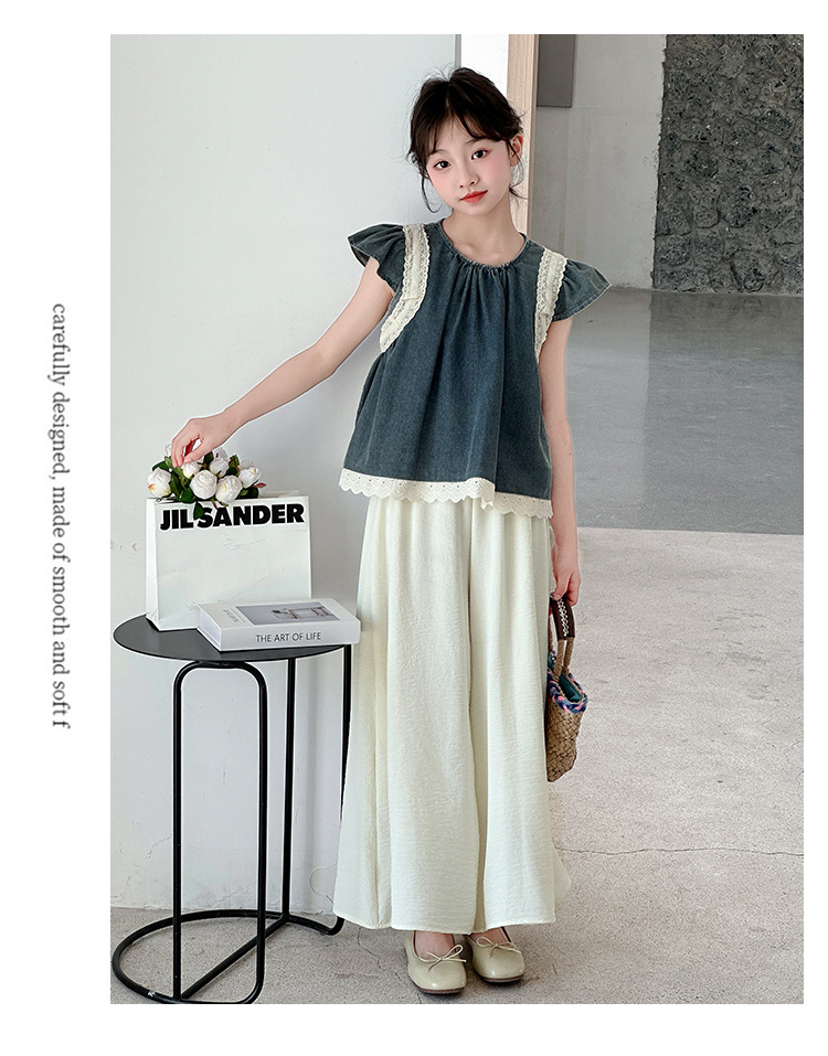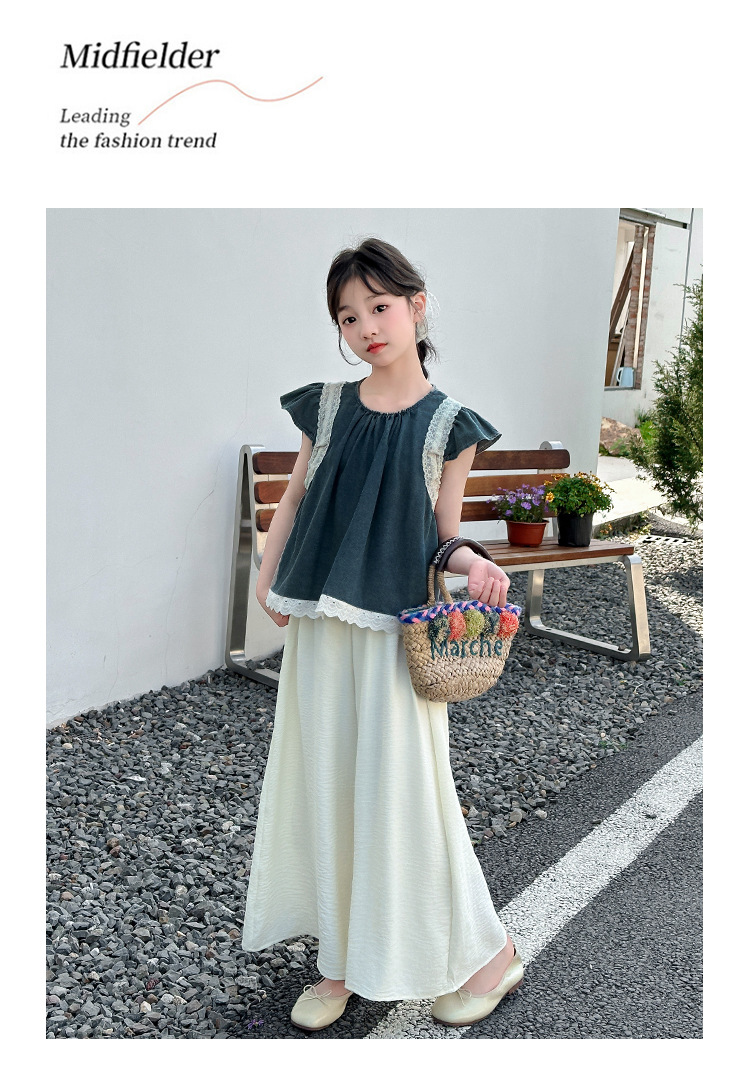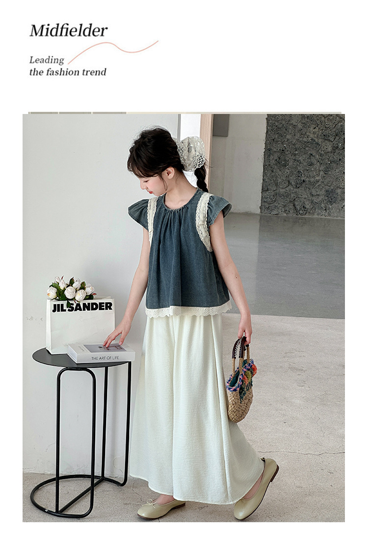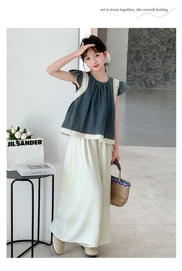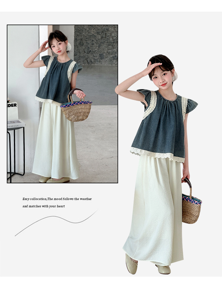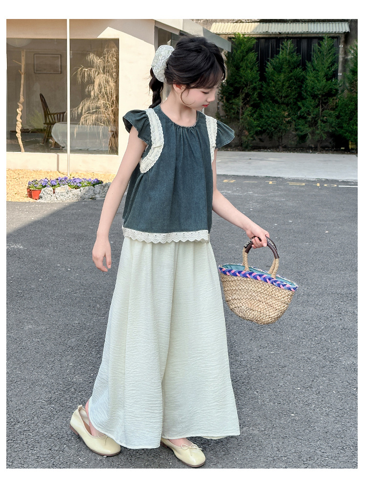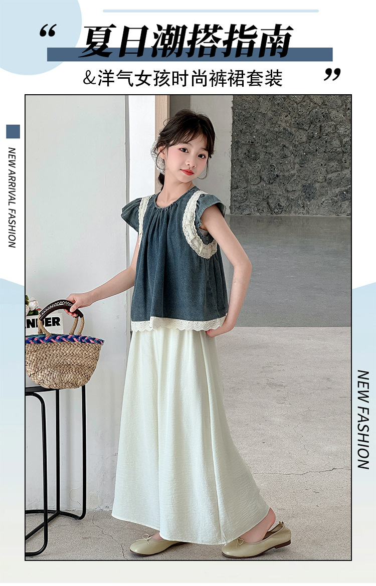 여자 여름 세트 2025 새로운 여자 서양식 플라잉 슬리브 탑 어린이 한국 느슨한 바지 스커트 투피스 세트