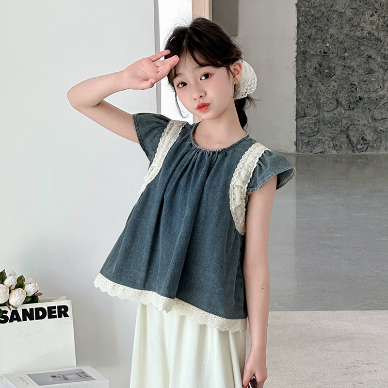 여자 여름 세트 2025 새로운 여자 서양식 플라잉 슬리브 탑 어린이 한국 느슨한 바지 스커트 투피스 세트스토어 가기