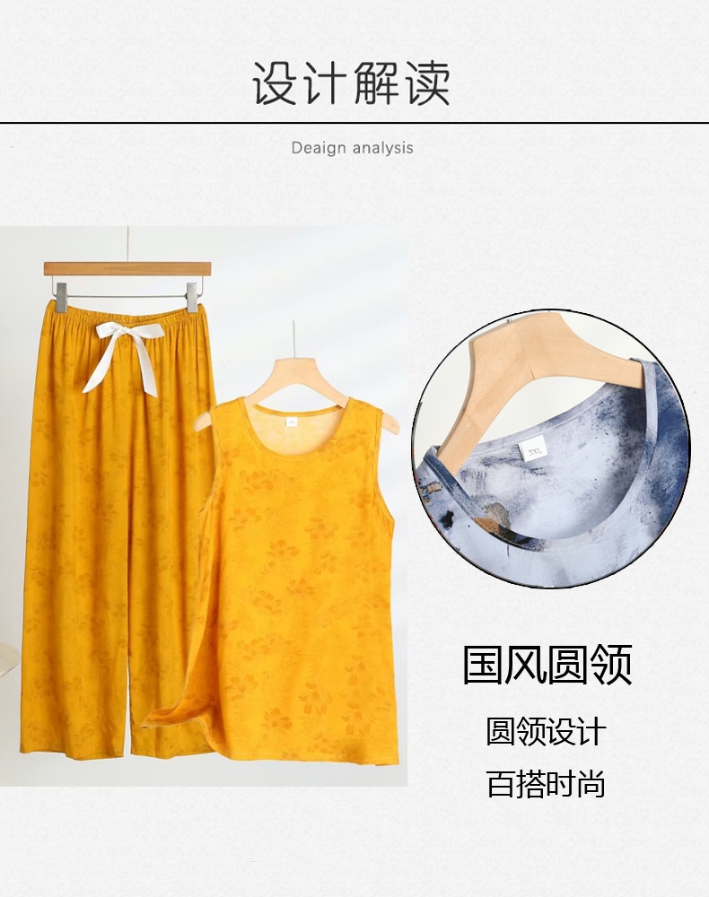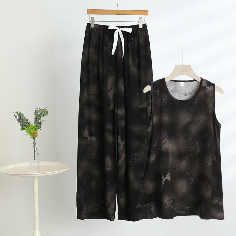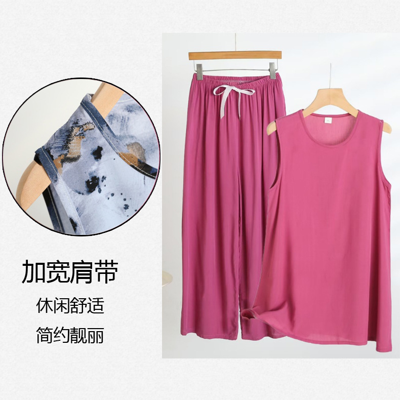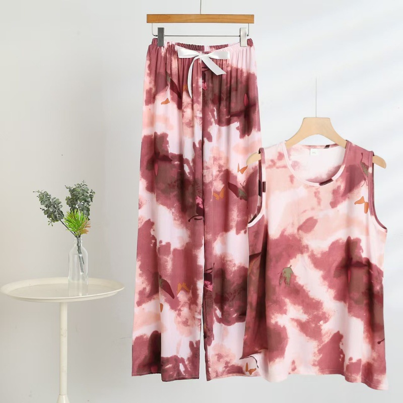 코튼 실크 파자마 여성의 여름 새로운 민소매 조끼 와이드 레그 팬츠 2 피스 넥타이 염색 인공면 의상 홈 의류