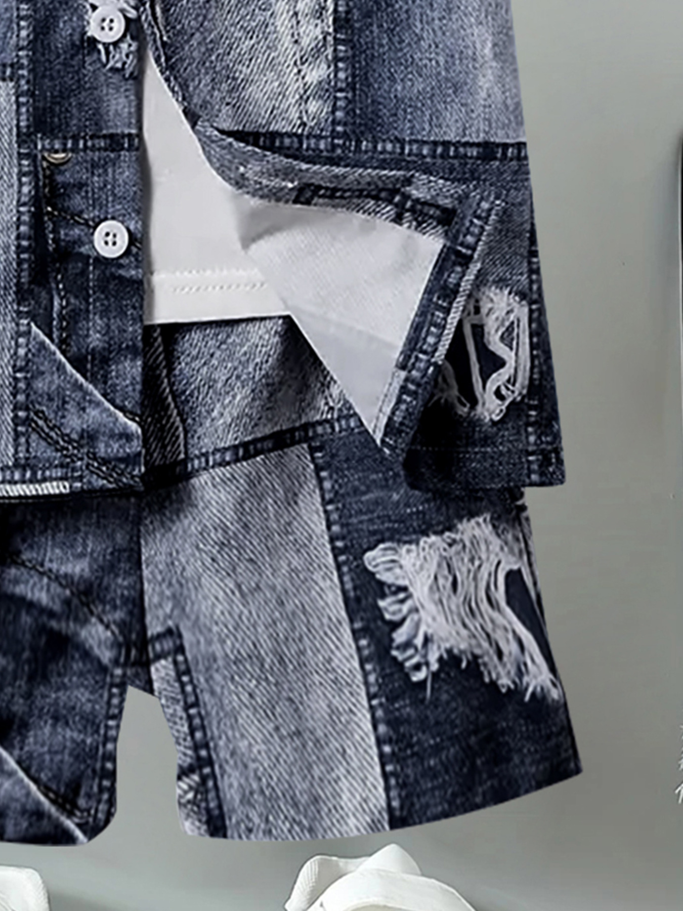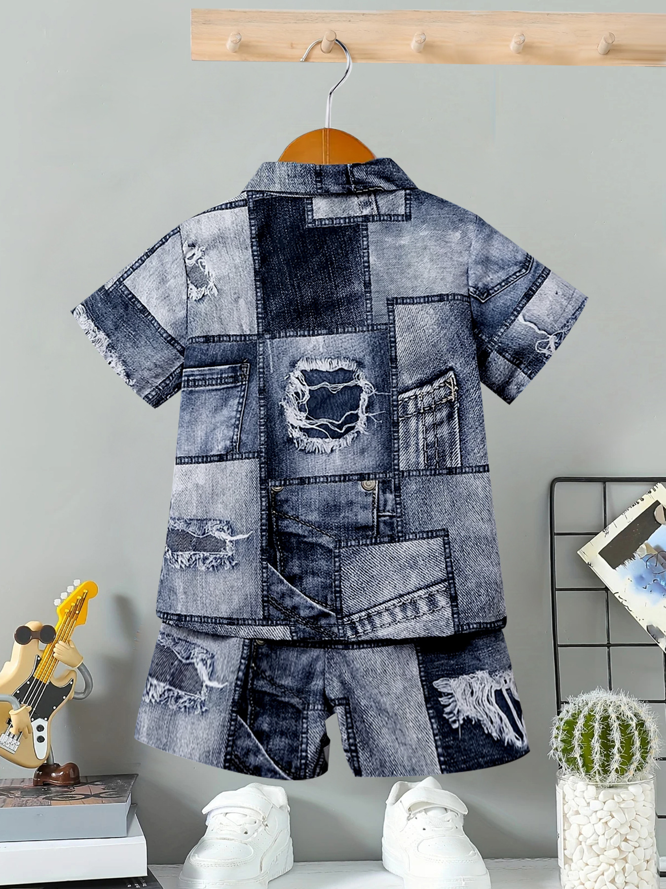 소년의 캐주얼 반팔 셔츠, 데님 반팔 반바지 세트, 폴리 에스테르 패브릭, 정사이즈 버전