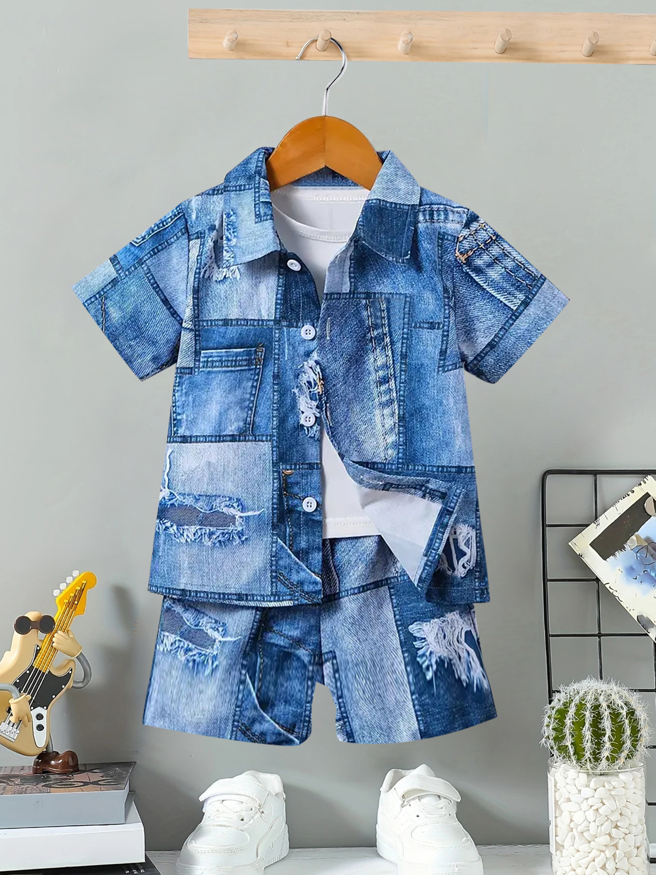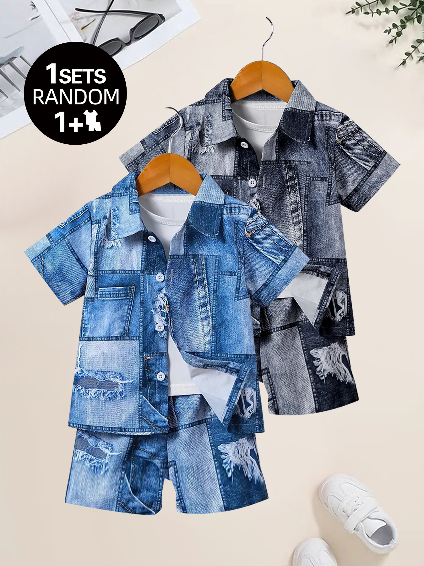 소년의 캐주얼 반팔 셔츠, 데님 반팔 반바지 세트, 폴리 에스테르 패브릭, 정사이즈 버전스토어 가기