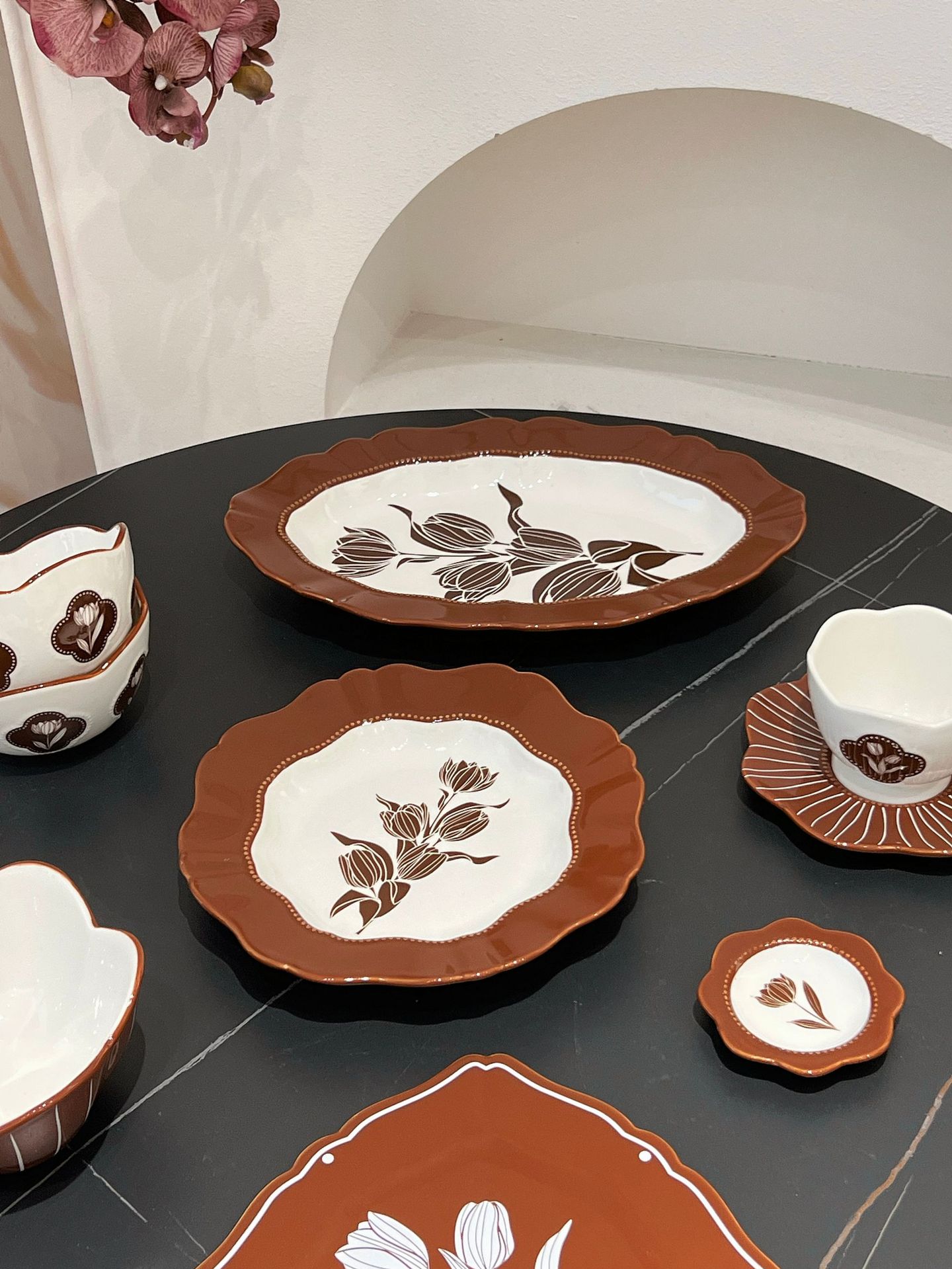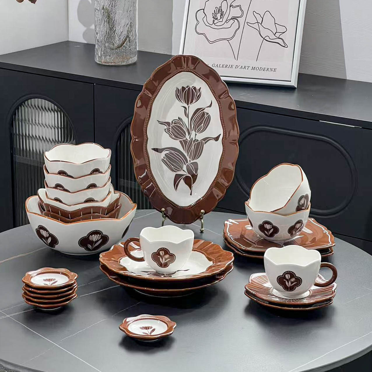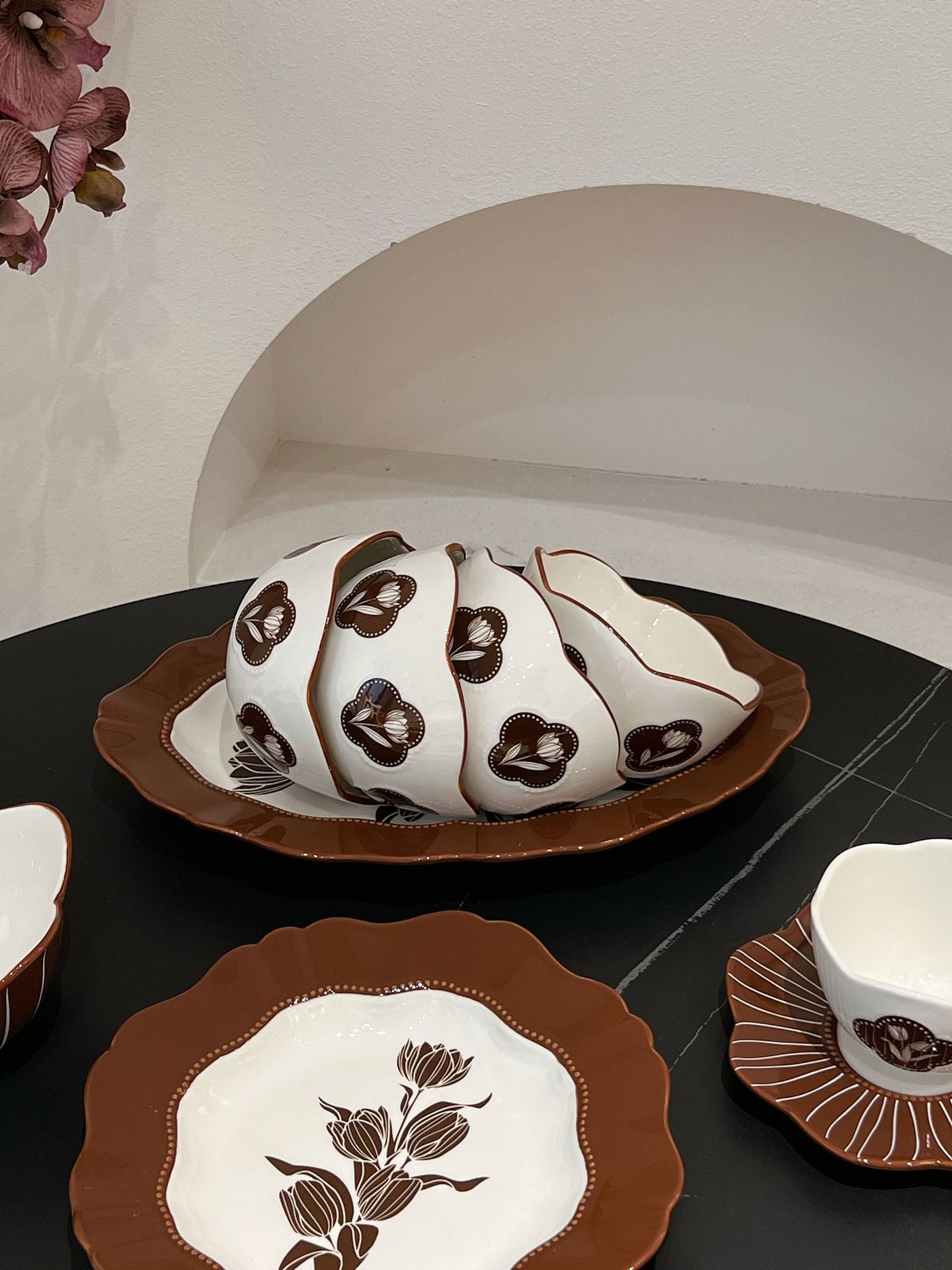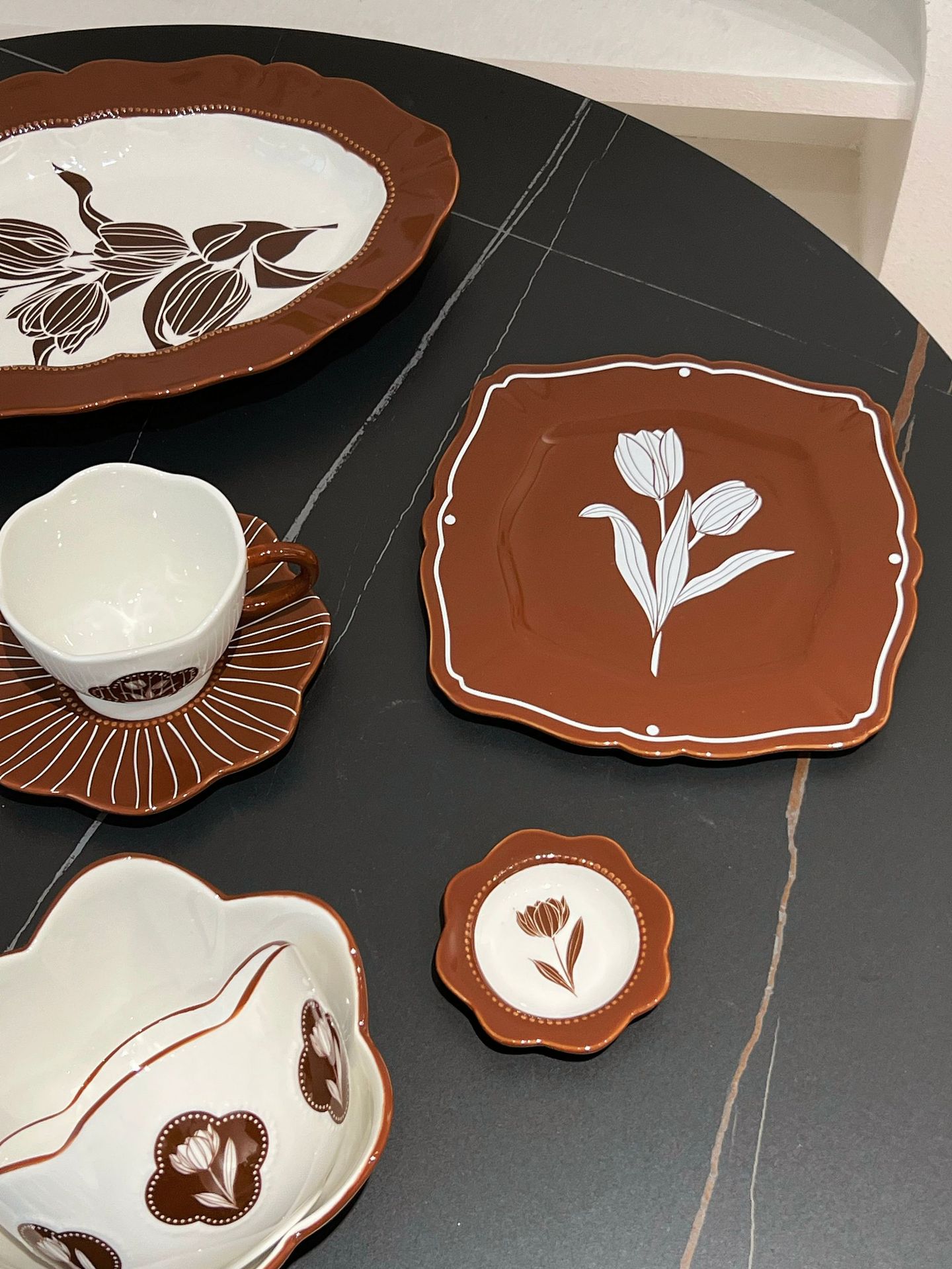 중간 고대 튤립 빈티지 다크 브라운 식기 그릇 및 요리 가정용 고급 센스 트레이 흑백 디너 플레이트 스퀘어