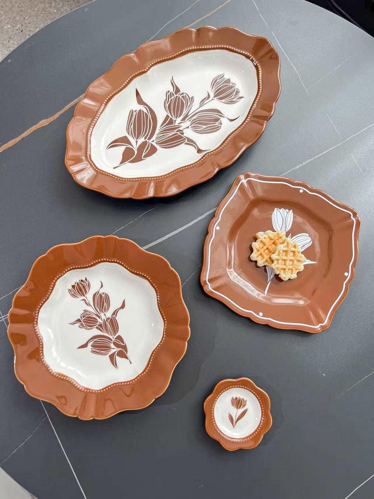 중간 고대 튤립 빈티지 다크 브라운 식기 그릇 및 요리 가정용 고급 센스 트레이 흑백 디너 플레이트 스퀘어스토어 가기