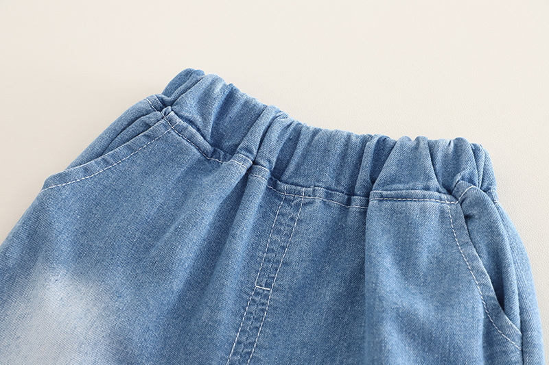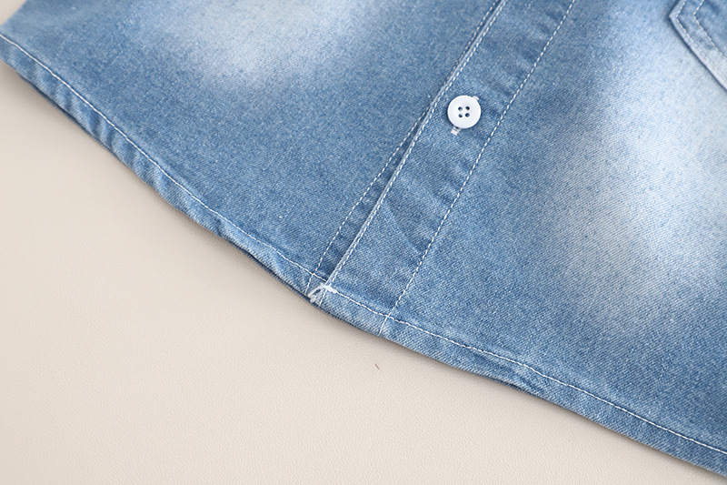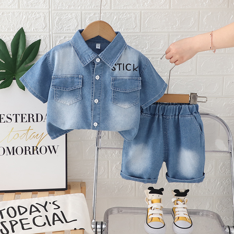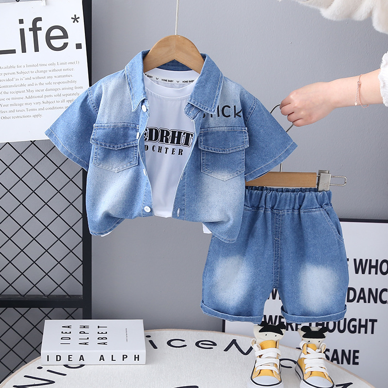 멋진 어린 소년 여름 옷 2025 새로운 여름 스타일 소년의 세련된 그라데이션 얇은 데님 반팔 3 피스 세트 유행스토어 가기