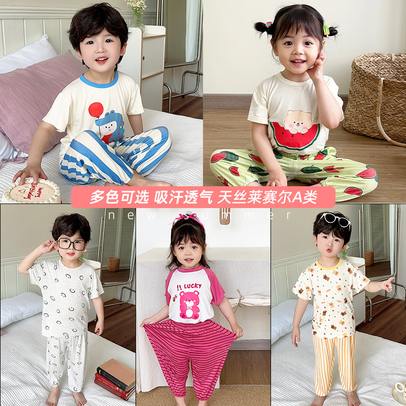 어린이 Tencel Lyocell 반팔 바지 홈 의류 세트 부드러운 왁스 빛 에어컨 옷 우유 윙윙 거리는 질감
