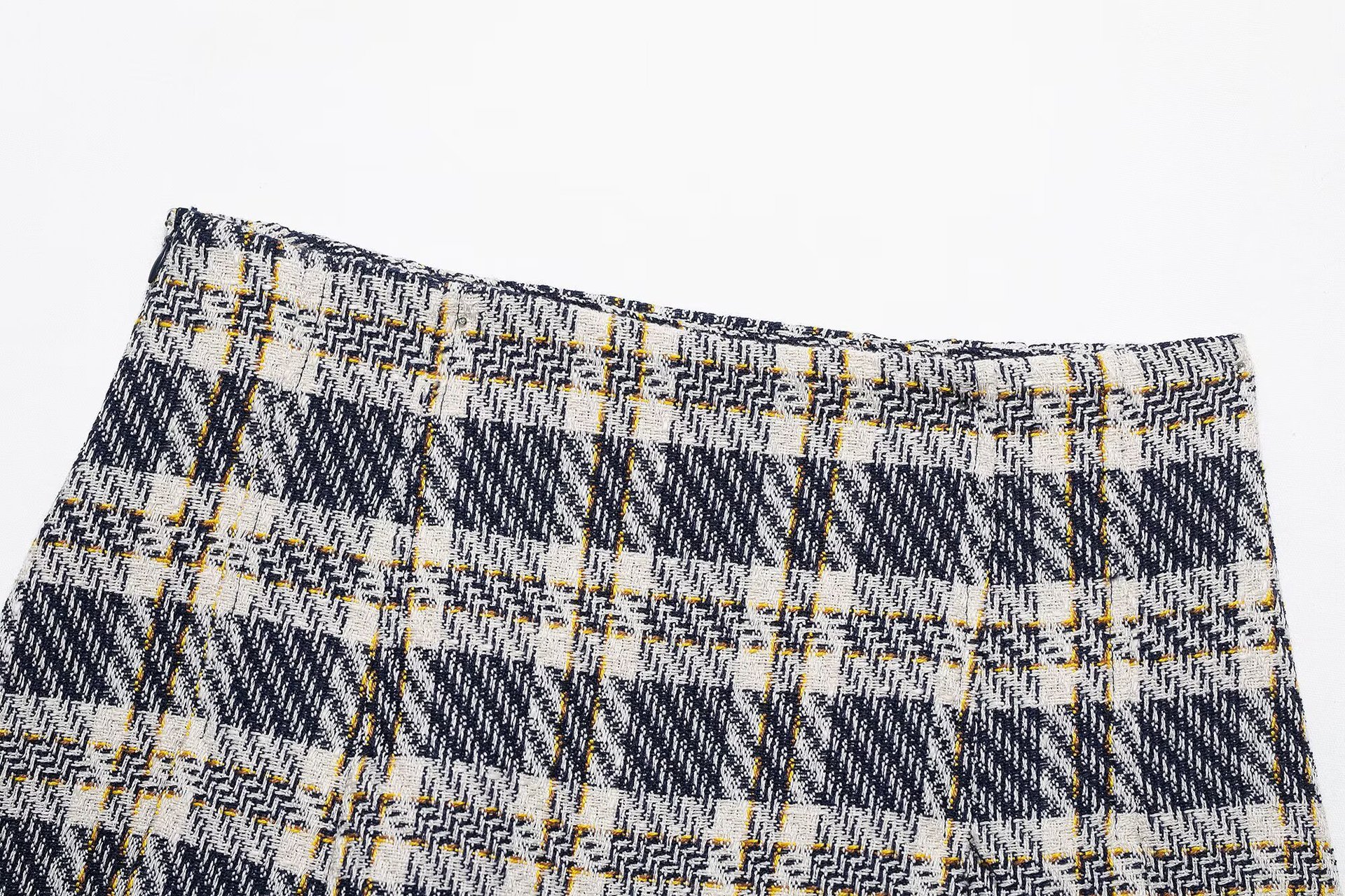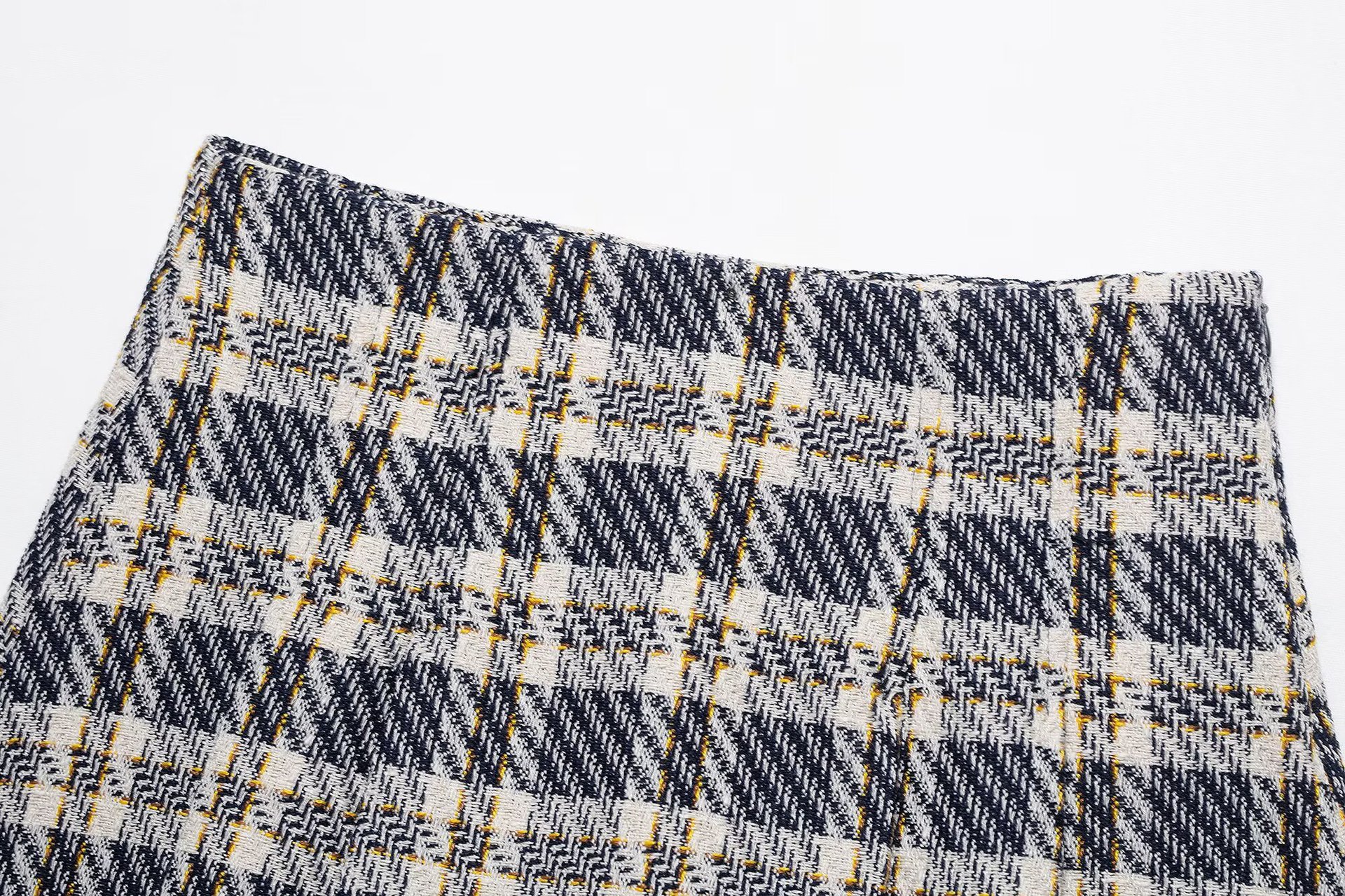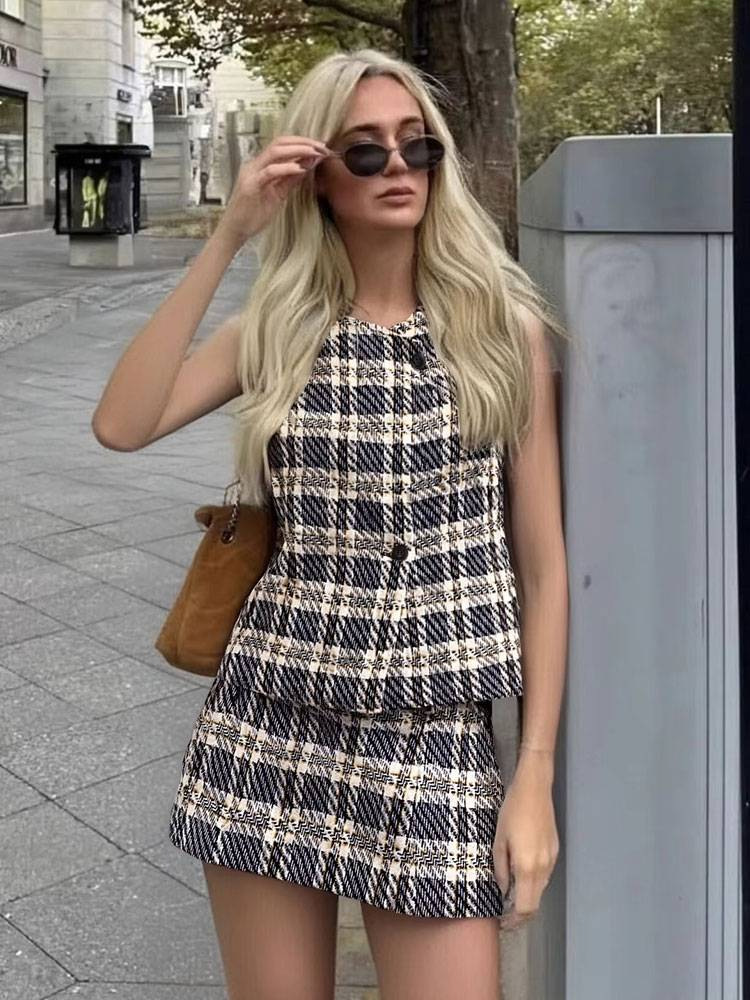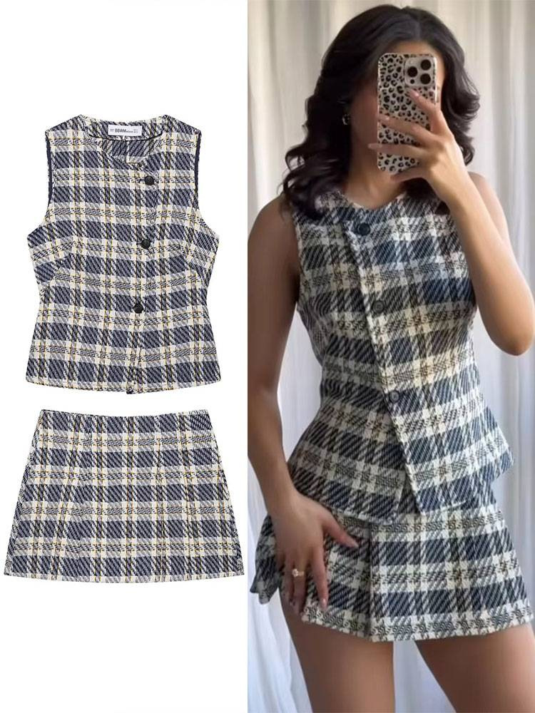 유럽 및 미국 여성 의류 도매 여성용 체크 무늬 질감 조끼 와이드 플리츠 체크 무늬 치마바지 세트