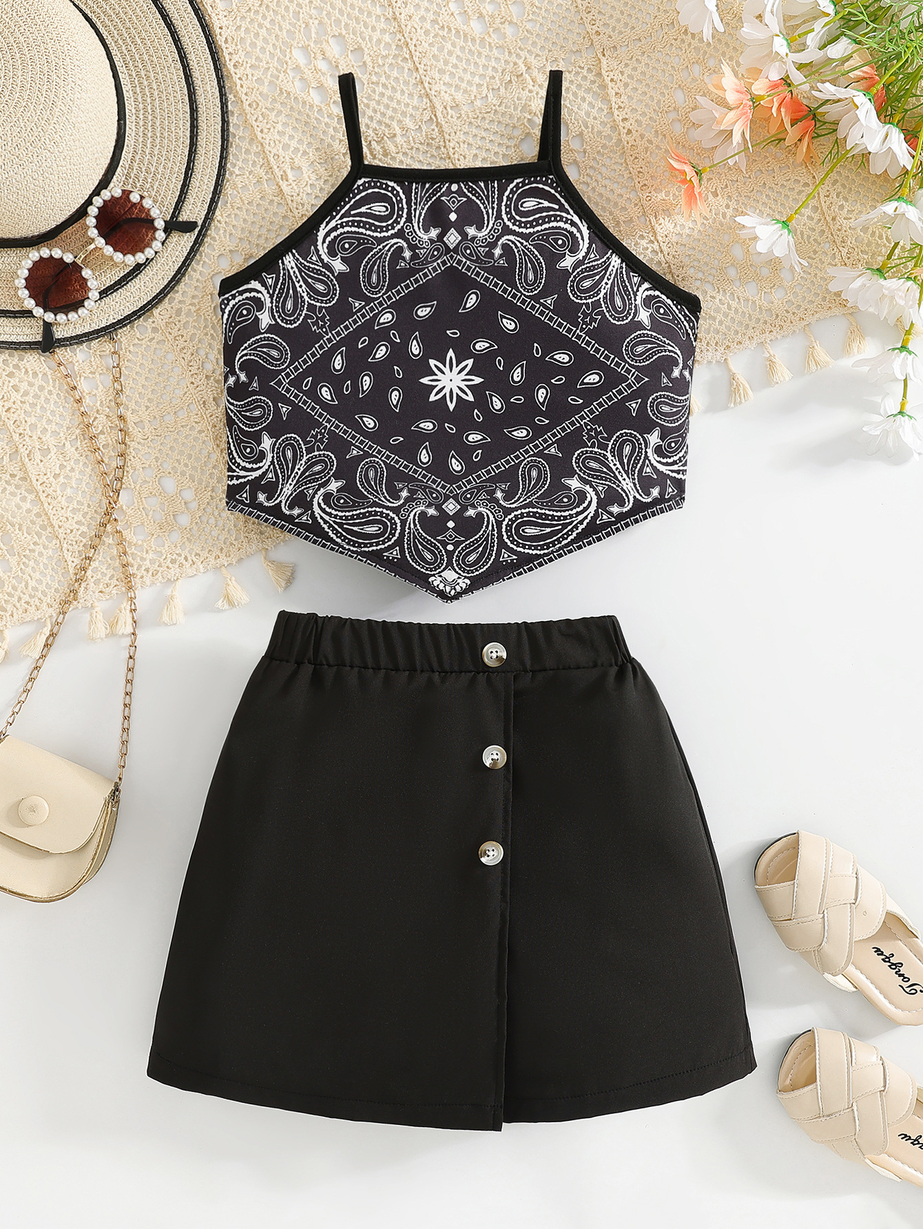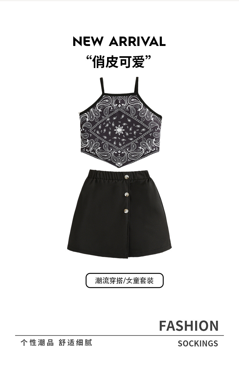 국경 간 소녀 여름 세트 캐슈 플라워 슬링 탑 블랙 짧은 바지 스커트 여름 여성 어린이 투피스 세트