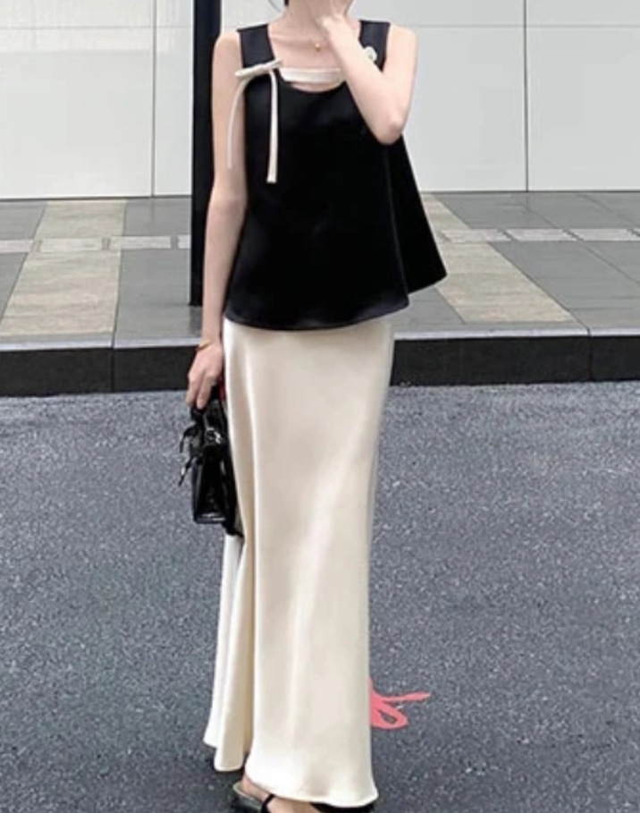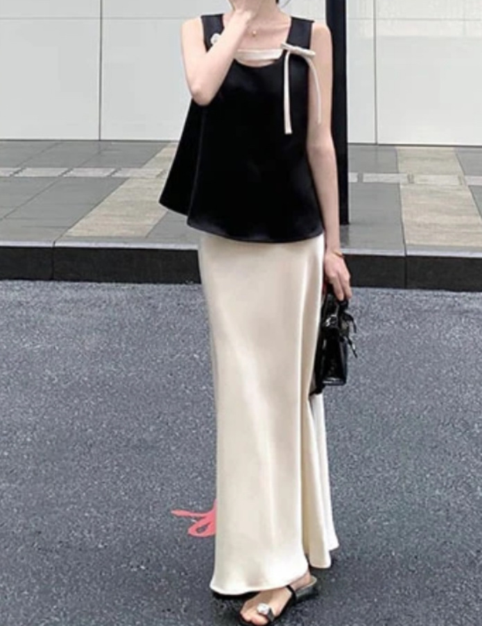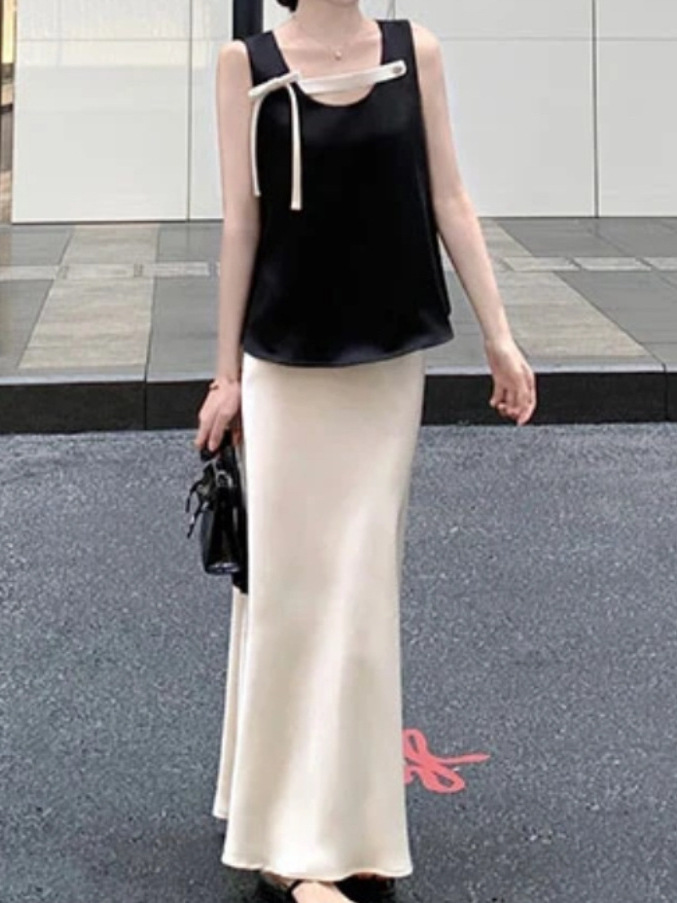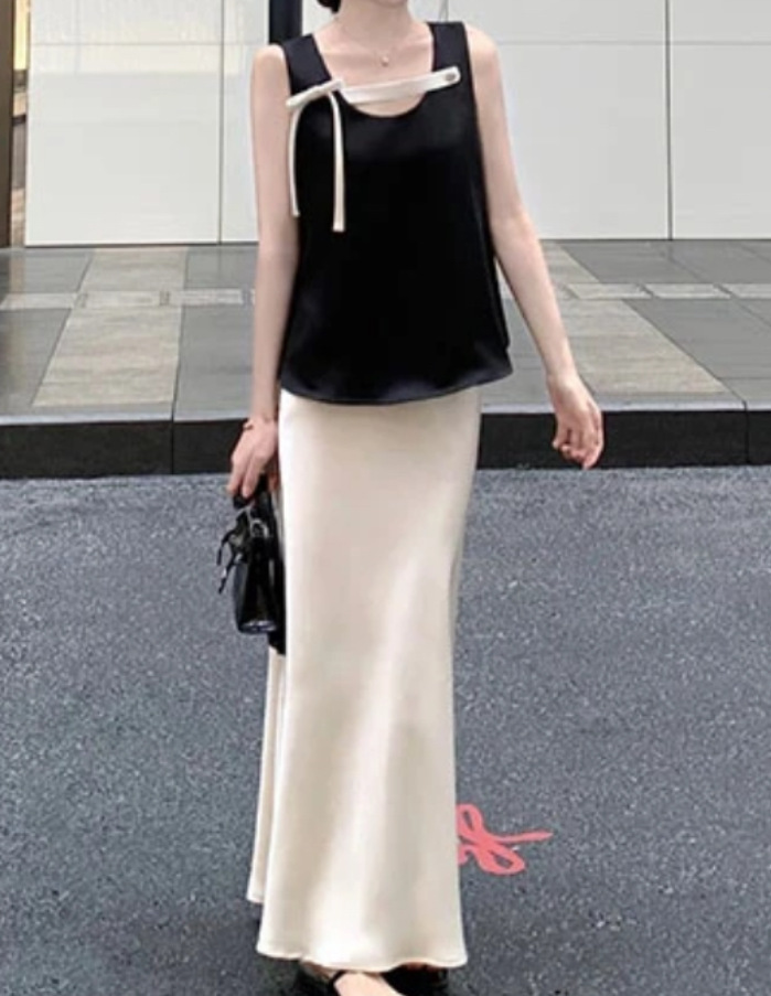 2025 봄 새로운 슬림 핏 슬리밍 캐주얼 올 매치 민소매 탑 우아한 패션 하이 웨이스트 A 라인 하프 길이 원피스