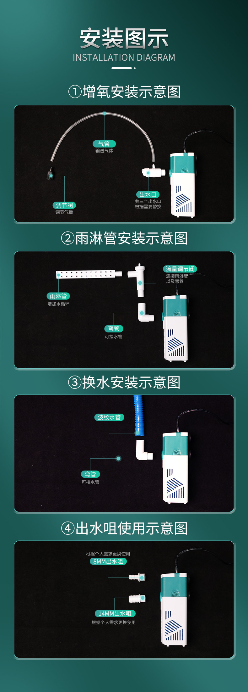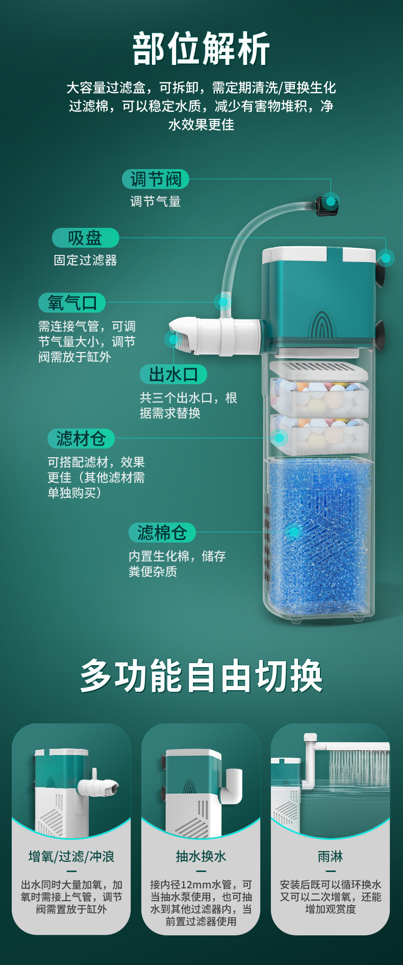 수조 필터, 자동 4-in-1 정수 순환, 내장형 수중 산소 펌프, 배변 흡입 필터 펌프, 소형 수족관