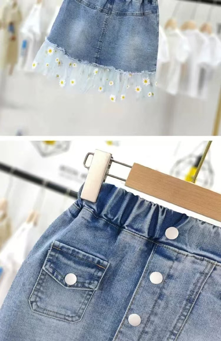 소녀의 데님 스커트 여름 2025 새로운 어린이 스커트 데이지 메쉬 스커트 여름 소녀의 데님 스커트