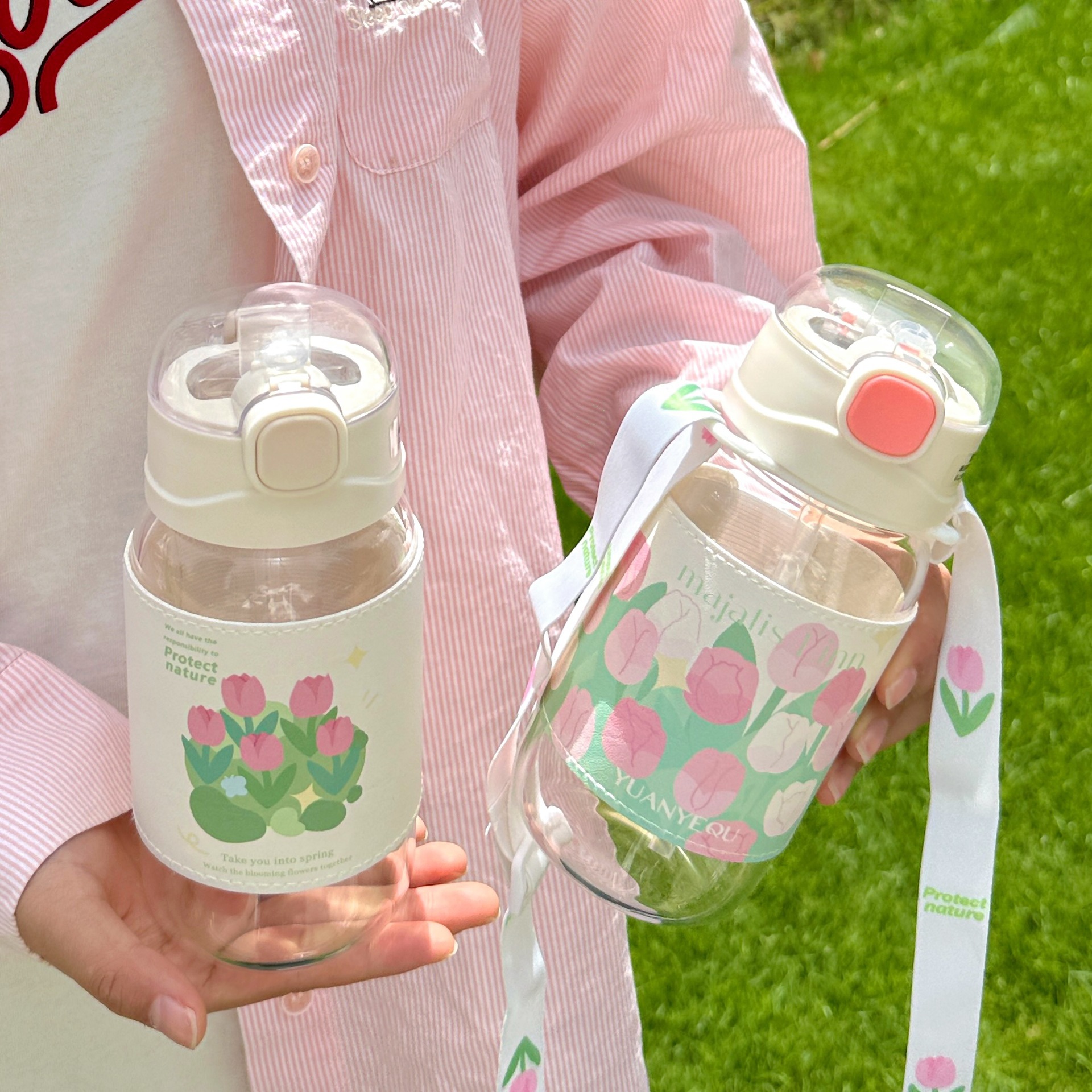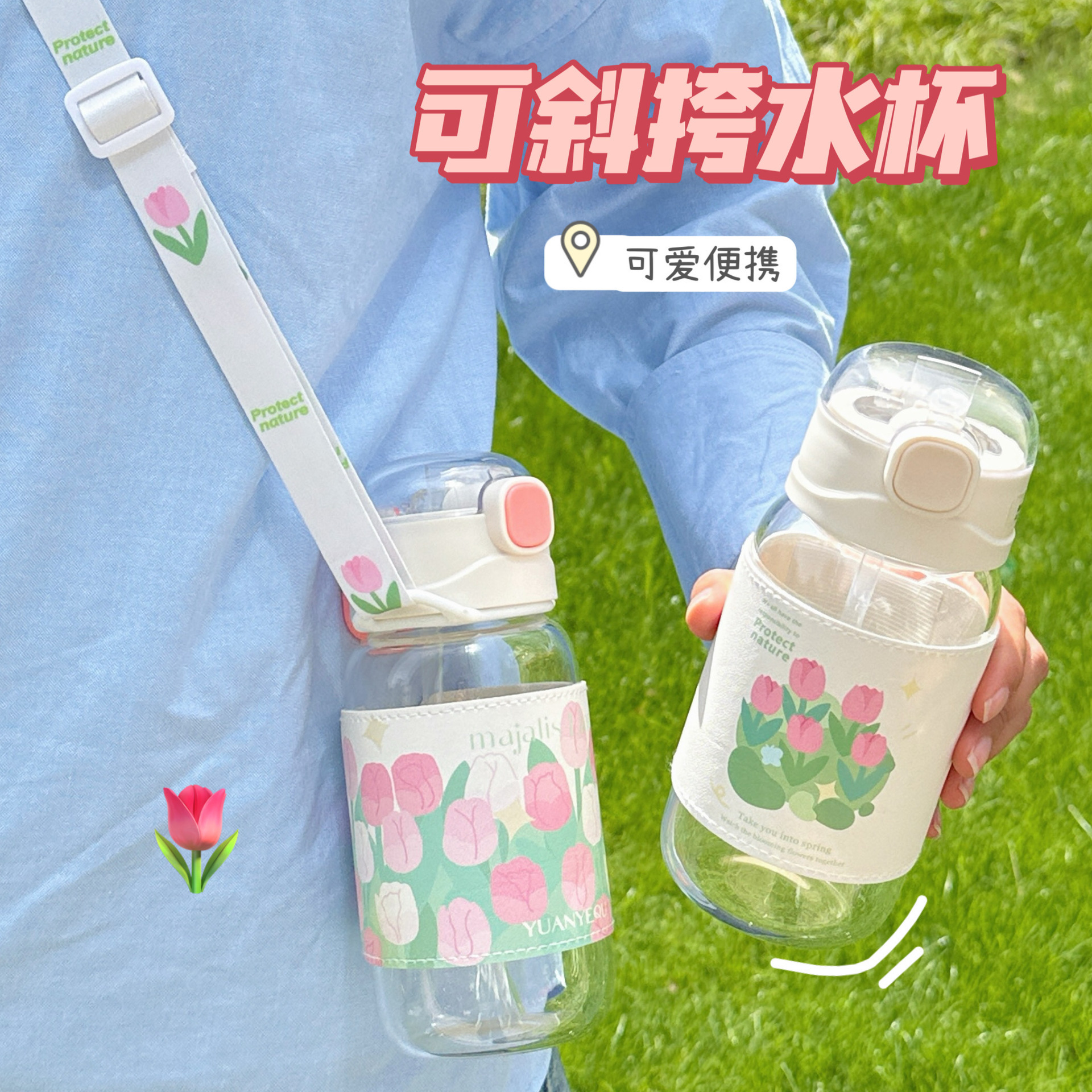 고급스러운 튤립 유리 물컵 여름 귀여운 컵 스타일 휴대용 스트랩 어린이 밀짚 컵 도매스토어 가기