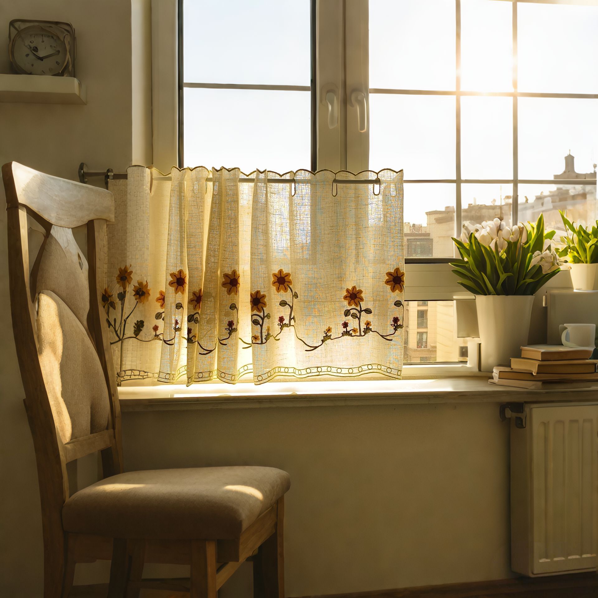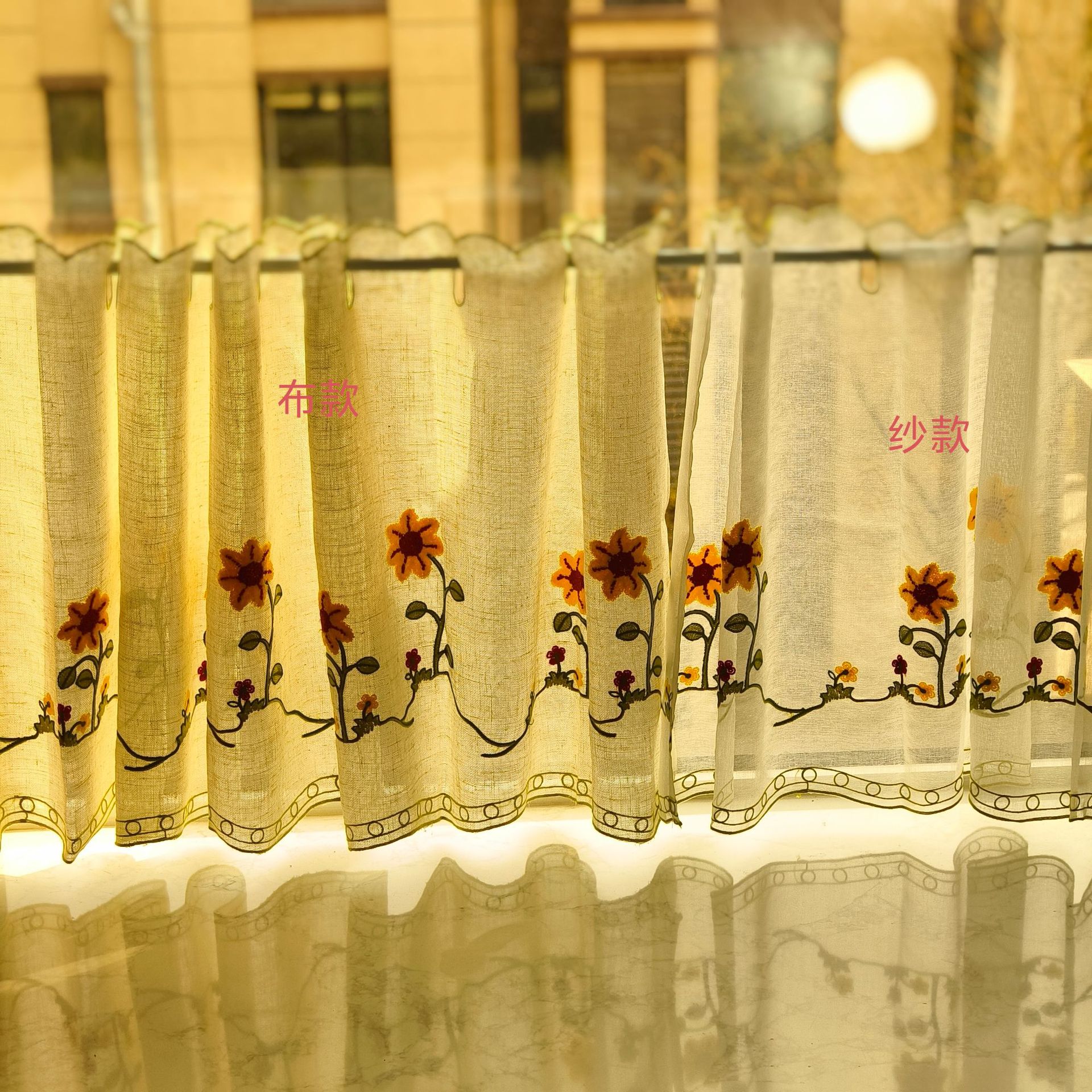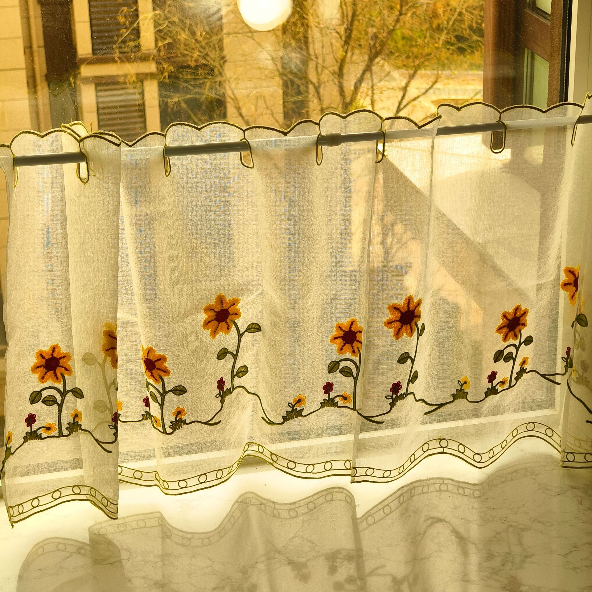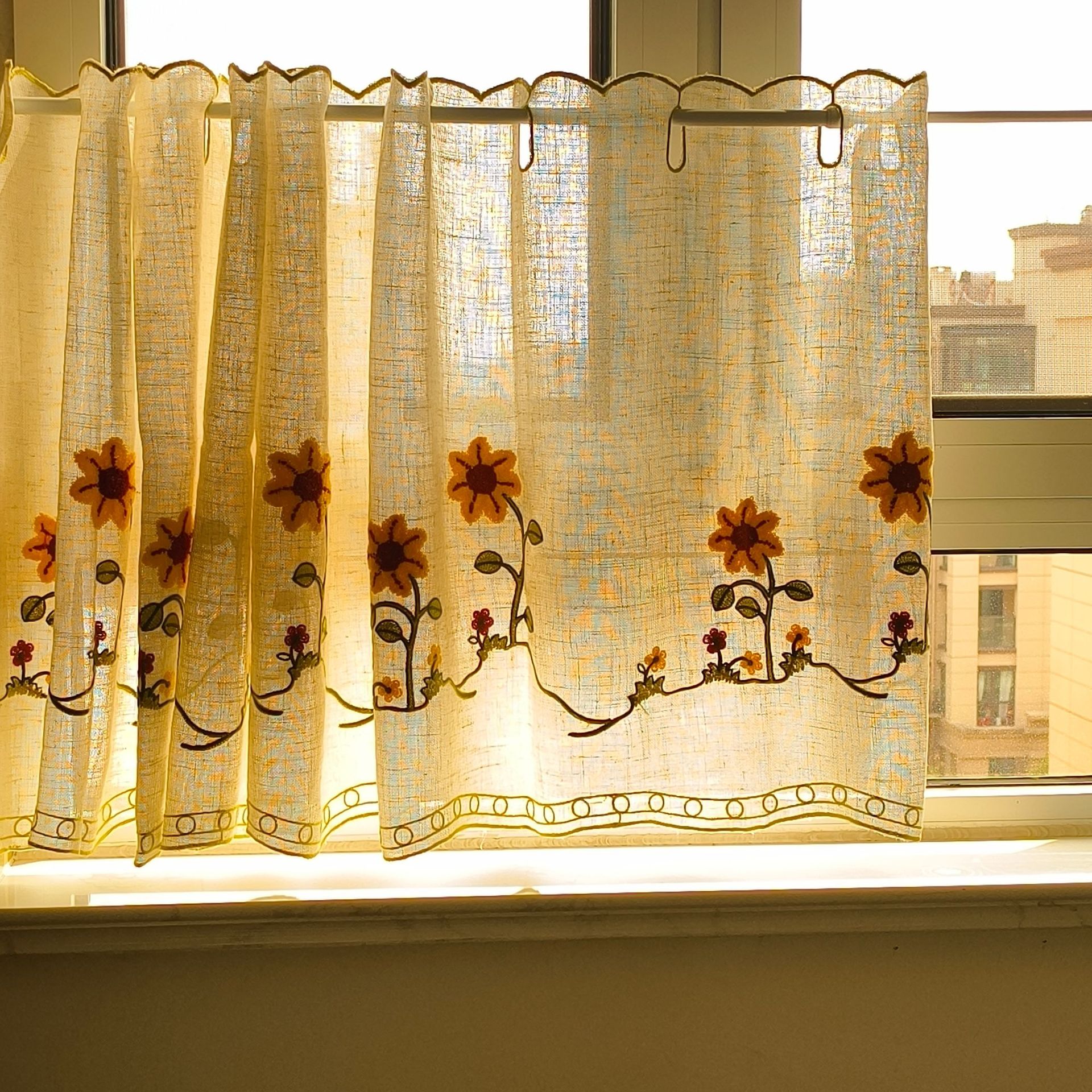 완성된 짧은 커튼, 해바라기 자수, 반투명 커피 커튼, 주방 자수 반 커튼