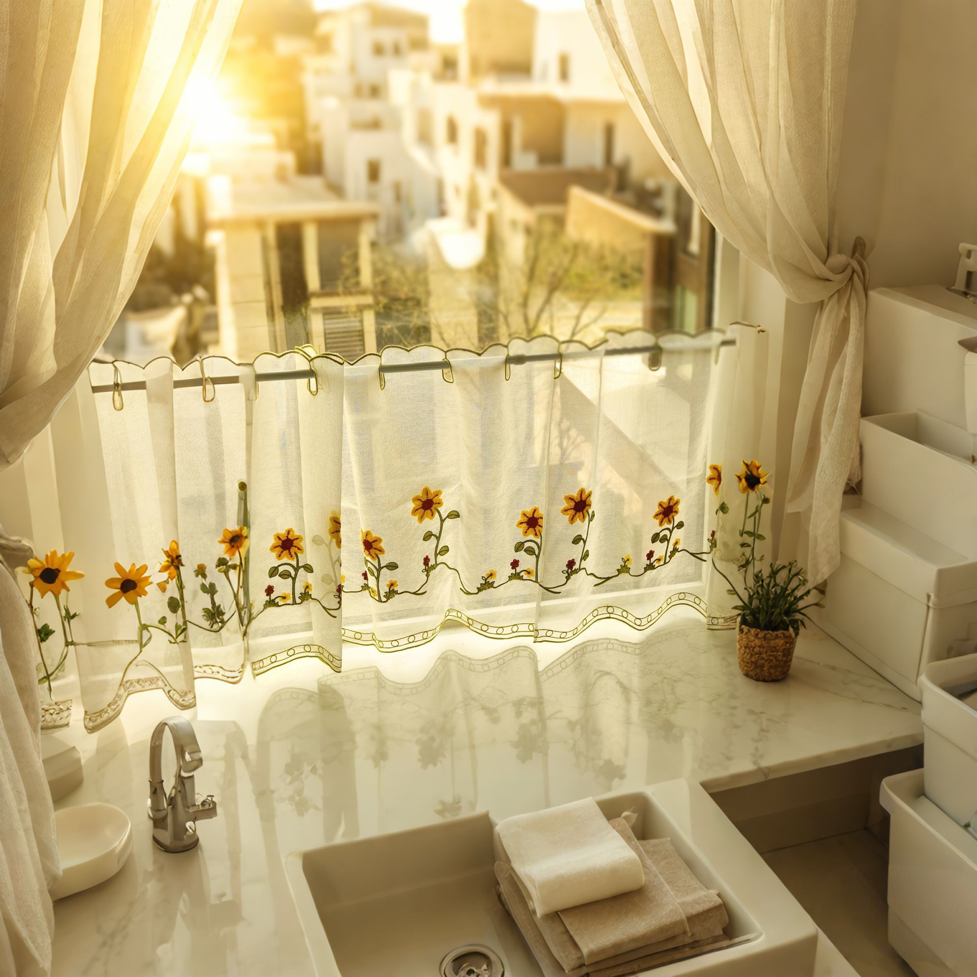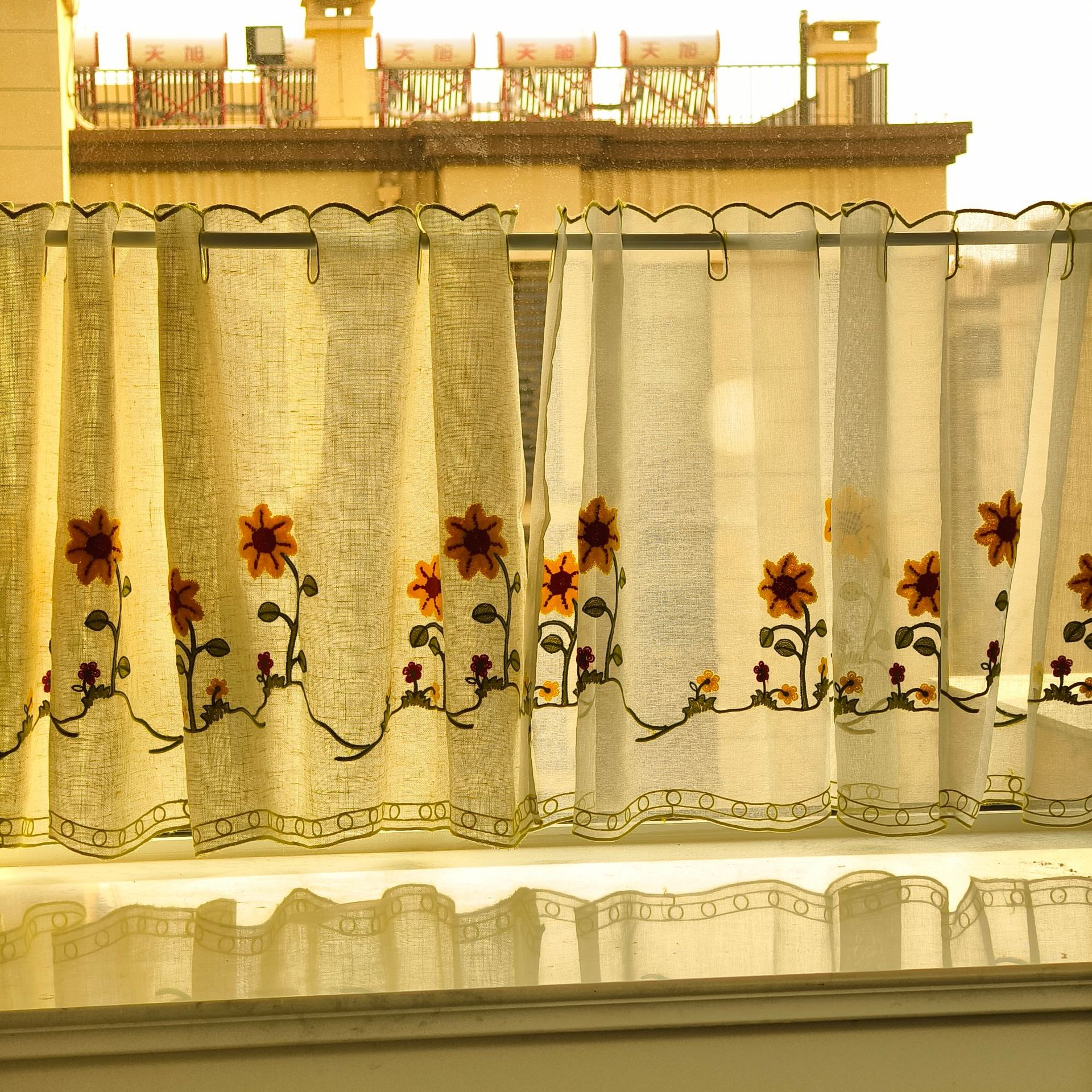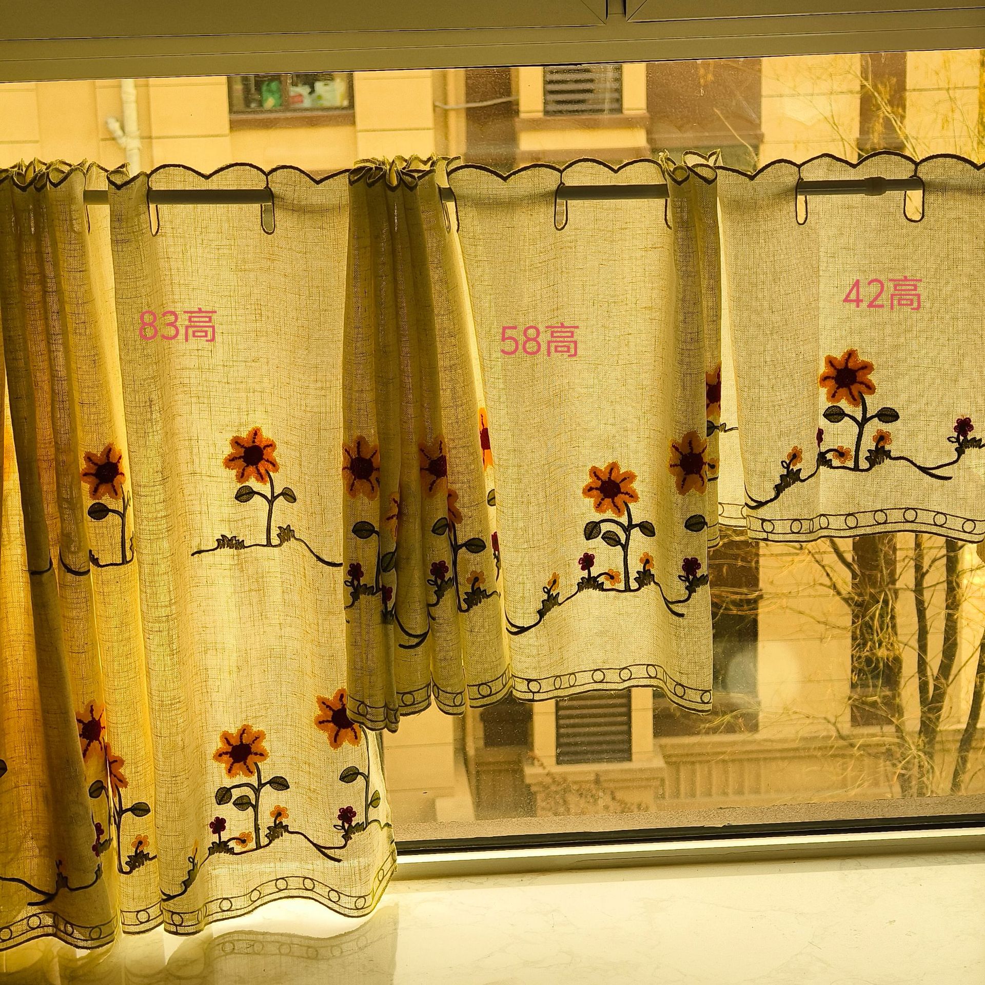 완성된 짧은 커튼, 해바라기 자수, 반투명 커피 커튼, 주방 자수 반 커튼스토어 가기