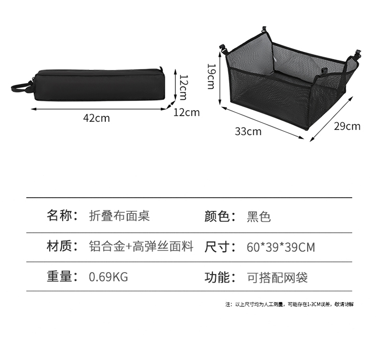 • 검정색 접이식 테이블, 나일론 메쉬, 물컵 삽입 가능, 평행봉, 알루미늄 합금 옥스포드 천 데스크탑