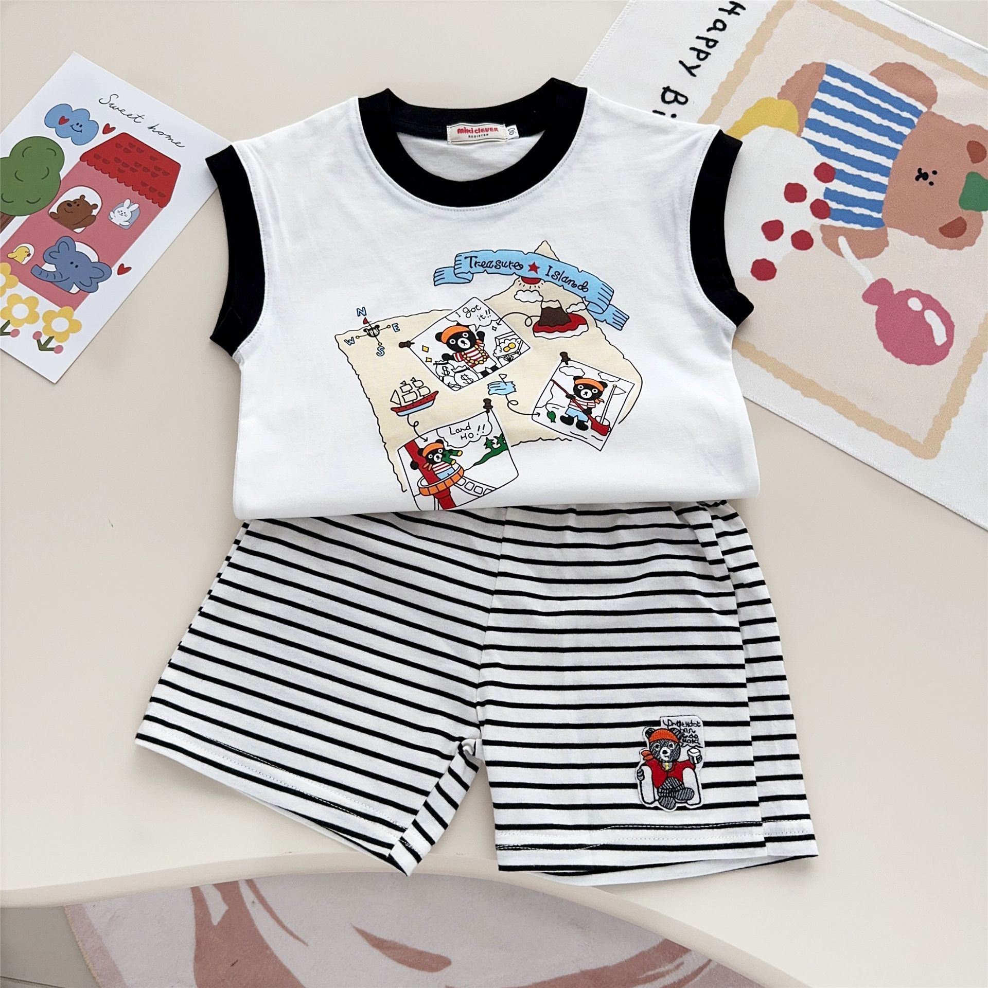 2025 새로운 여름 소년 정장 귀여운 전체 인쇄 인쇄 유행 아기 민소매 티셔츠 캐주얼 투피스 세트