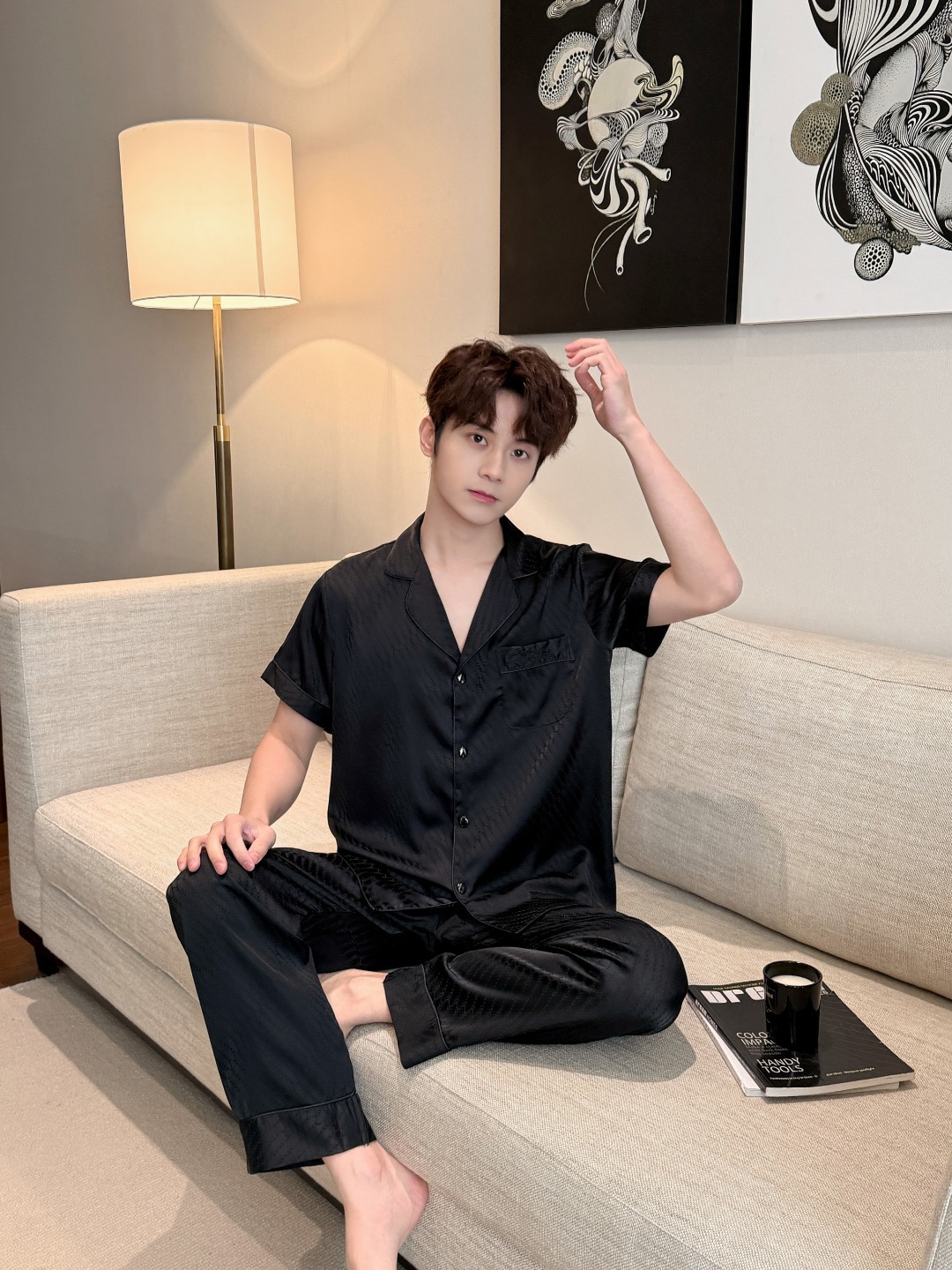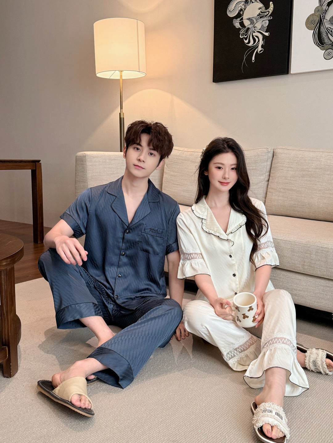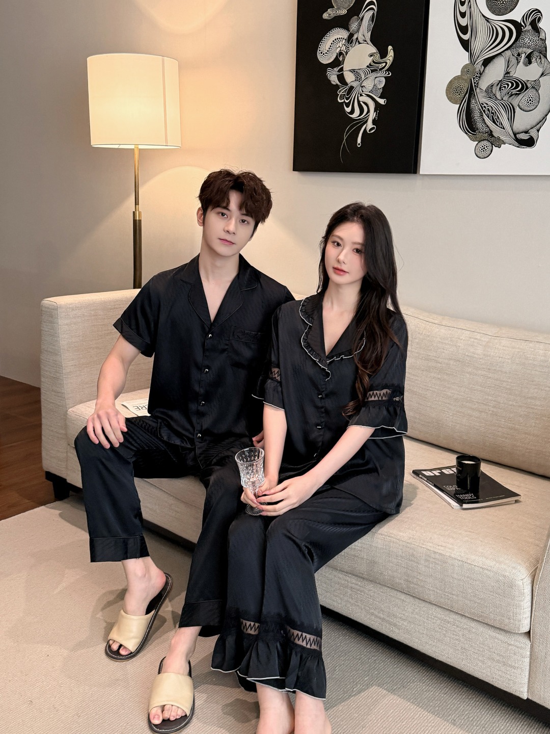 여름 새로운 스팟 아이스 실크 커플 잠옷 여성 하이 엔드 자카드 새틴 실크 블랙 남성 플러스 사이즈 홈웨어