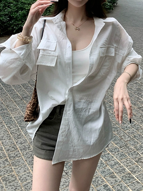 히비스커스 원 [지적 휴식] 긴 소매 셔츠 여성 여름 느슨한 모조 리넨 탑 화이트 선스크린 셔츠 게으른 스타일