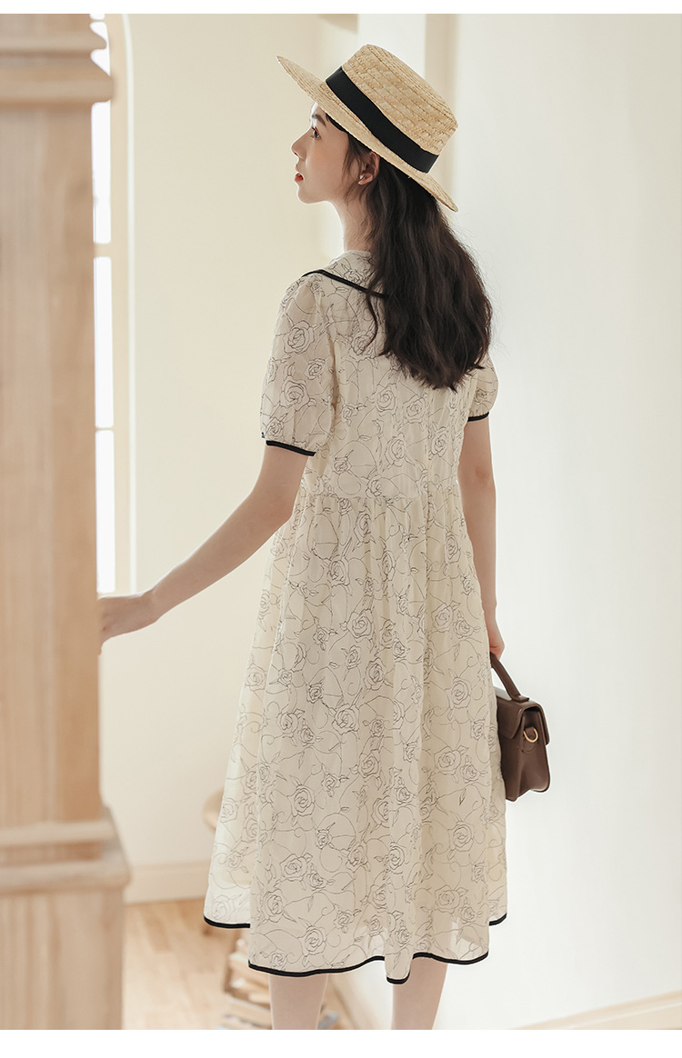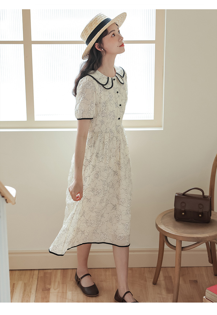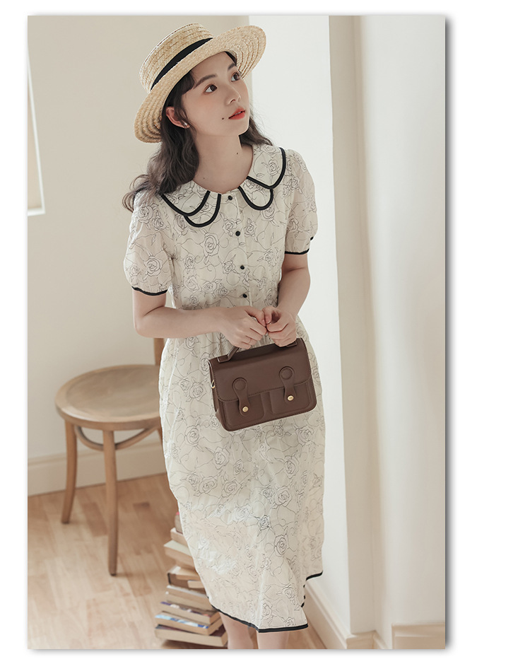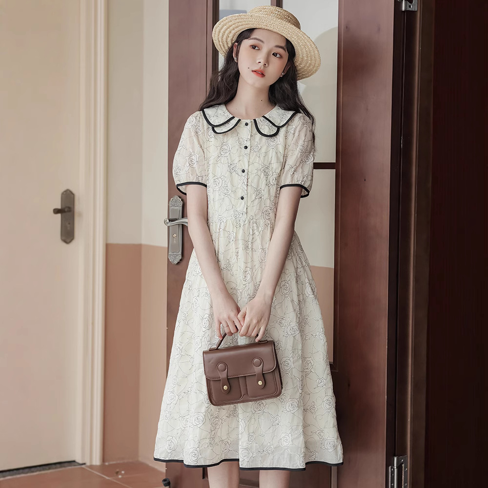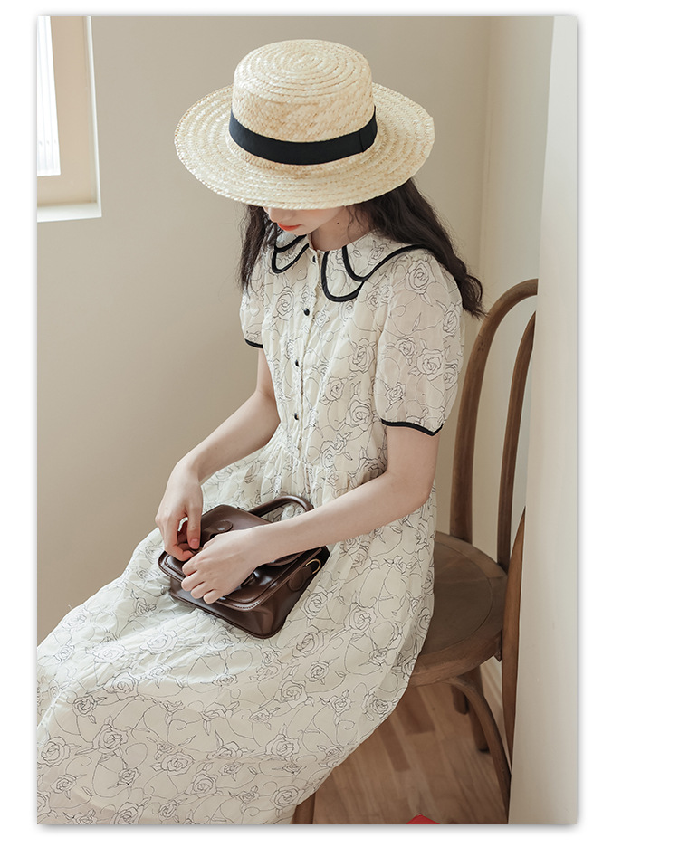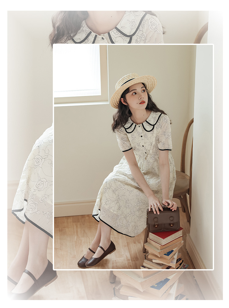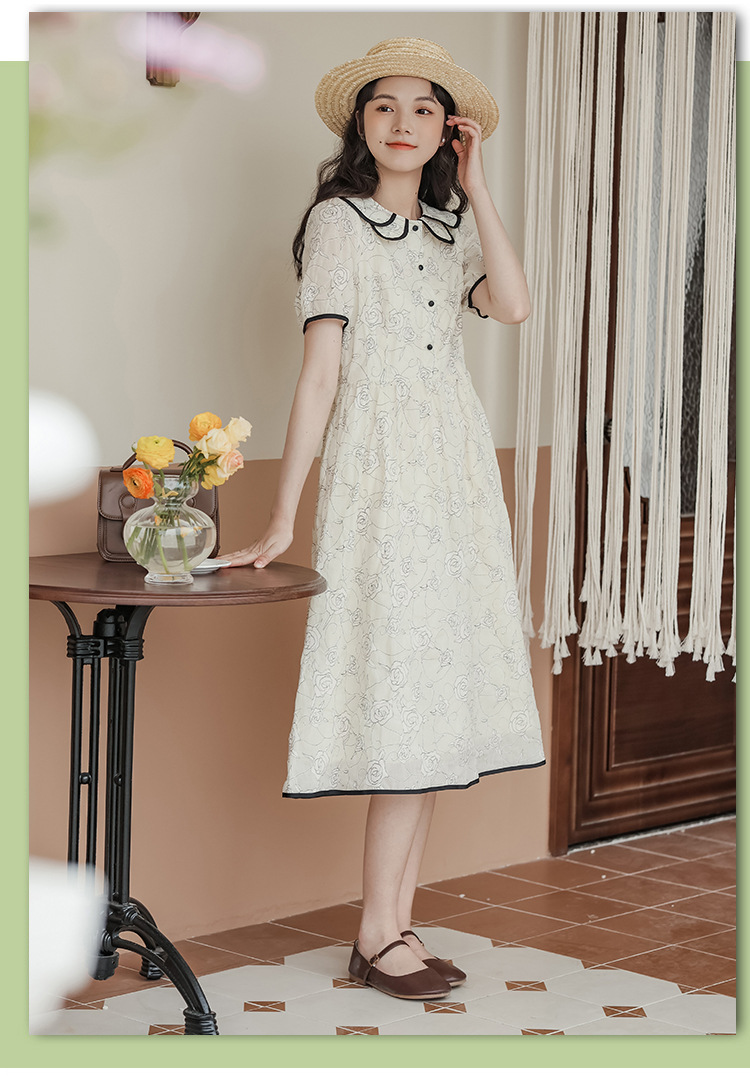 더블 레이어 꽃잎 칼라 로즈 프린트 반팔 원피스 여성 2025 년 여름 프랑스 하이 허리 하이 엔드 미디 원피스