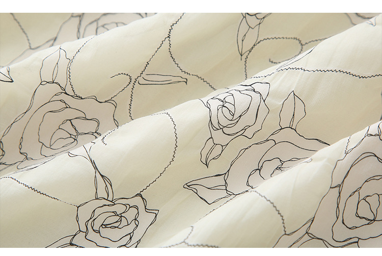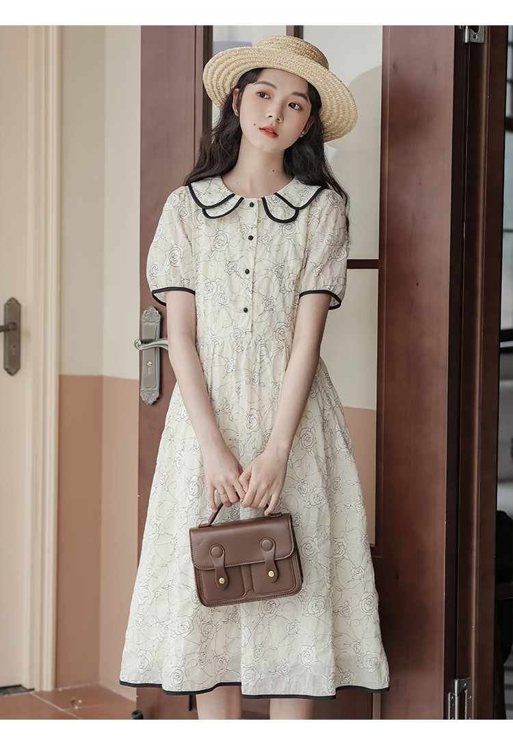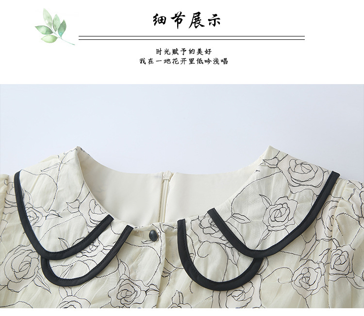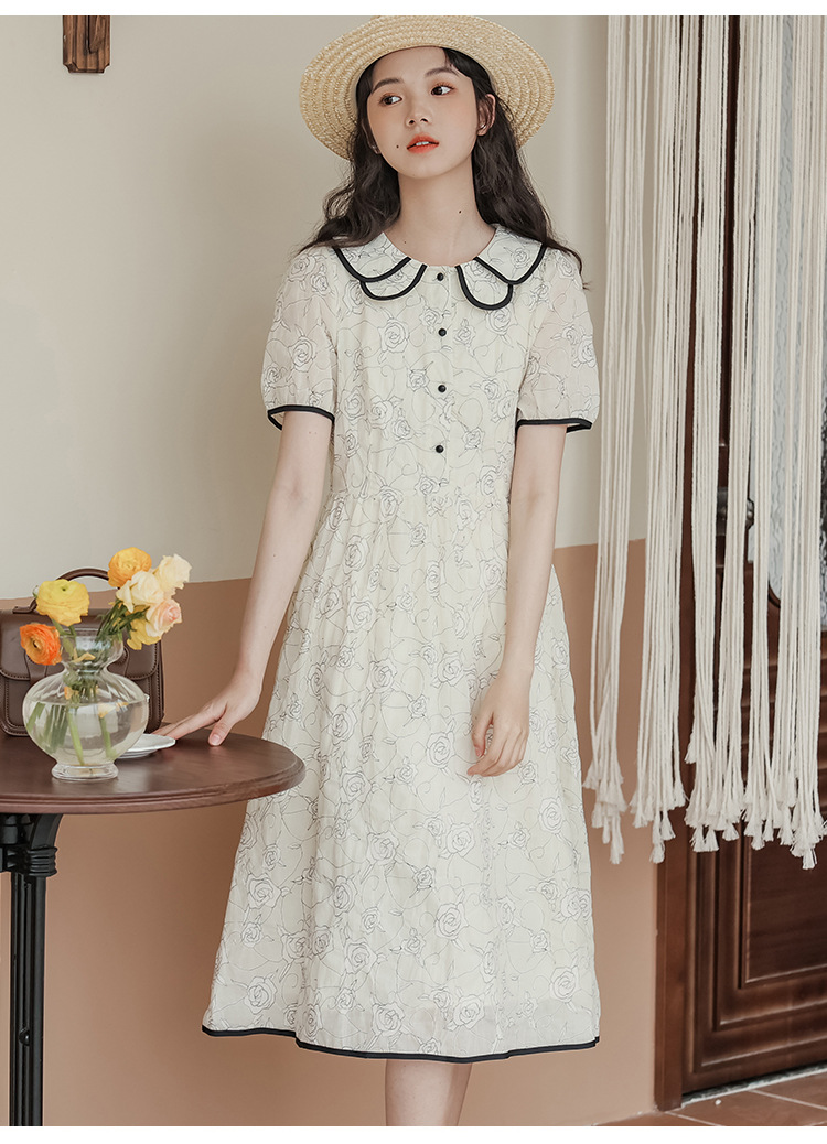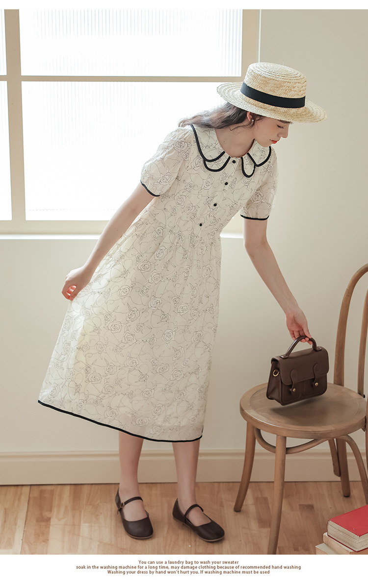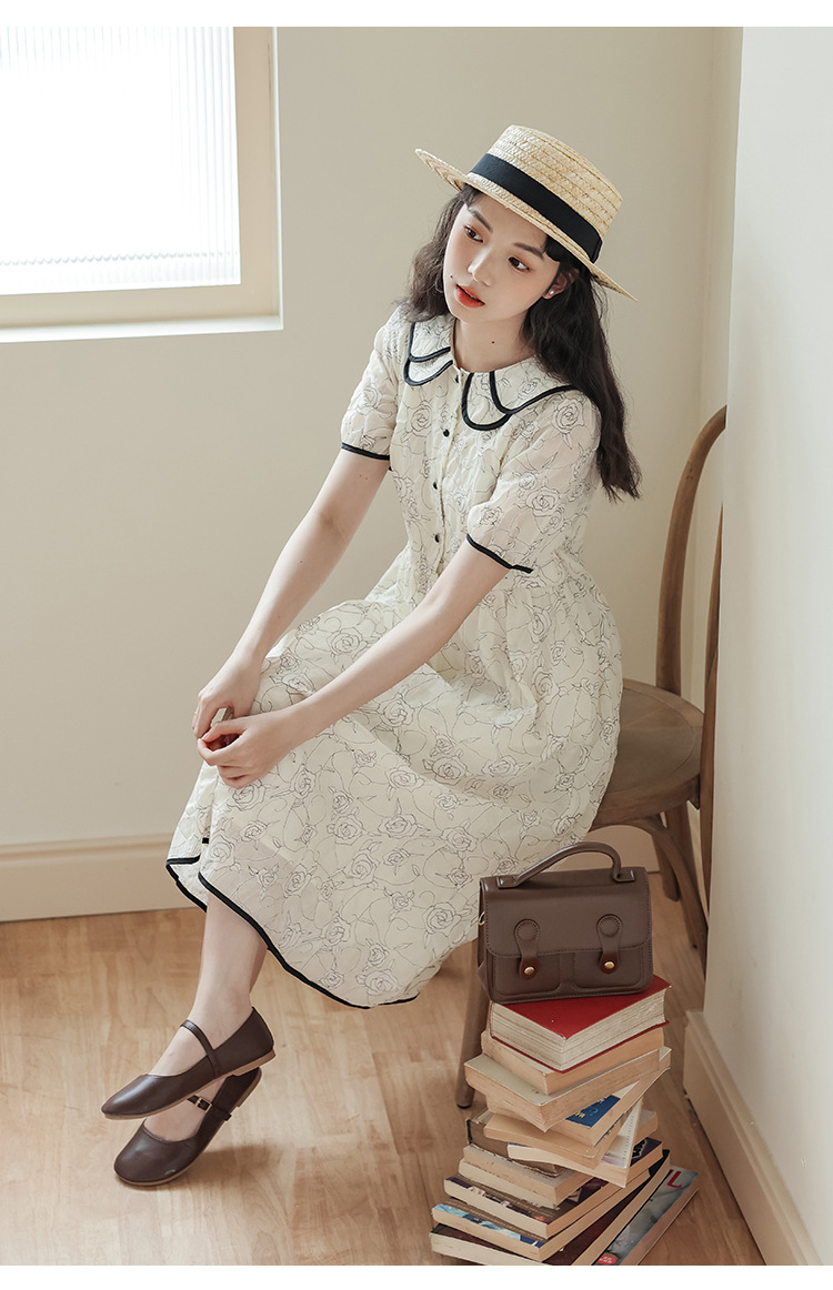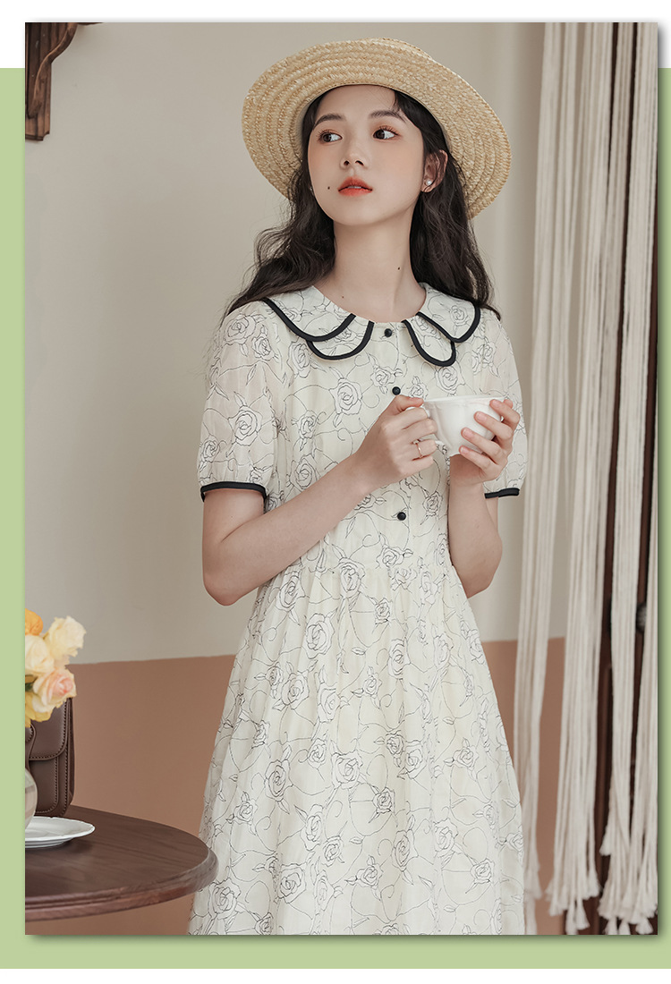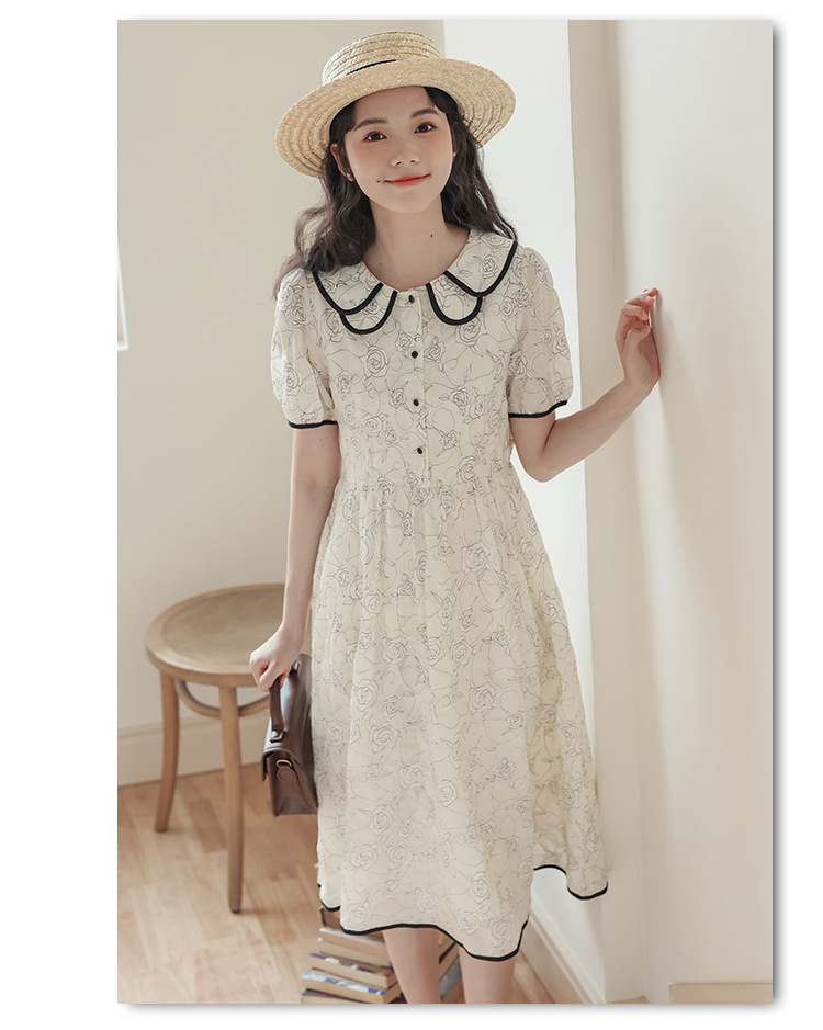더블 레이어 꽃잎 칼라 로즈 프린트 반팔 원피스 여성 2025 년 여름 프랑스 하이 허리 하이 엔드 미디 원피스