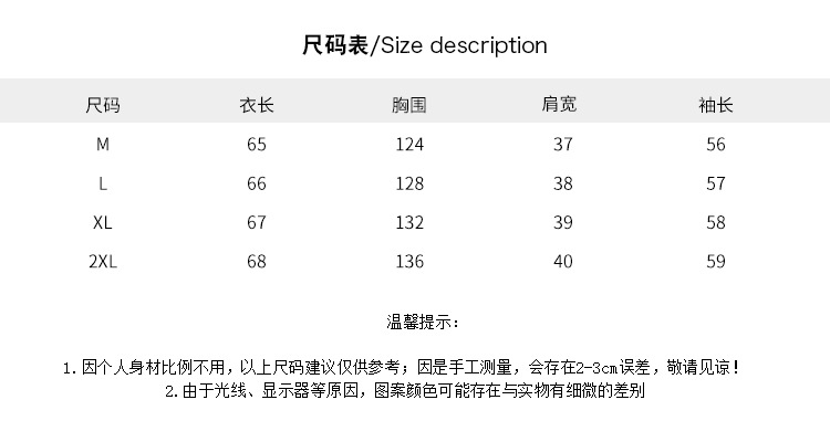 关于尺码:单位:cm,平铺手工测量,有2-4cm误差属于正常。尺码推荐仅供参考,不作为退换理由。