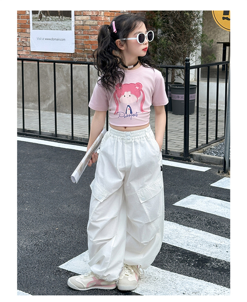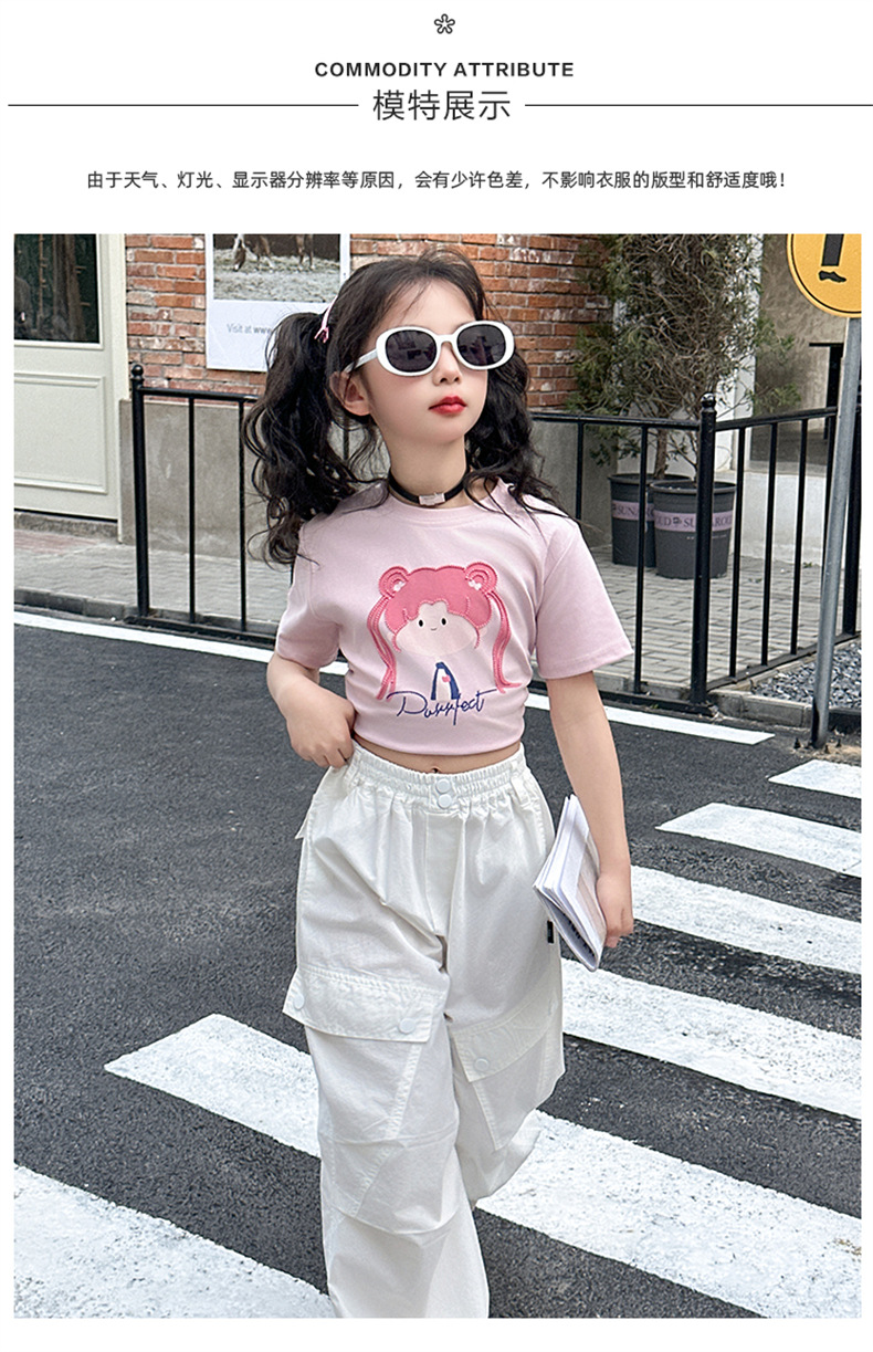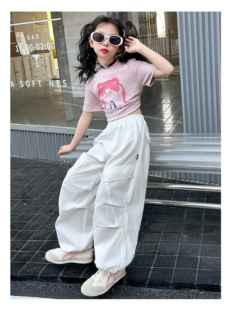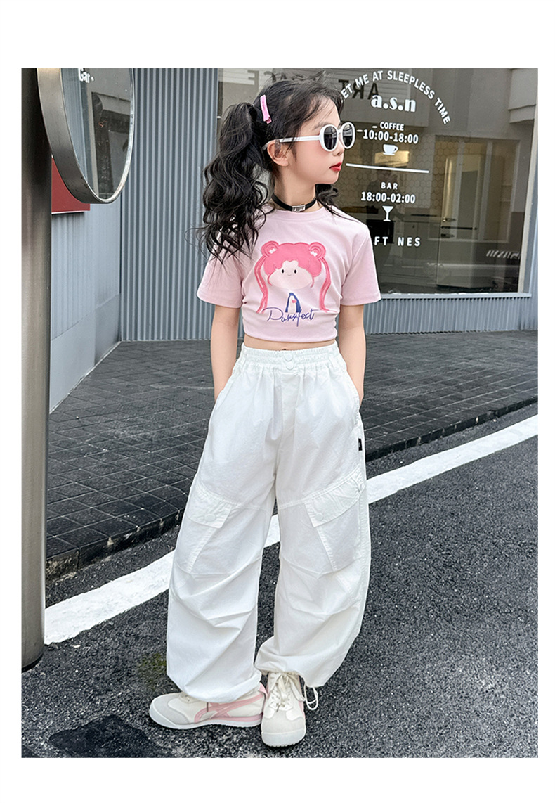소녀 캐주얼 프린트 티셔츠 와이드 다리 바지 세트 중 · 대형 어린이를위한 귀여운 반팔 크레인 바지 2025 여름 새로운스토어 가기