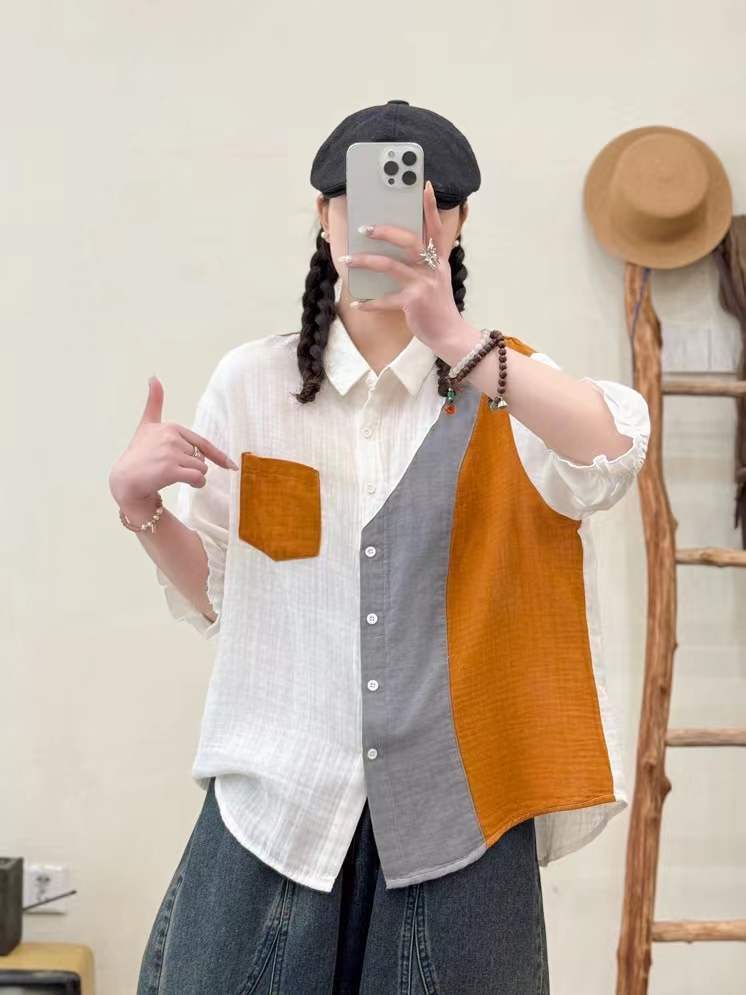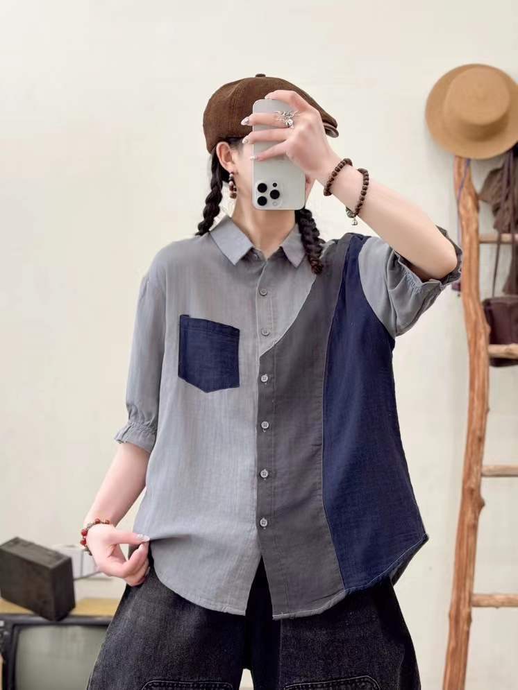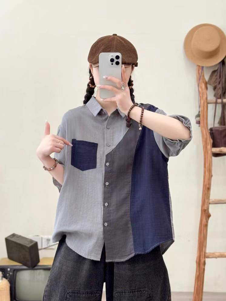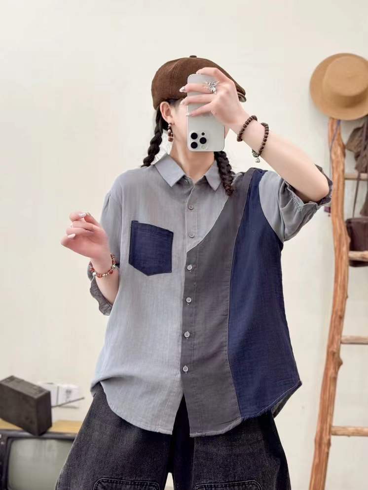 2025 여름 새로운 더블 원사 스티칭 대비 컬러 여성 카디건 반소매 셔츠 도매 조수스토어 가기