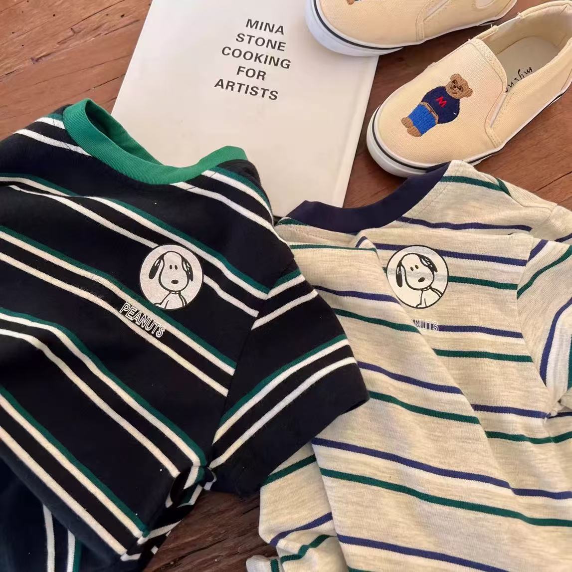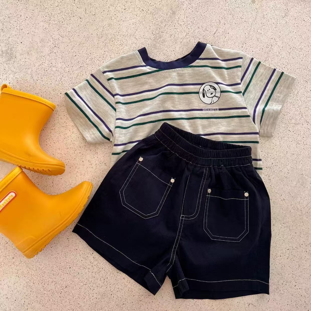 2025 어린이 코튼 티셔츠 소년의 느슨한 통기성 크루 넥 탑 아기의 세련된 줄무늬 만화 인쇄 짧은 소매스토어 가기