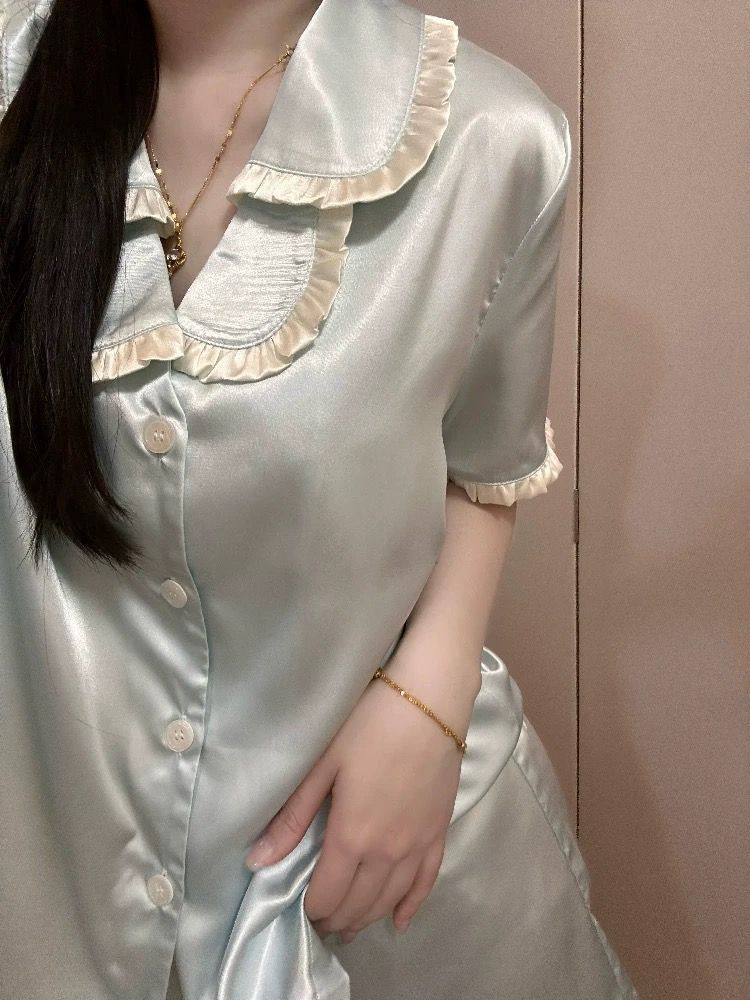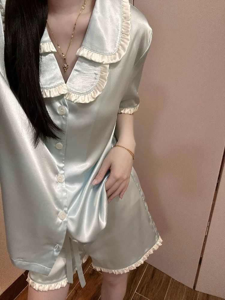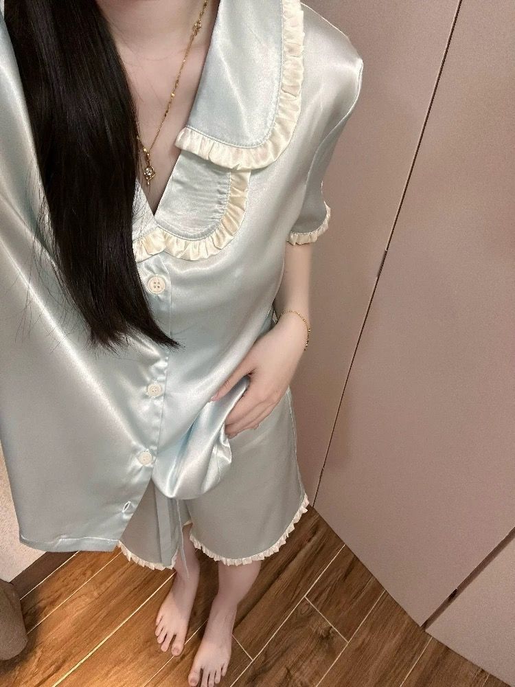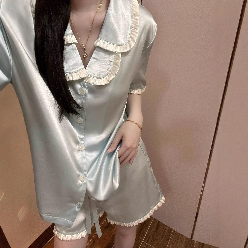 공주 스타일 아이스 실크 파자마 여성 여름 새로운 반팔 달콤한 하이 엔드 포장 솔리드 컬러 느슨한 홈 의류 세트