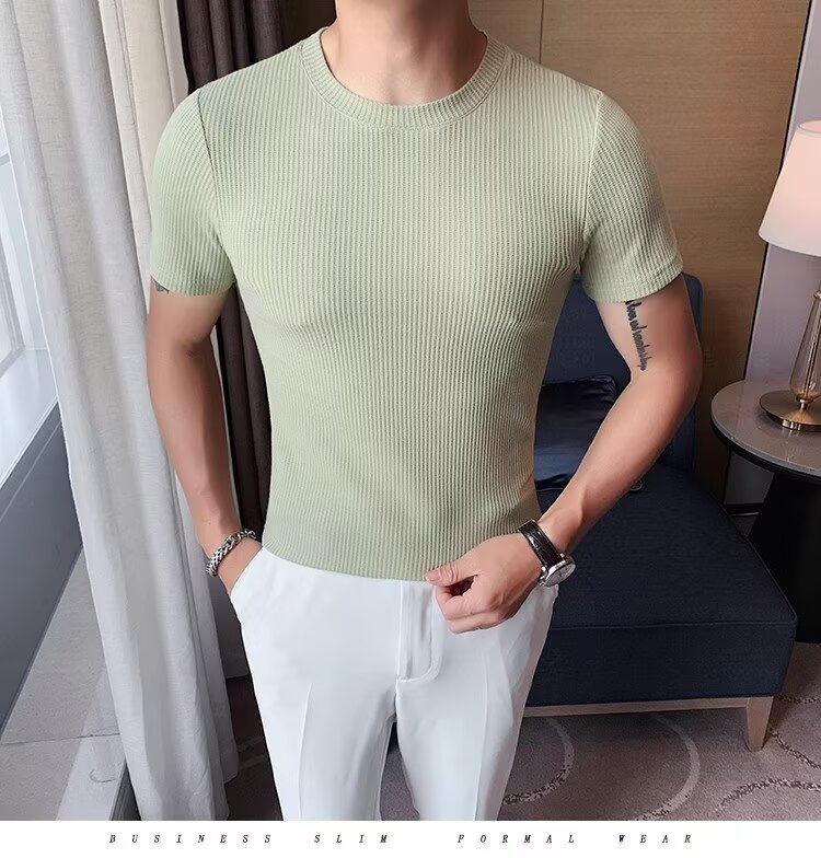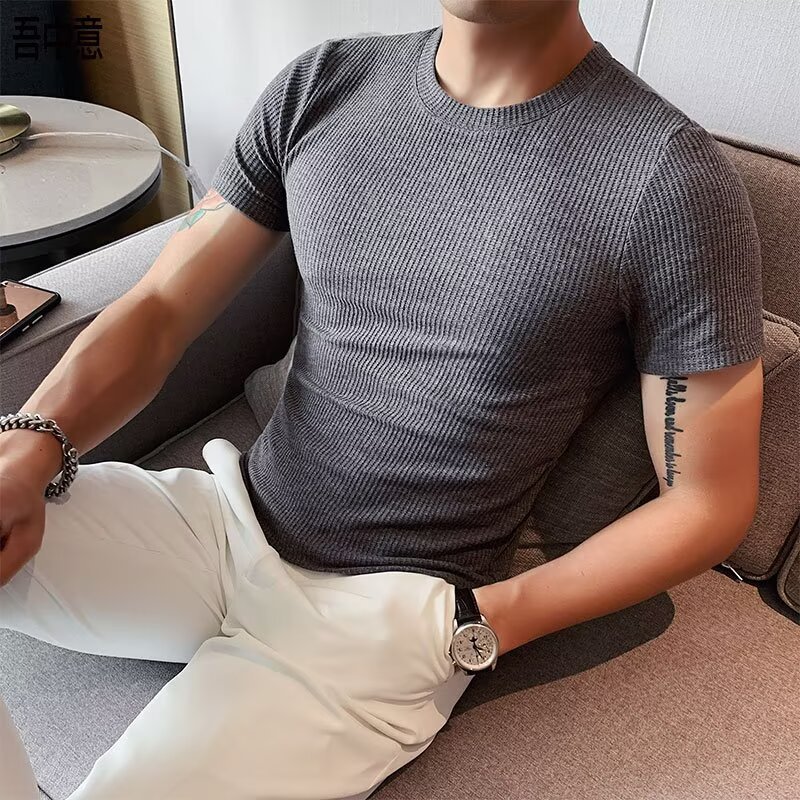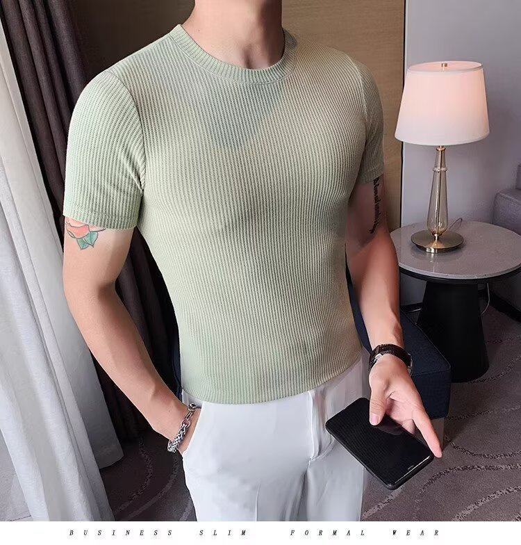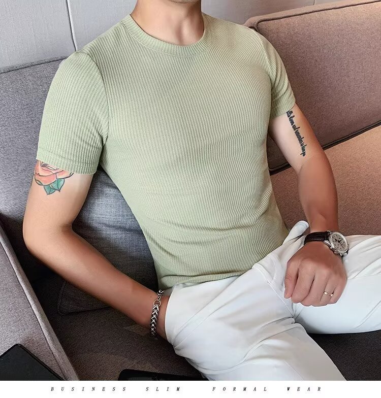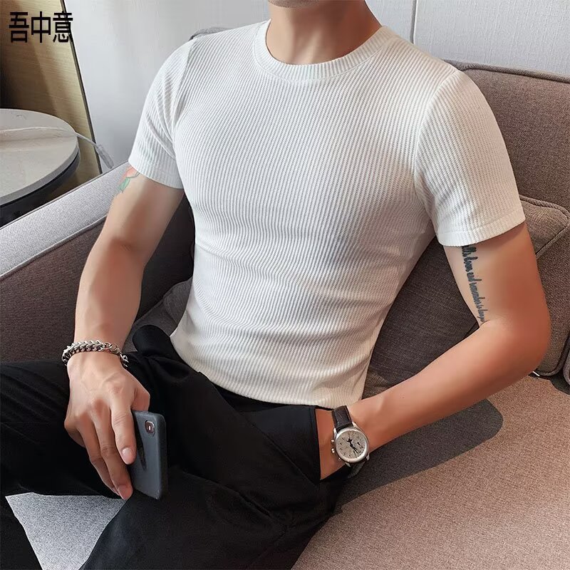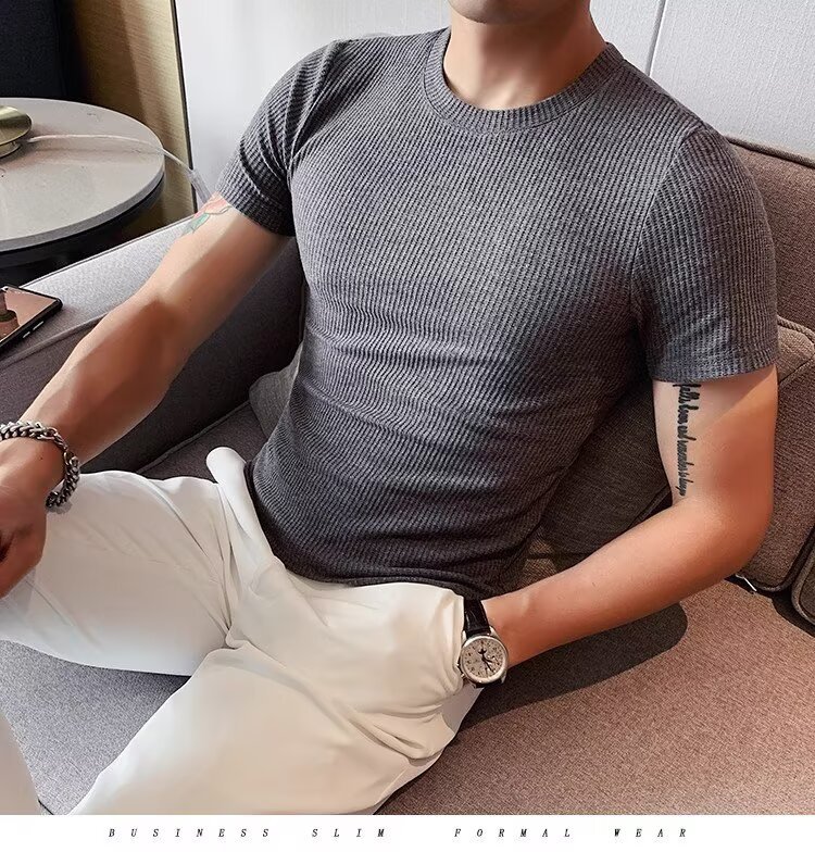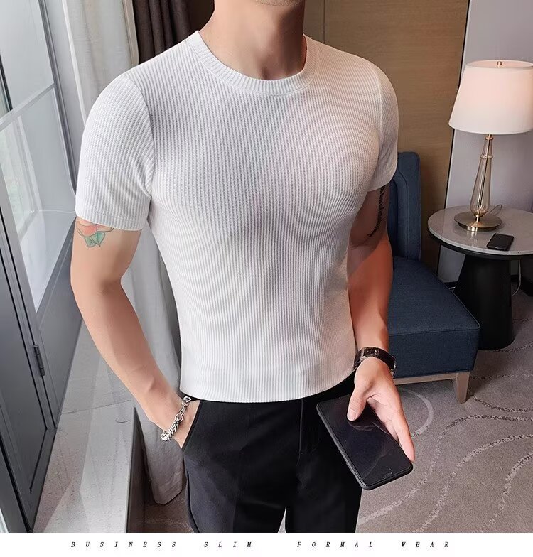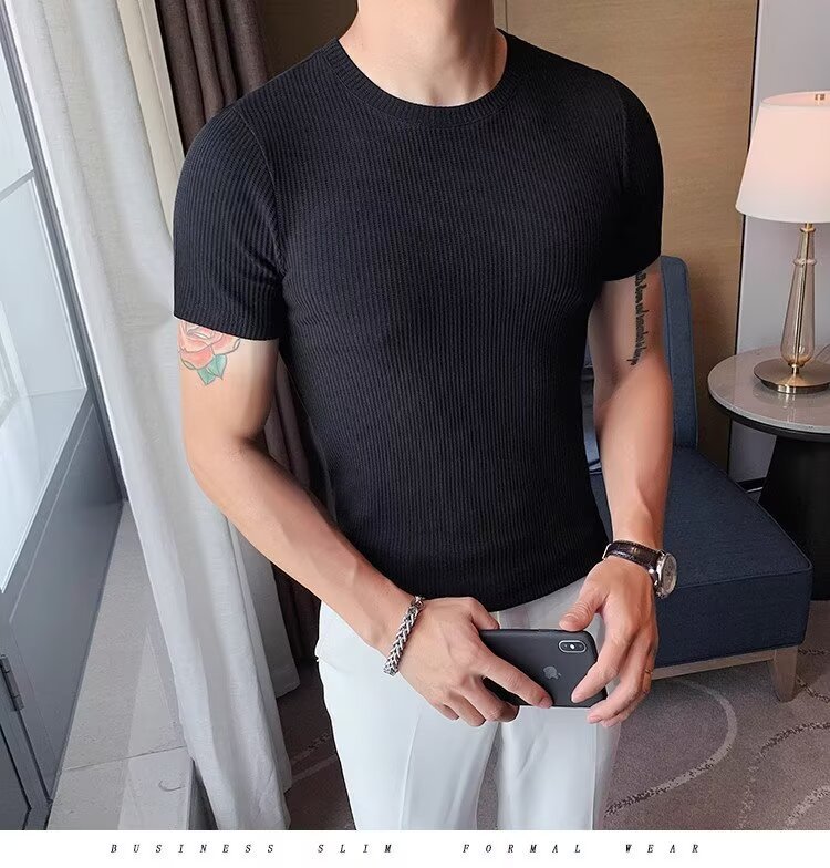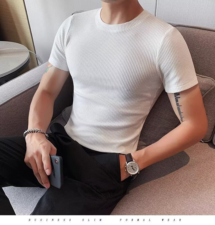 남자 반팔 티셔츠 여름 스트레치 슬림 핏 캐주얼 스포츠 훈련 모든 경기 고급 줄무늬 크루 넥베이스 셔츠