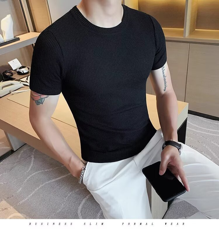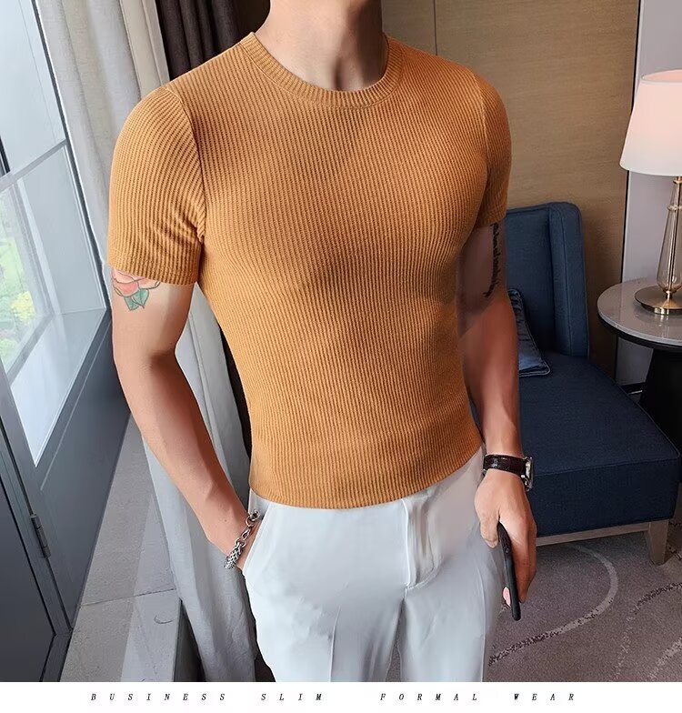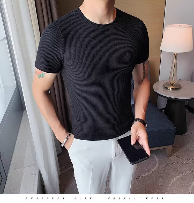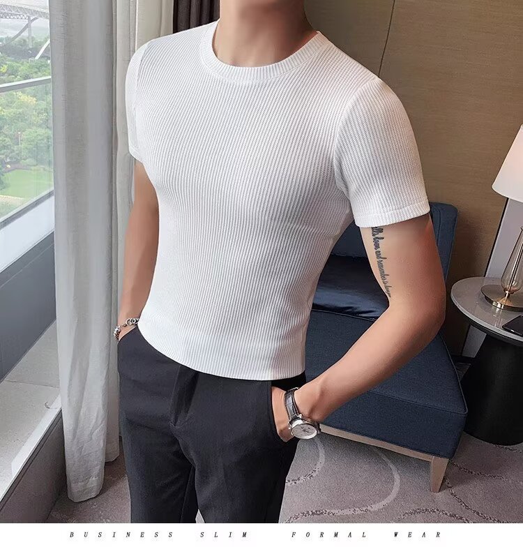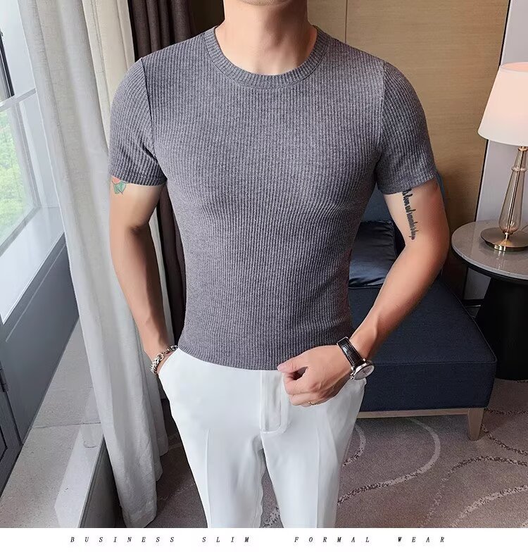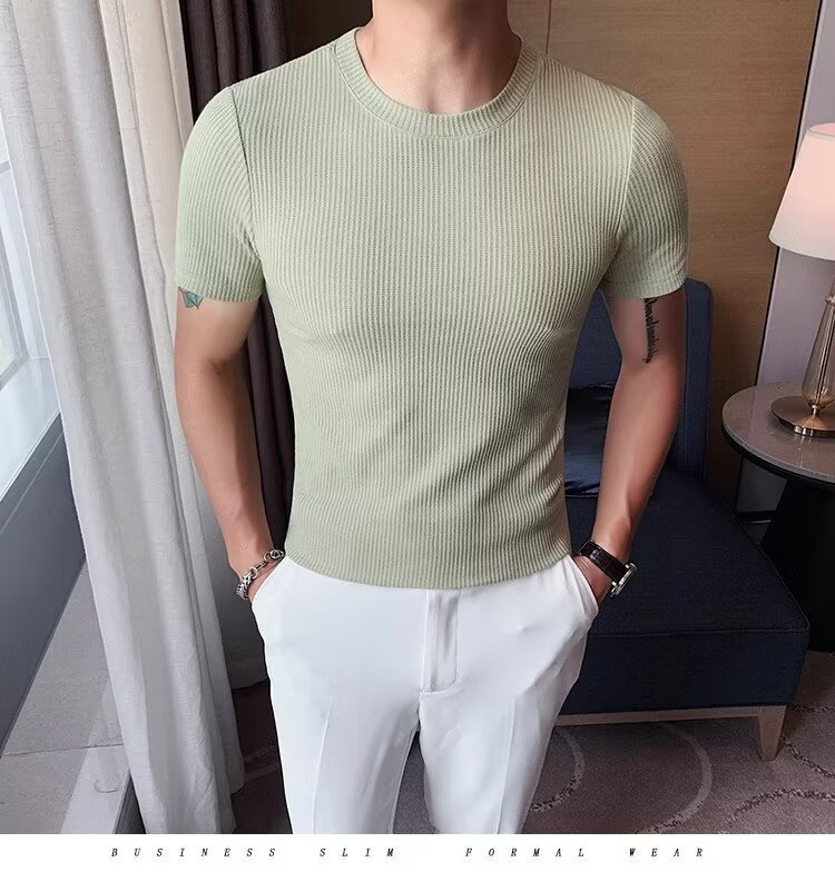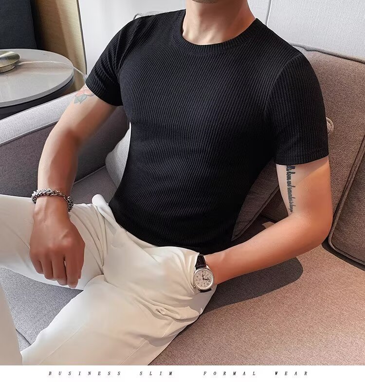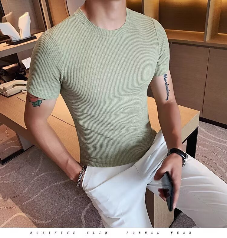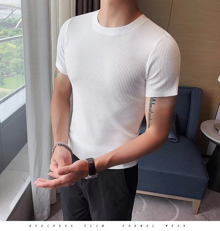 남자 반팔 티셔츠 여름 스트레치 슬림 핏 캐주얼 스포츠 훈련 모든 경기 고급 줄무늬 크루 넥베이스 셔츠