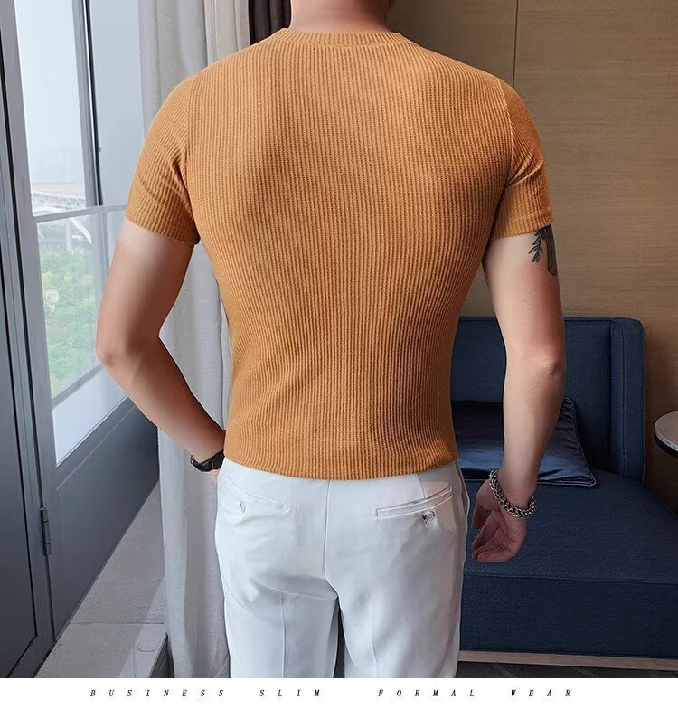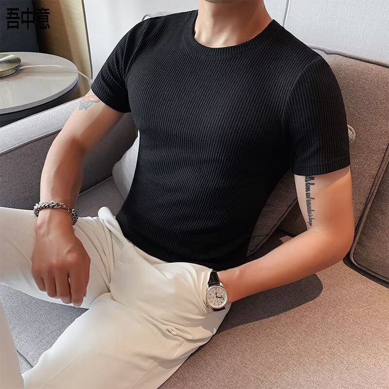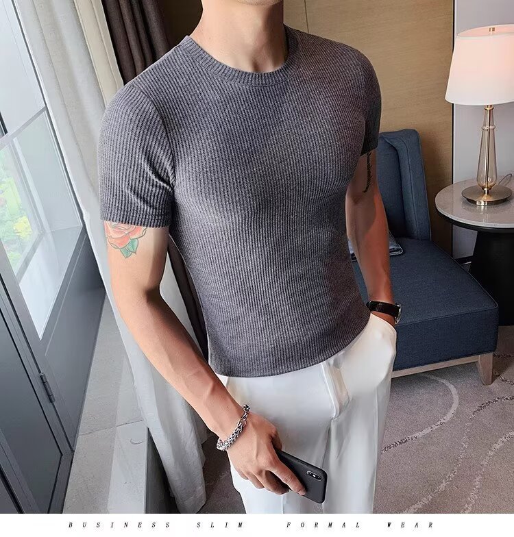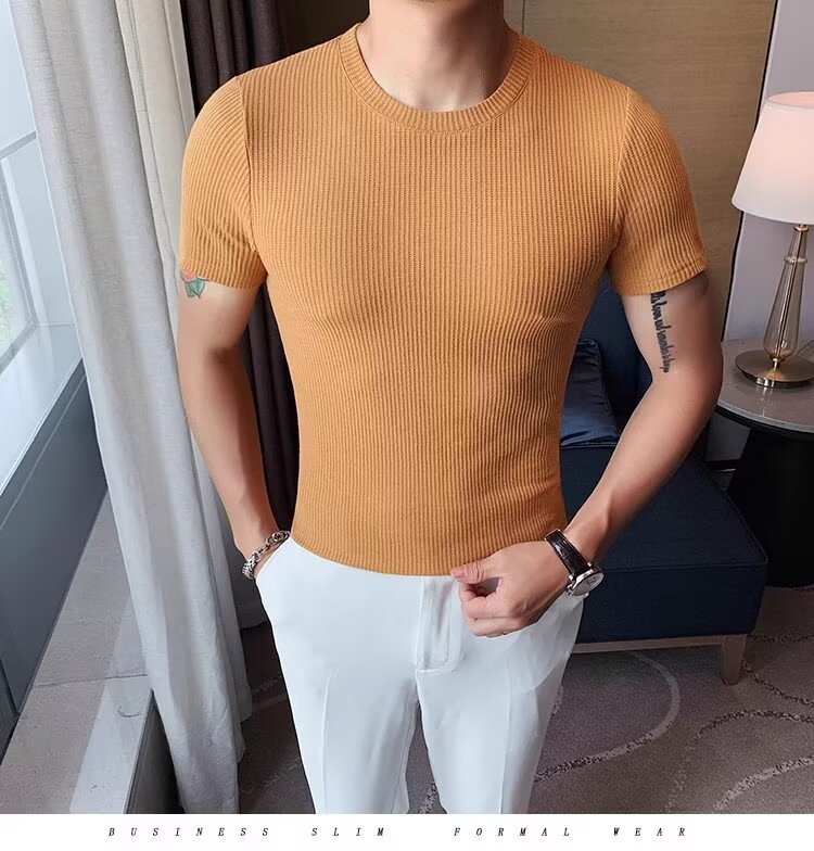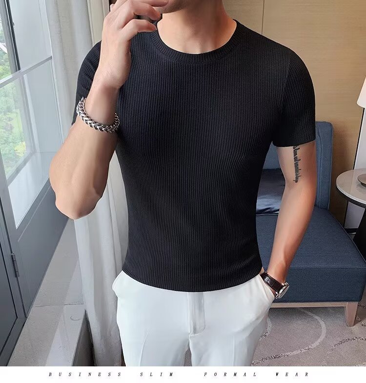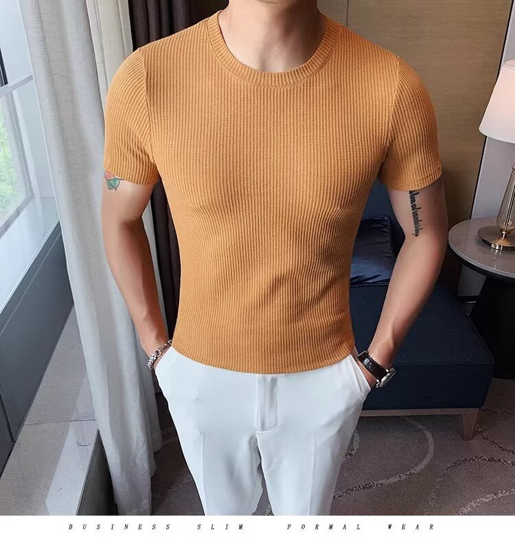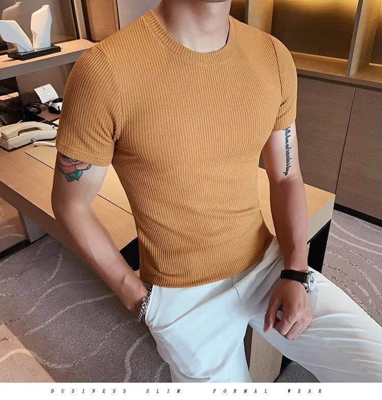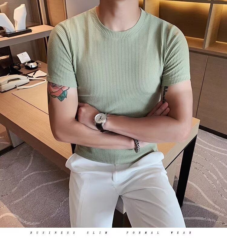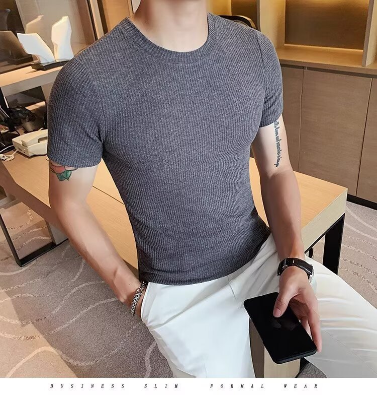 남자 반팔 티셔츠 여름 스트레치 슬림 핏 캐주얼 스포츠 훈련 모든 경기 고급 줄무늬 크루 넥베이스 셔츠
