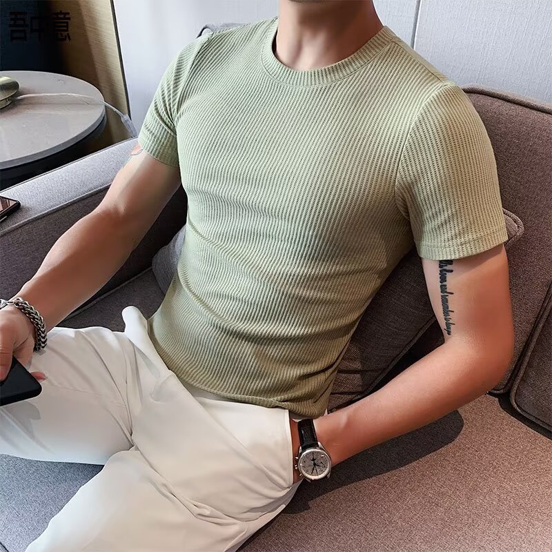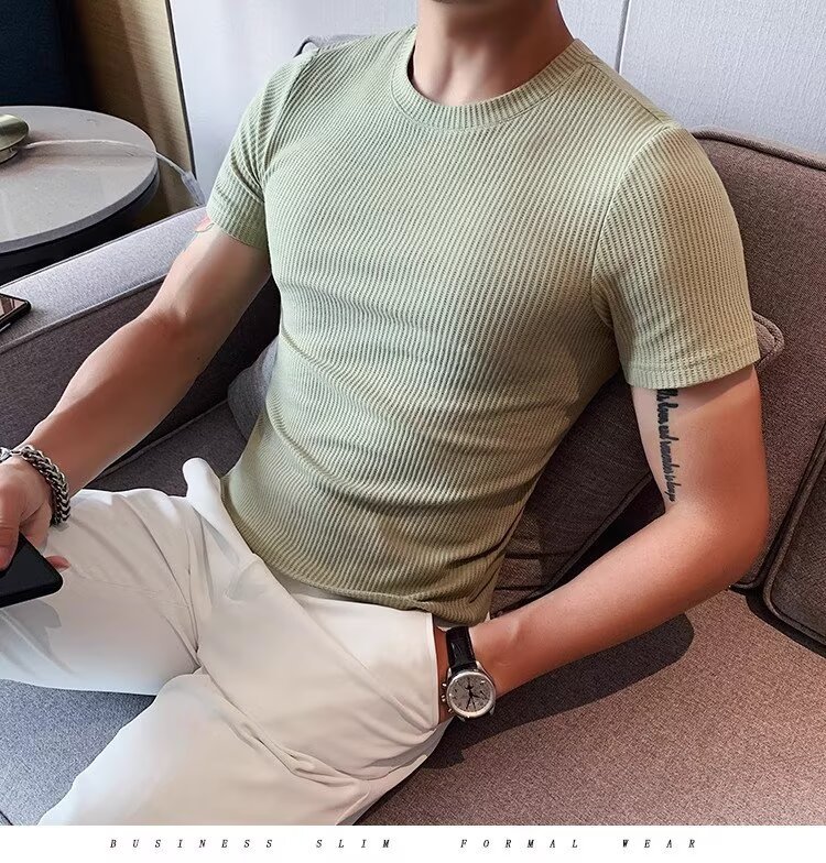 남자 반팔 티셔츠 여름 스트레치 슬림 핏 캐주얼 스포츠 훈련 모든 경기 고급 줄무늬 크루 넥베이스 셔츠스토어 가기