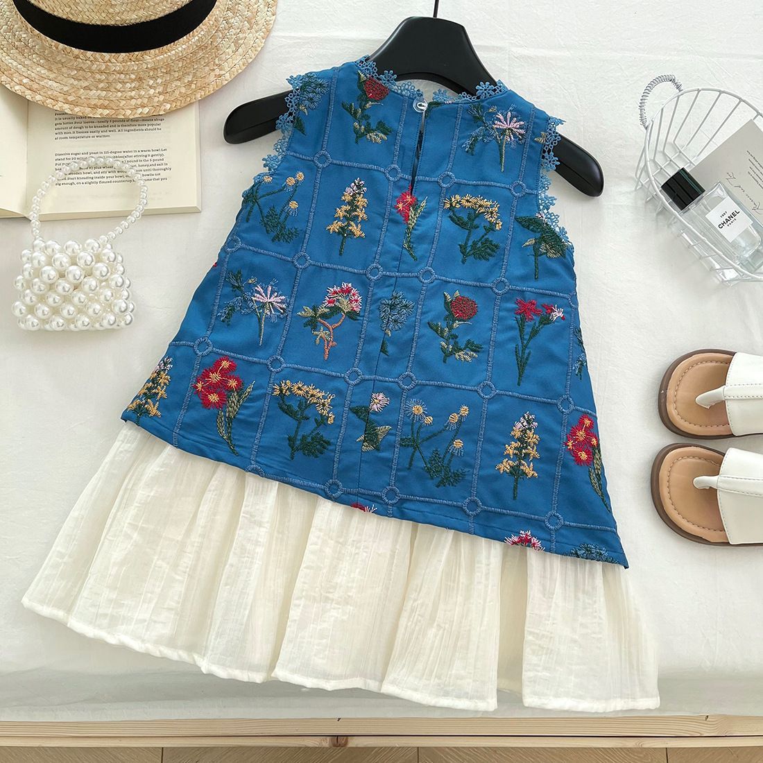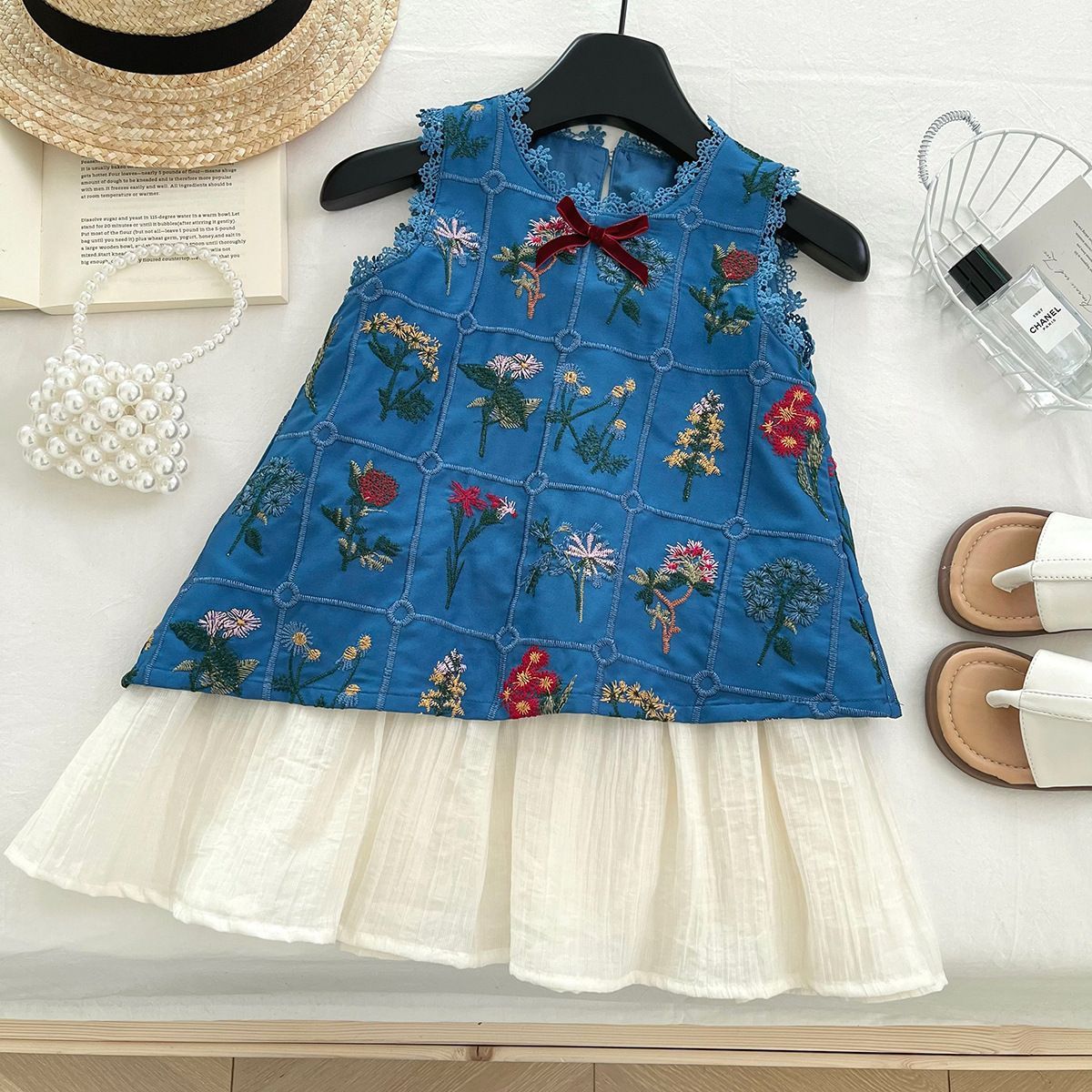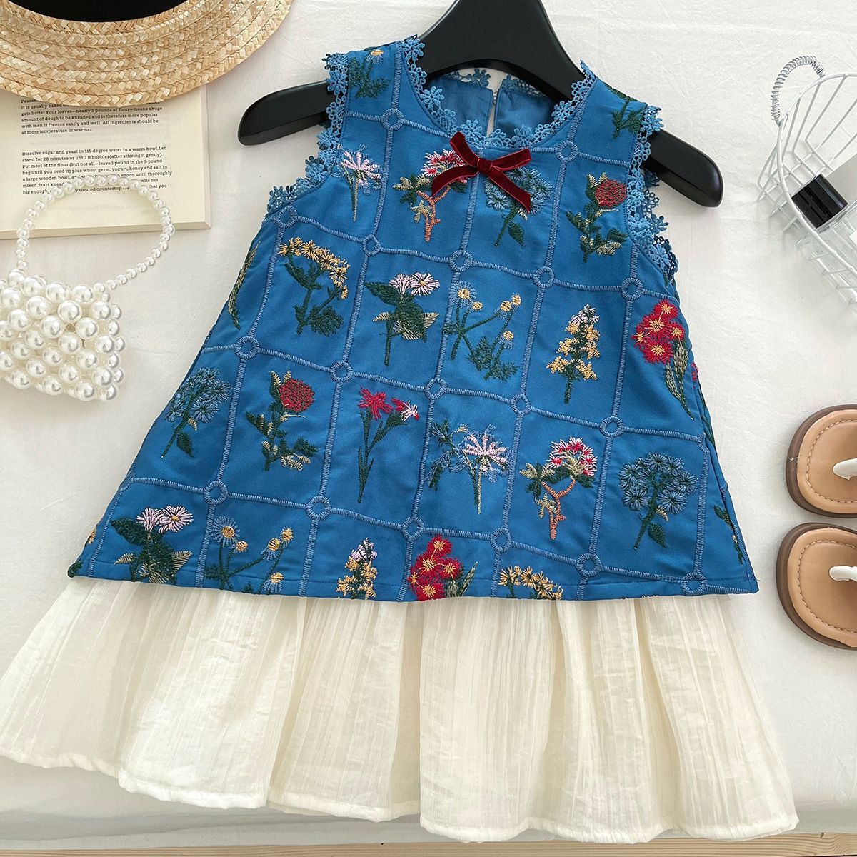 새로운 2025 소녀의 여름 자수 조끼 귀여운 민소매 타이트 허리 원피스 디자인 폭발적인 복고풍 원피스스토어 가기