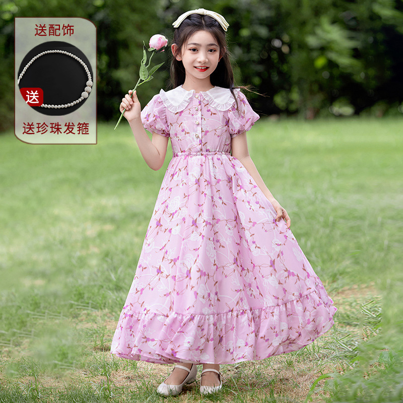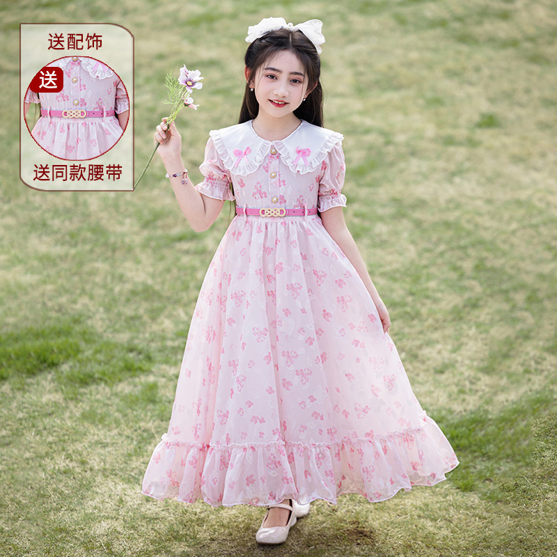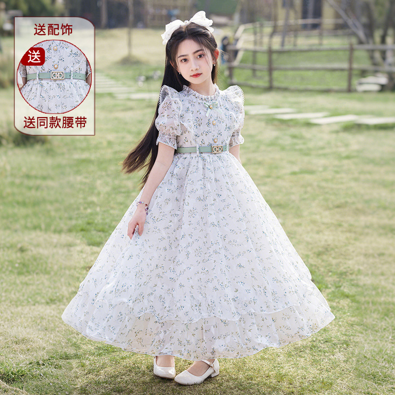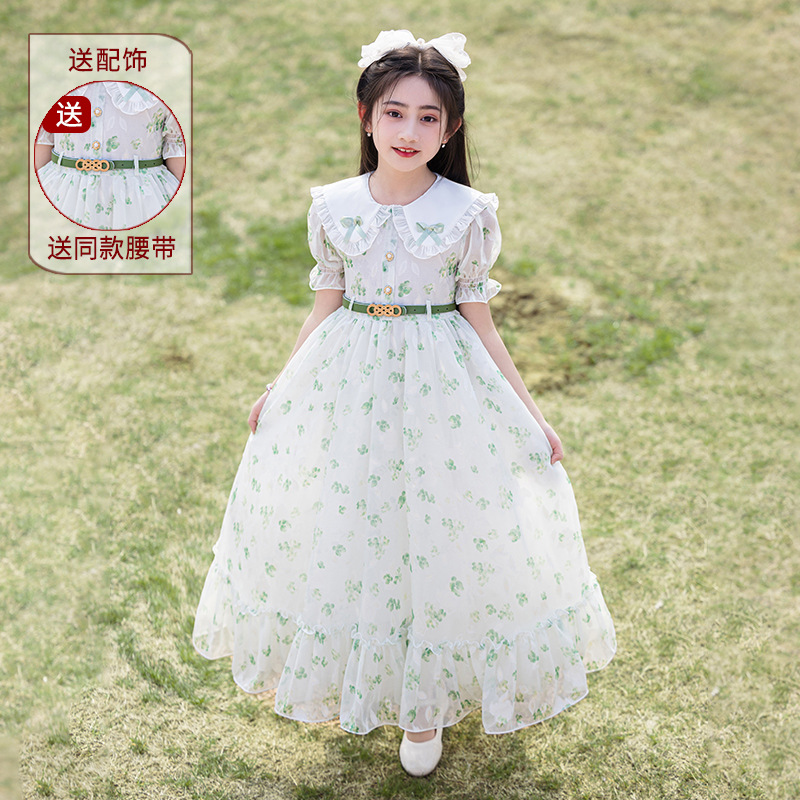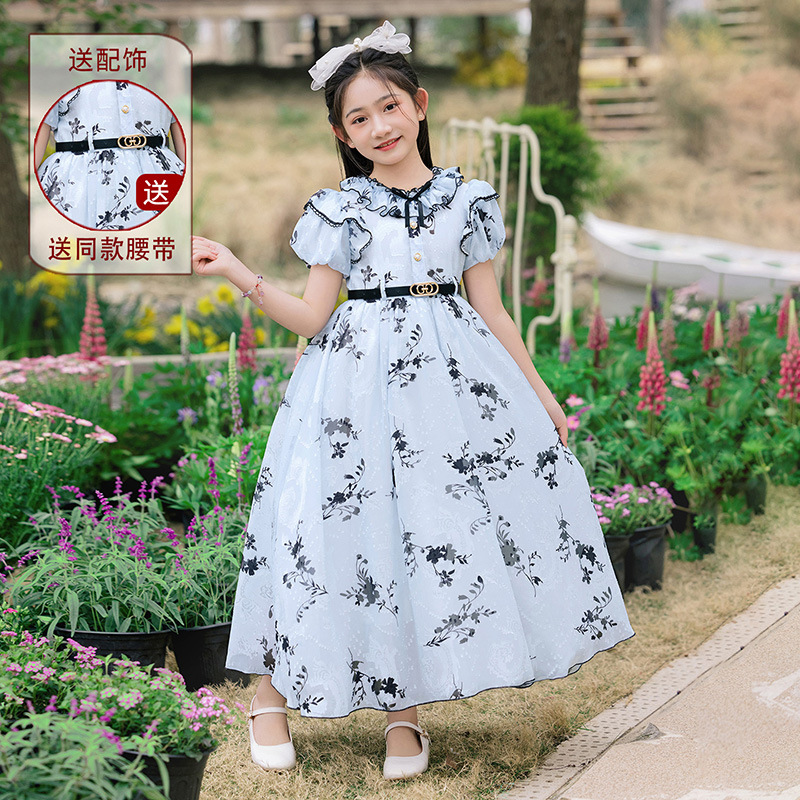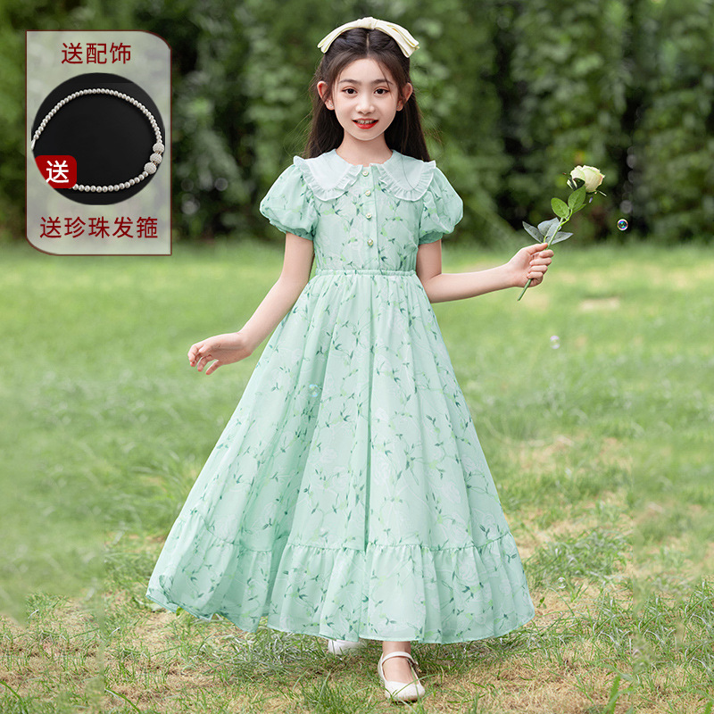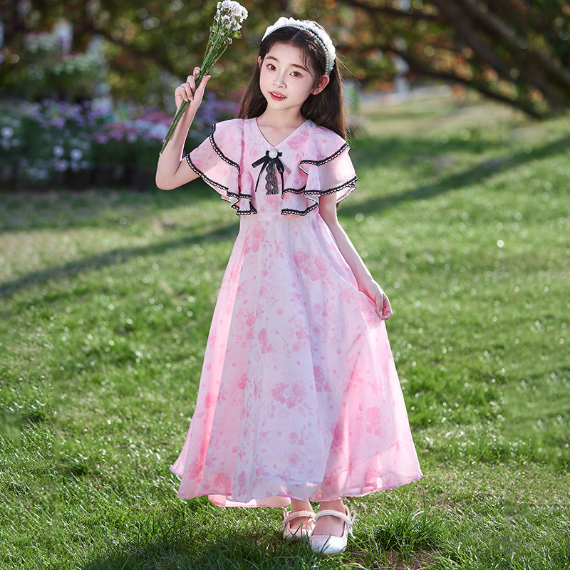 소녀 원피스 큰 어린이 쉬폰 원피스 2025 새로운 한국식 서양식 짧은 소매 공주 원피스 어린이 공연 원피스스토어 가기
